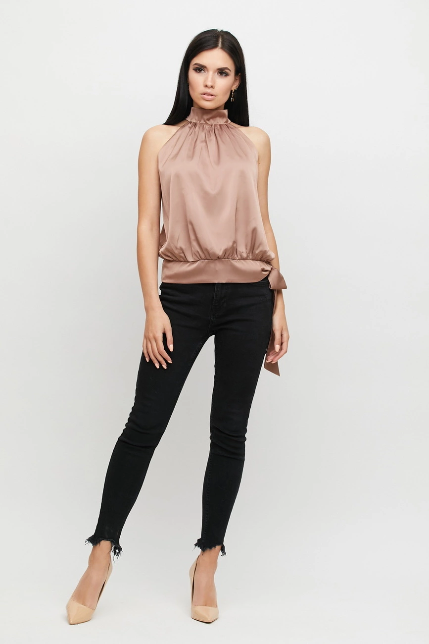 Блуза из легкой струящейся ткани прямого кроя с американской проймой, воротник-стойка; застежка: пуговицы сзади