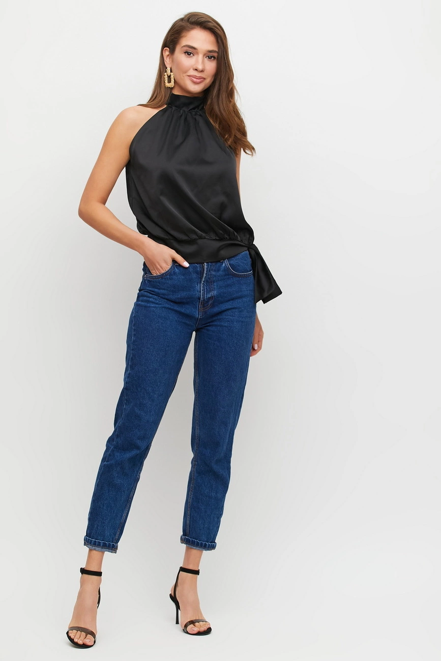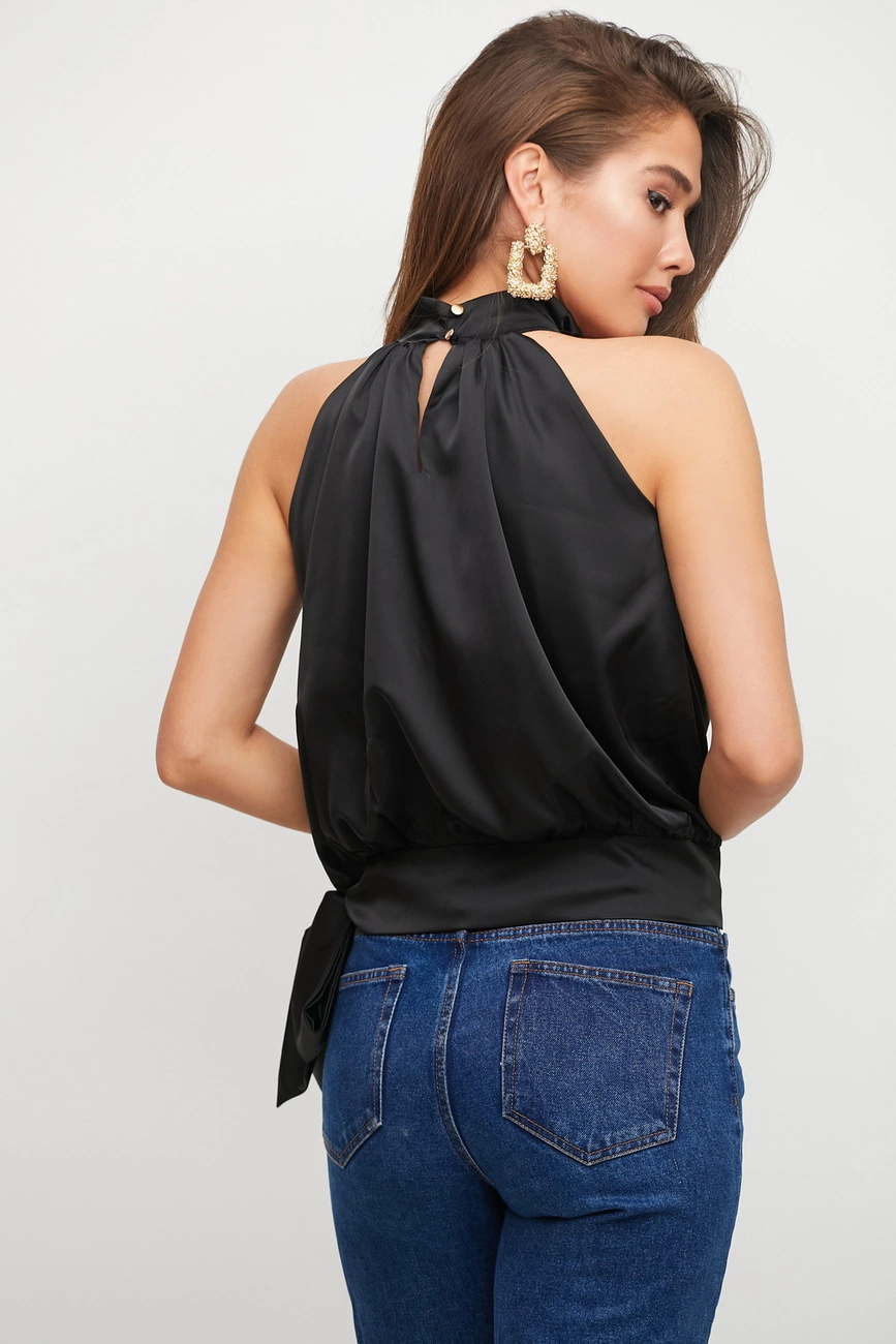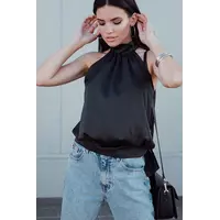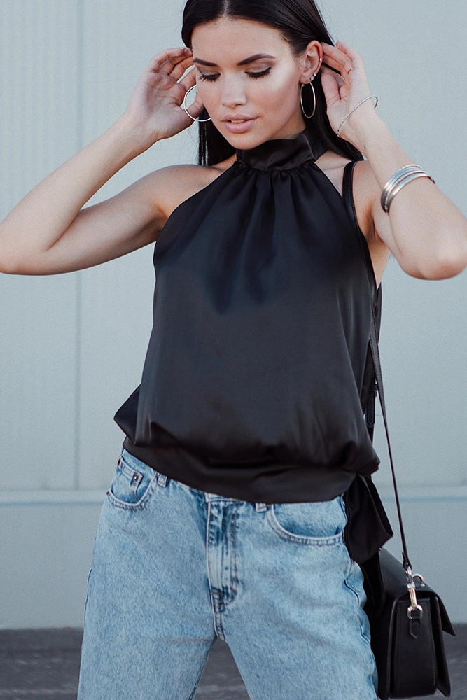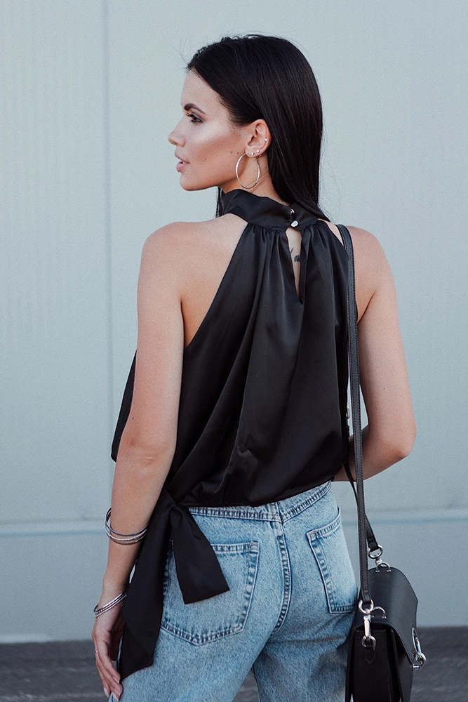 Блуза из легкой струящейся ткани прямого кроя с американской проймой, воротник-стойка; застежка: пуговицы сзади