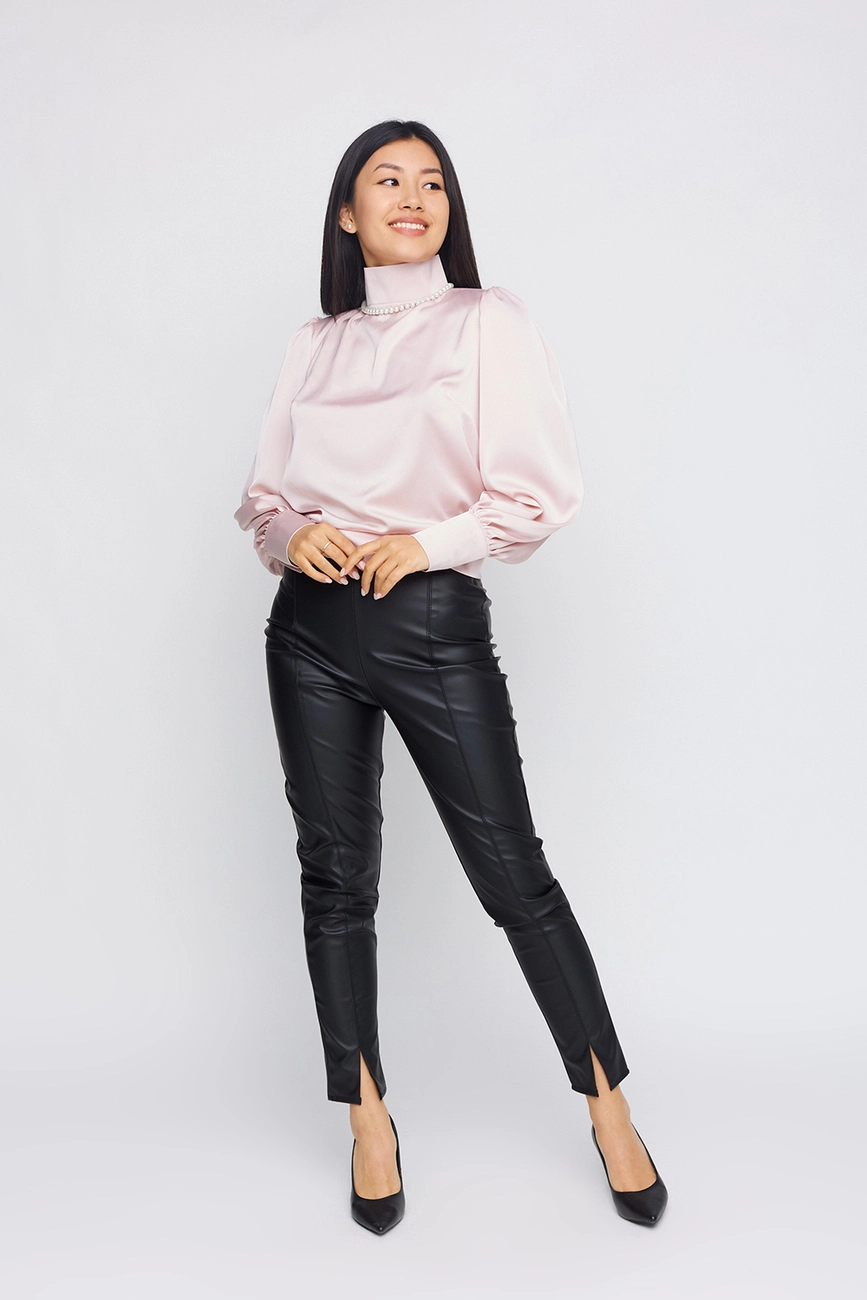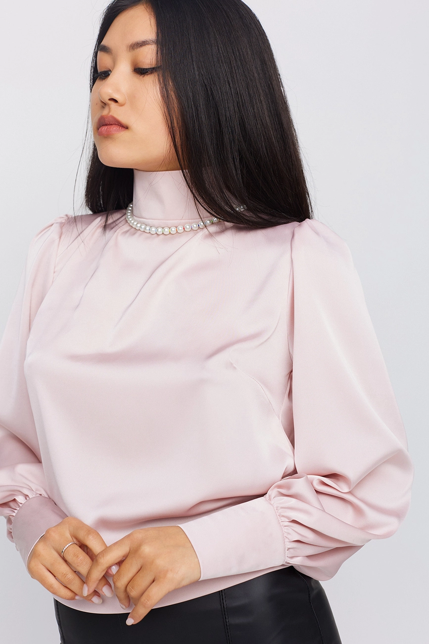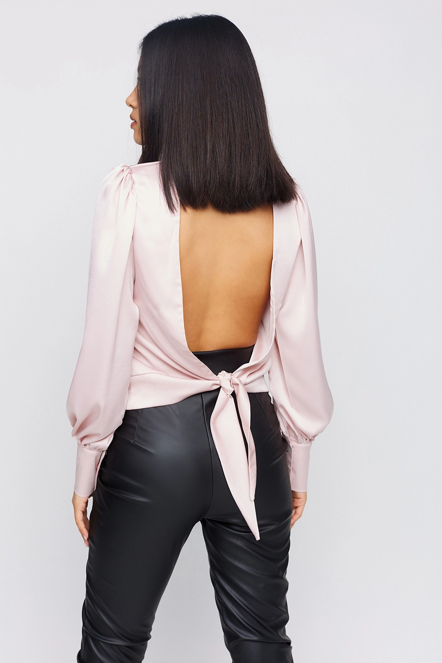 Блуза из шёлка с открытой спиной; воротник - стойка; широкие манжеты; застежка- пуговицы, на поясе завязка.