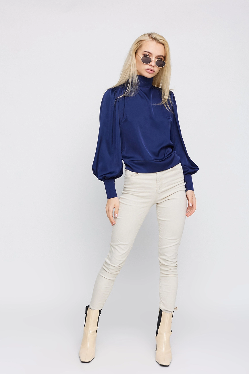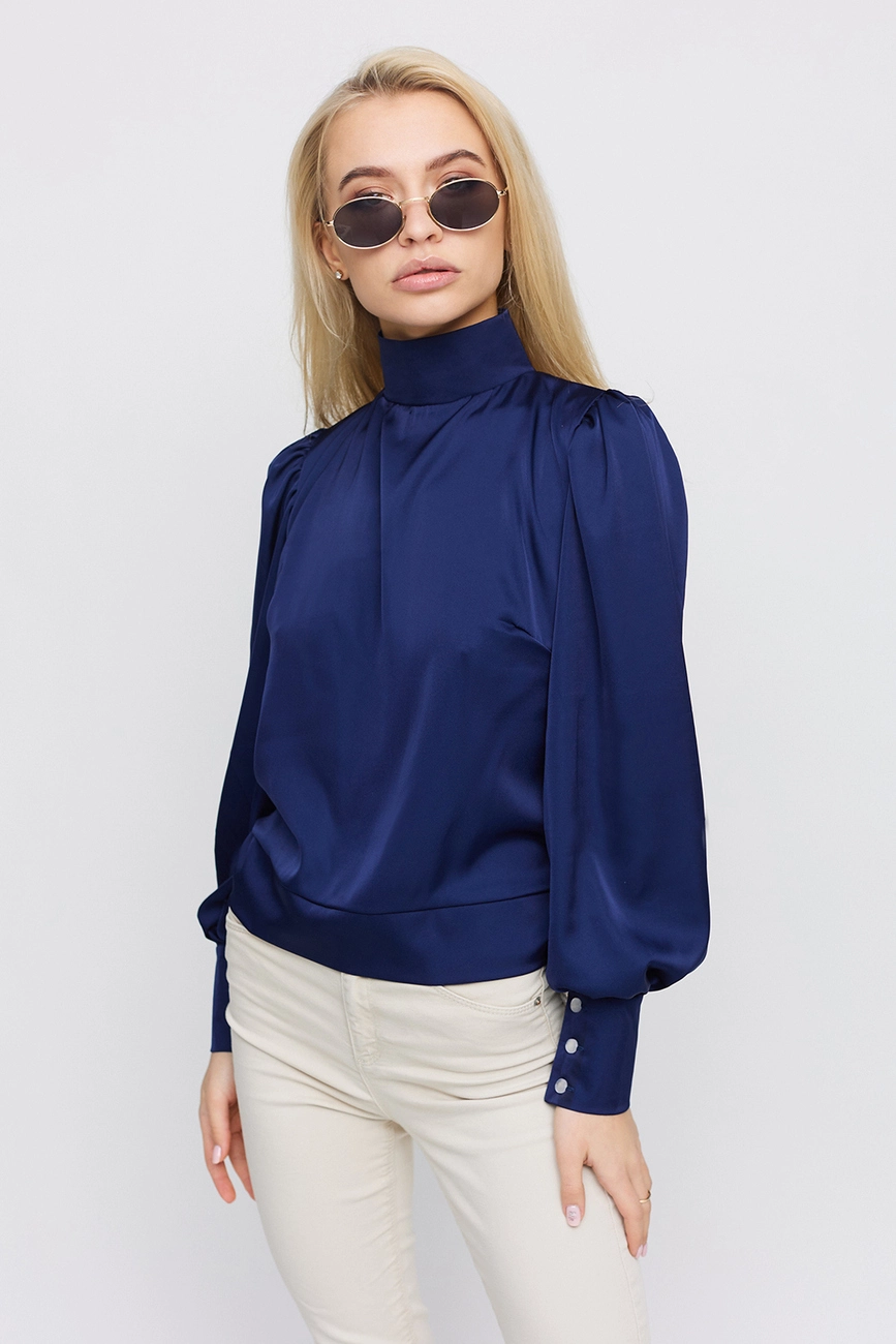 Блуза из шёлка с открытой спиной; воротник - стойка; широкие манжеты; застежка- пуговицы, на поясе завязка.