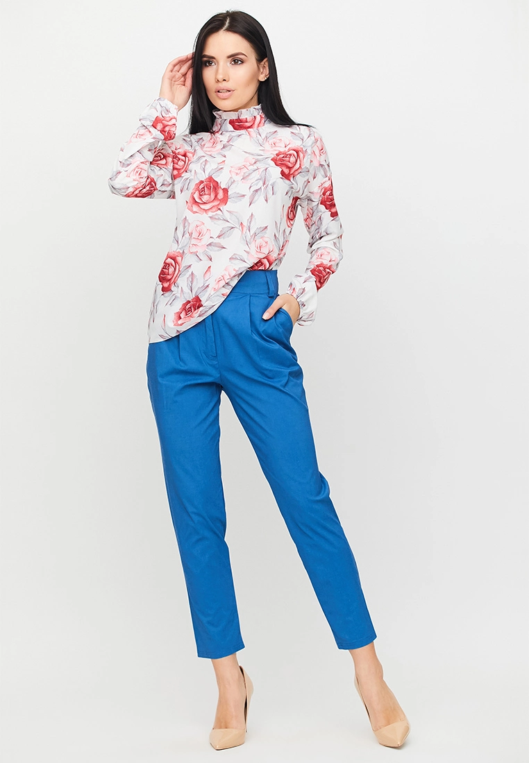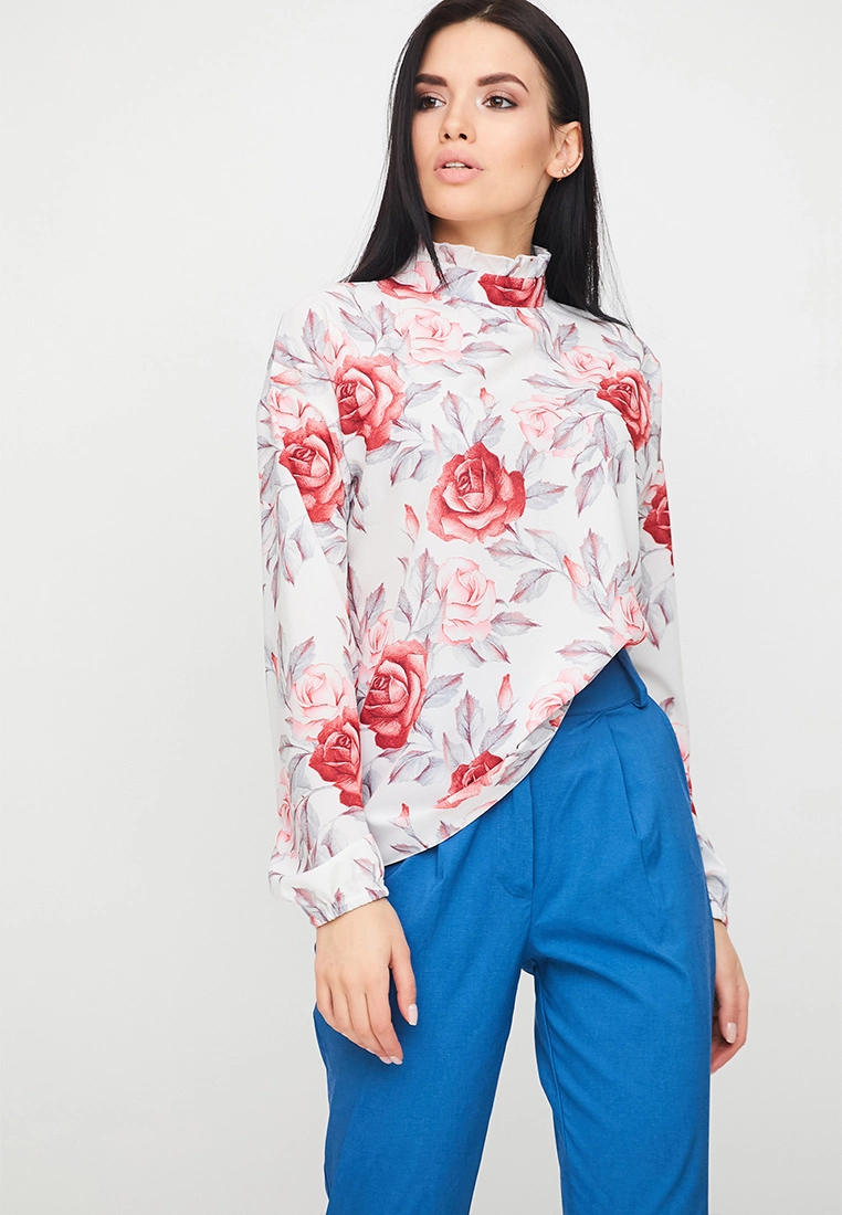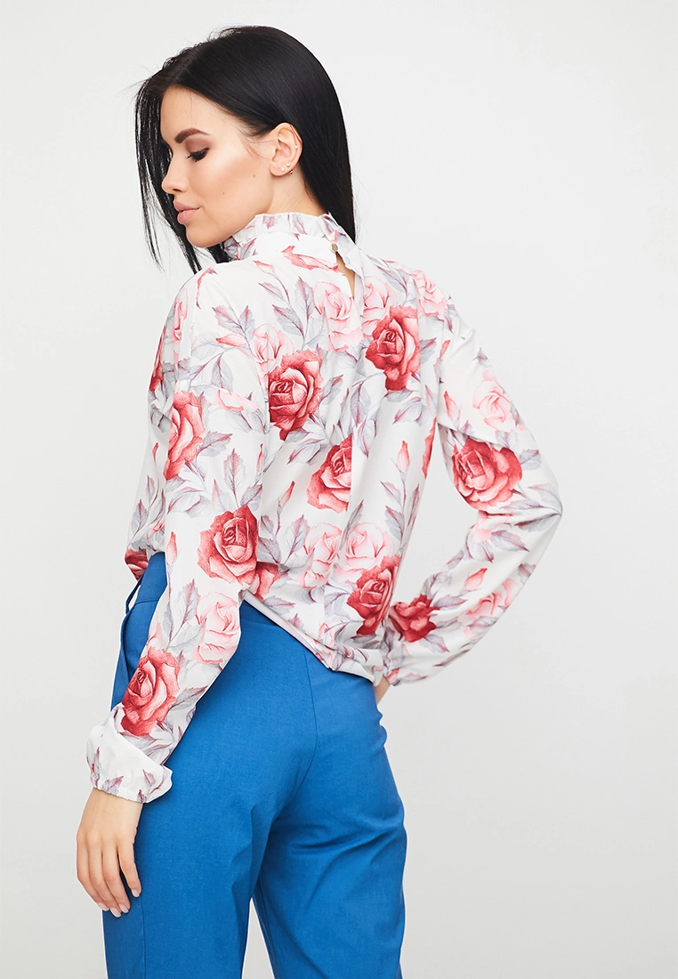 Блуза свободного кроя из легкой летней ткани, спущенная линия плеча, широкий рукав с резинками на запястьях, невысокий воротник-стойка декорирован оборкой, сзади – вырез капелька; застежка: пуговица.