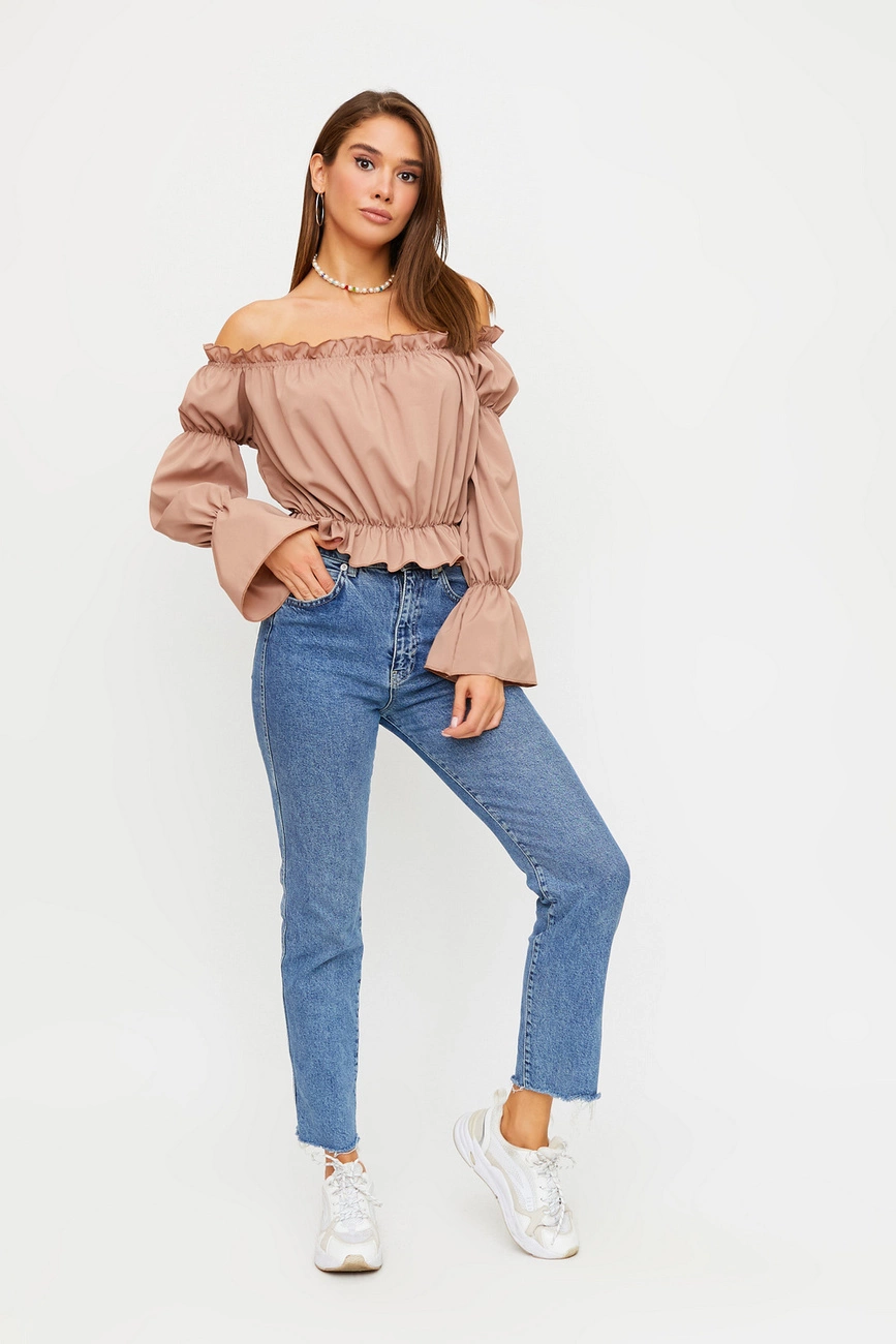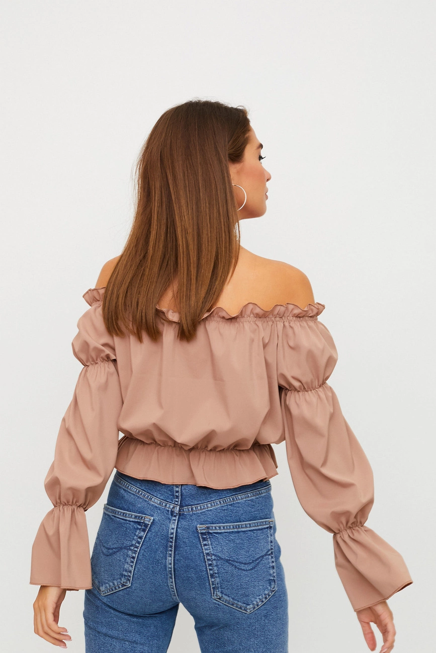 Блуза с открытыми плечами укороченного кроя из легкой струящейся ткани, фигурные рукава, по верху и низу блузы сборка