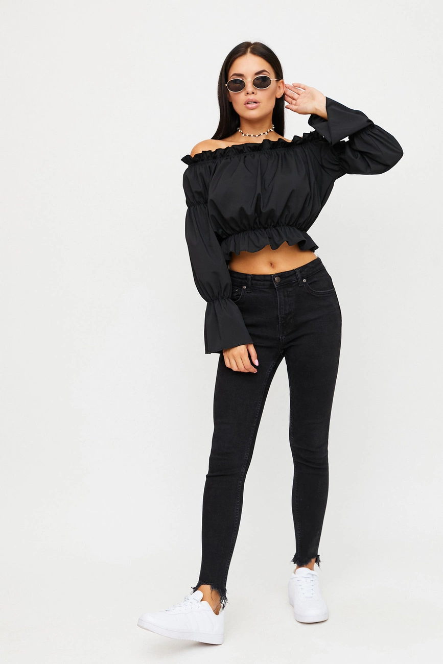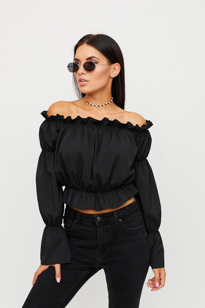 Блуза с открытыми плечами укороченного кроя из легкой струящейся ткани, фигурные рукава, по верху и низу блузы сборка