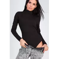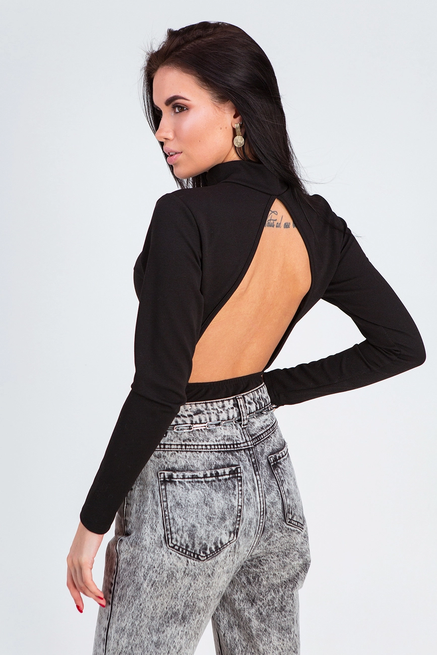 Боди с невысоким воротником-стойкой и вырезом на спине из эластичного фактурного материала; высокая линия бедра; застежка: кнопки