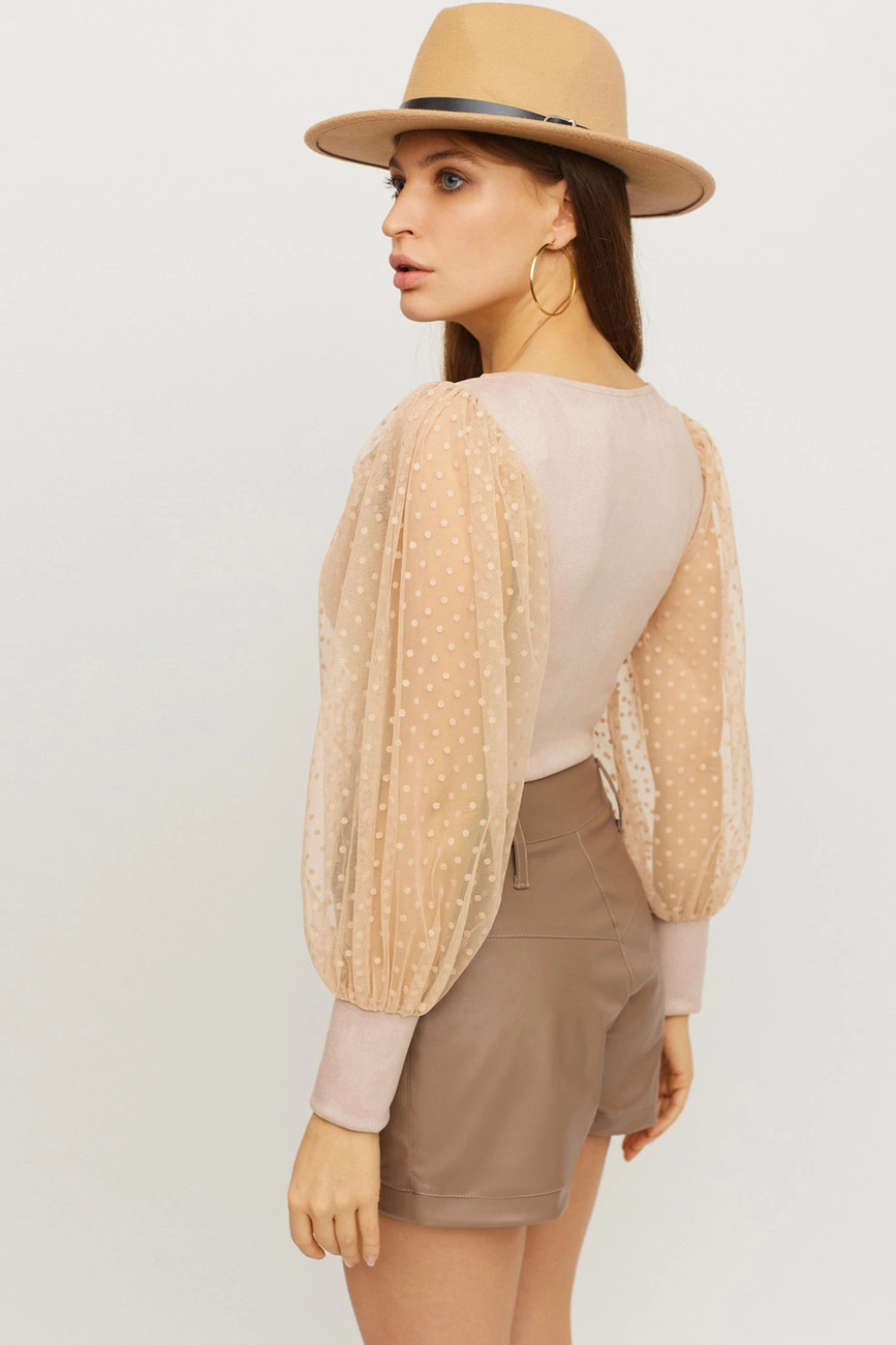 Боди из эластичного эко-замша; объемный рукав с манжетом; застежка: кнопки