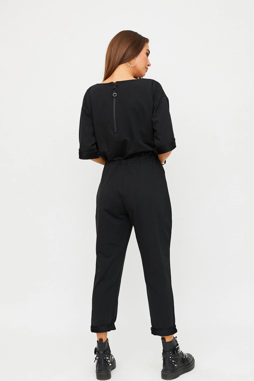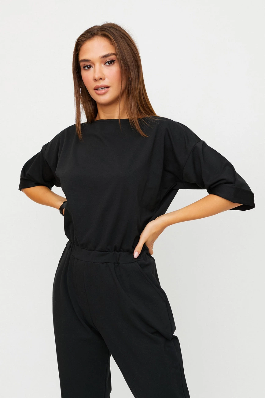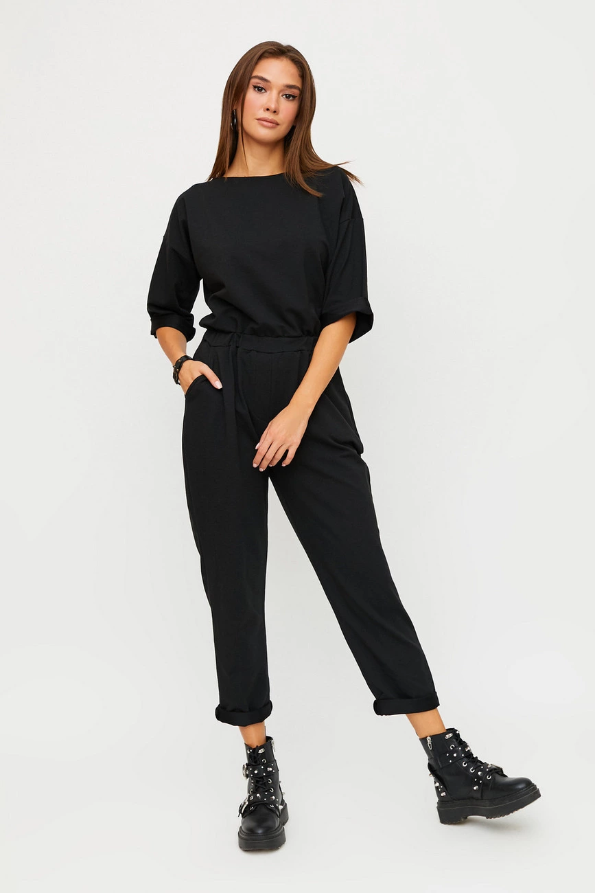 Длинный комбинезон из слегка тянущегося трикотажа; верх свободный, спущенная линия плеча, широкий укороченный рукав (под подворот), вырез-лодочка, сзади застегивается на молнию; брюки свободные в бедрах и заужены к низу; пояс на резинке