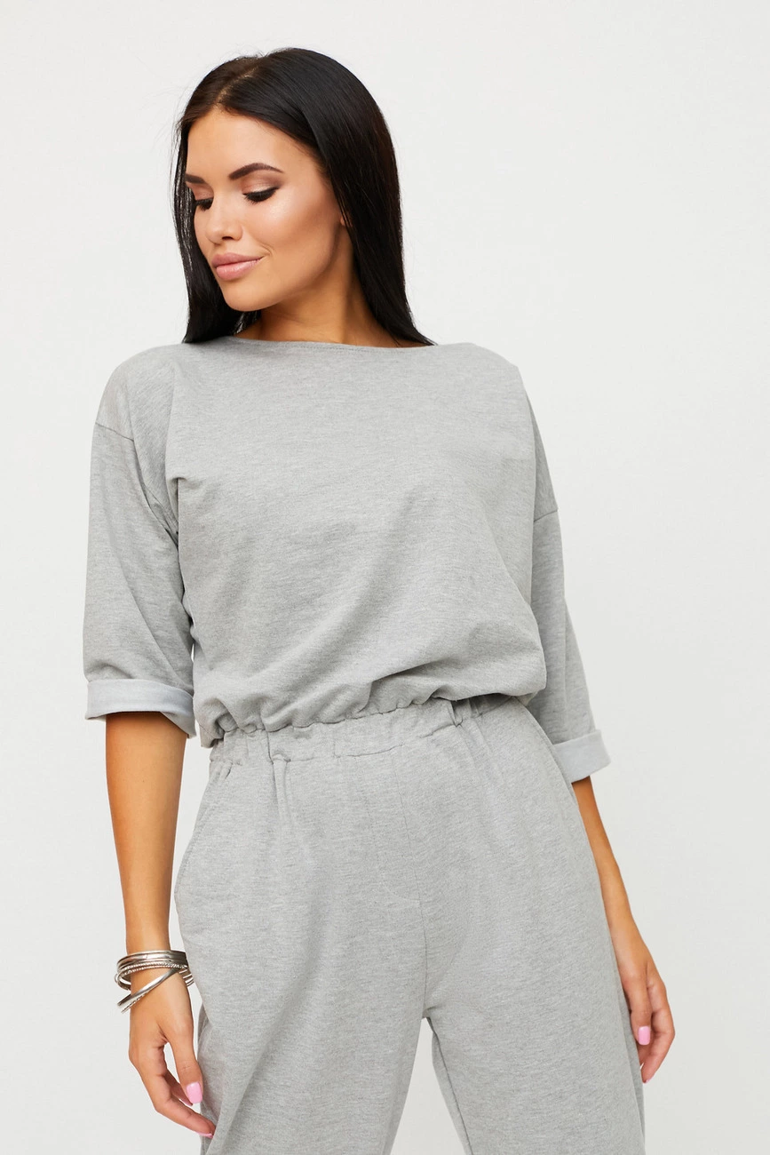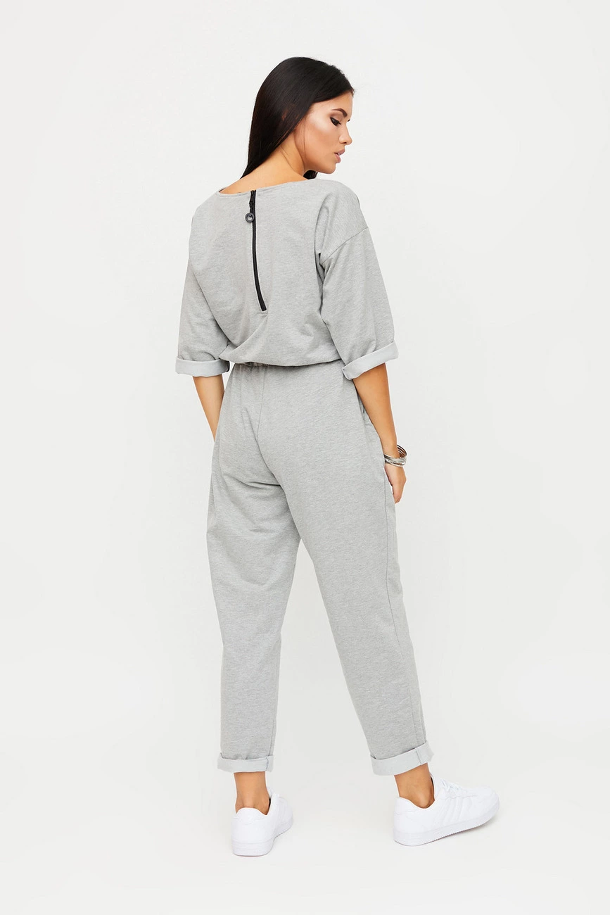 Длинный комбинезон из слегка тянущегося трикотажа; верх свободный, спущенная линия плеча, широкий укороченный рукав (под подворот), вырез-лодочка, сзади застегивается на молнию; брюки свободные в бедрах и заужены к низу; пояс на резинке