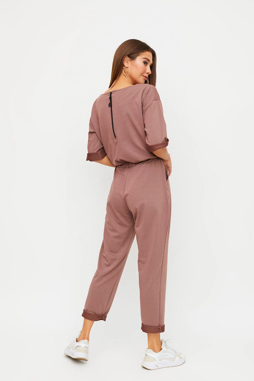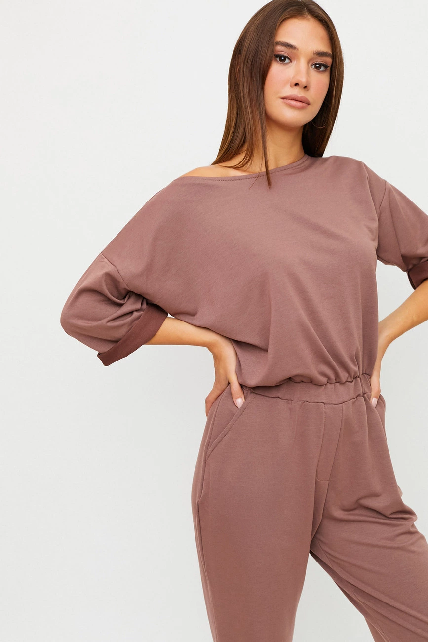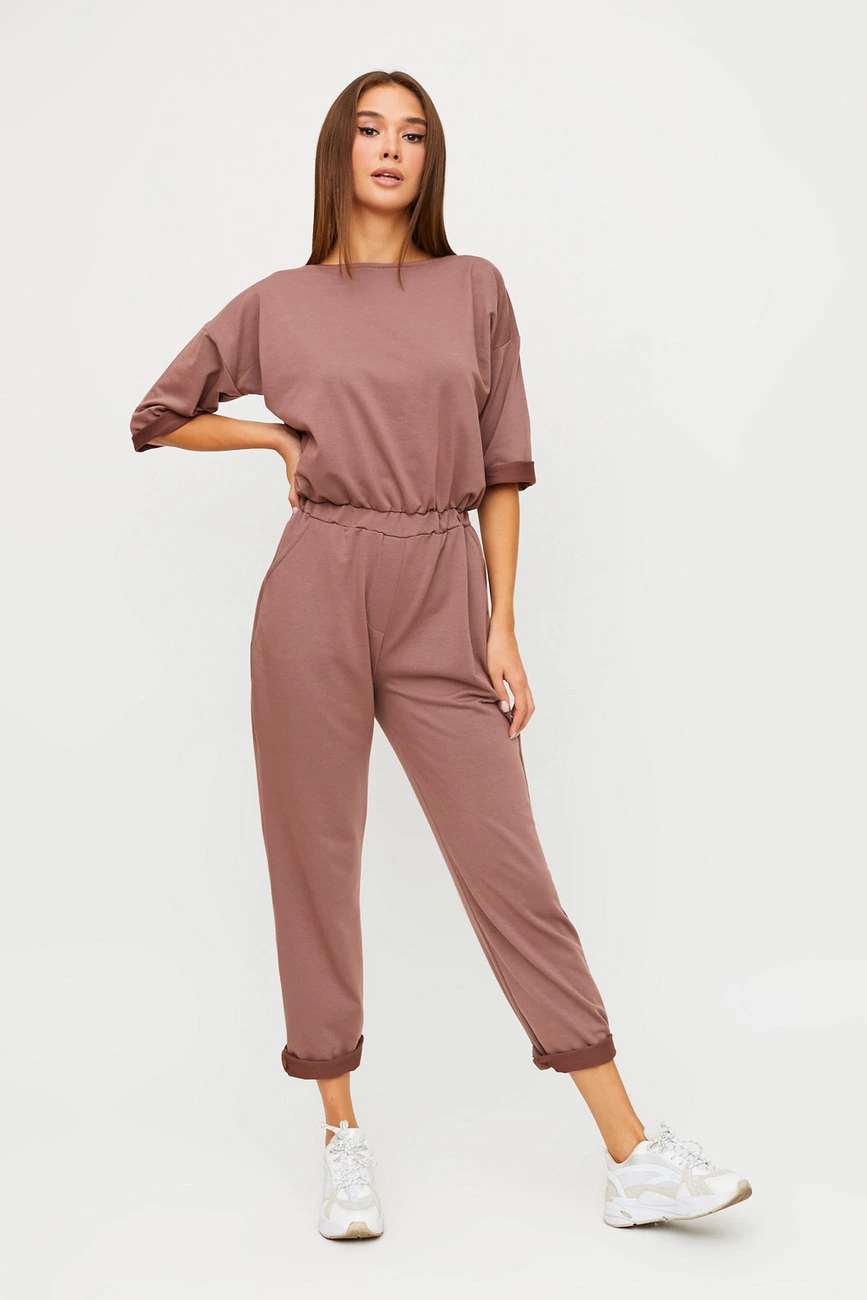 Длинный комбинезон из слегка тянущегося трикотажа; верх свободный, спущенная линия плеча, широкий укороченный рукав (под подворот), вырез-лодочка, сзади застегивается на молнию; брюки свободные в бедрах и заужены к низу; пояс на резинке
