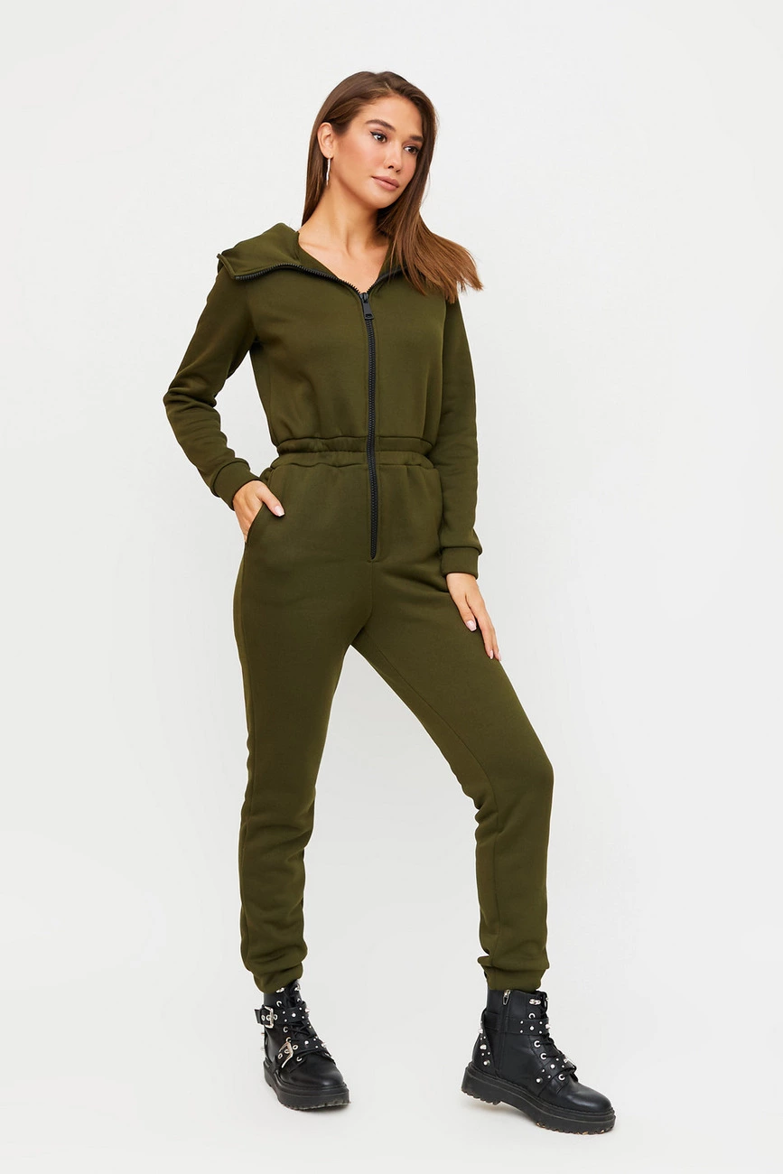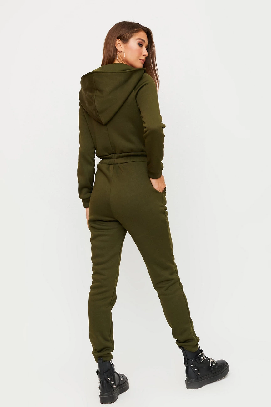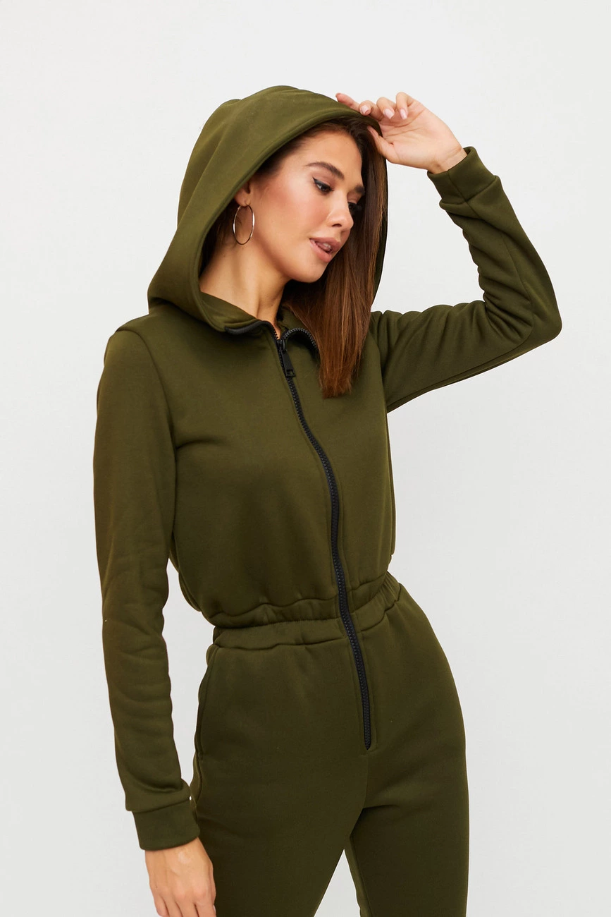 Длинный комбинезон с капюшоном из слегка тянущегося плотного трикотажа на флисе; на талии пояс-резинка; карманы в боковых швах. Застежка: черная молния впереди