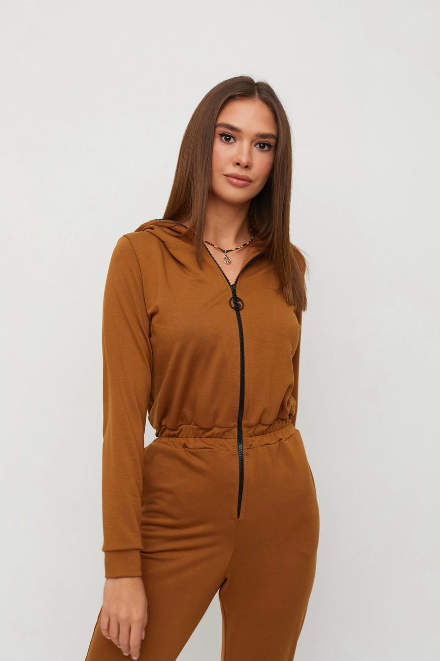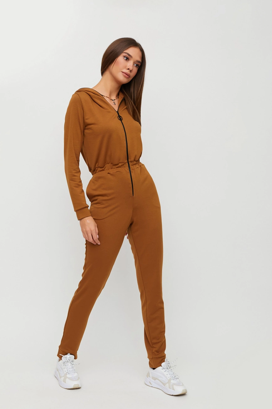 Длинный комбинезон с капюшоном из слегка тянущегося трикотажа; на талии пояс-резинка; карманы в боковых швах. Застежка: черная молния впереди