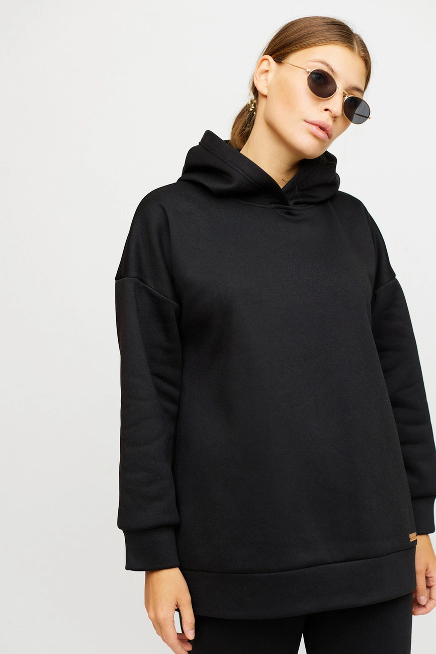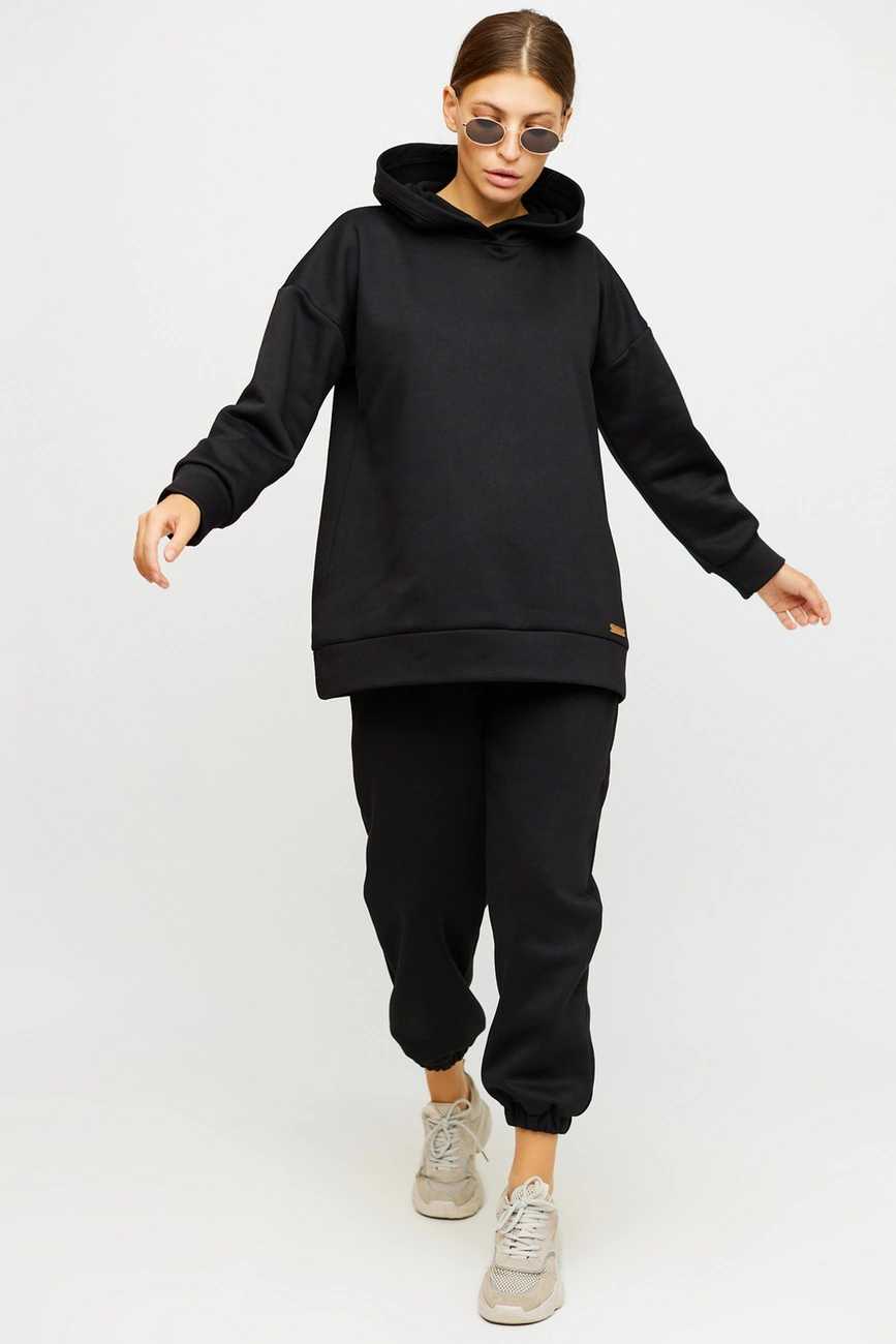 Костюм свитшот oversize плюс брюки из тянущегося плотного трикотажа с флисовым начесом внутри. Свитшот свободного кроя со спущенной линией плеча, есть капюшон; штаны прямого кроя с высокой посадкой, манжеты на резинке, в боковых швах карманы
