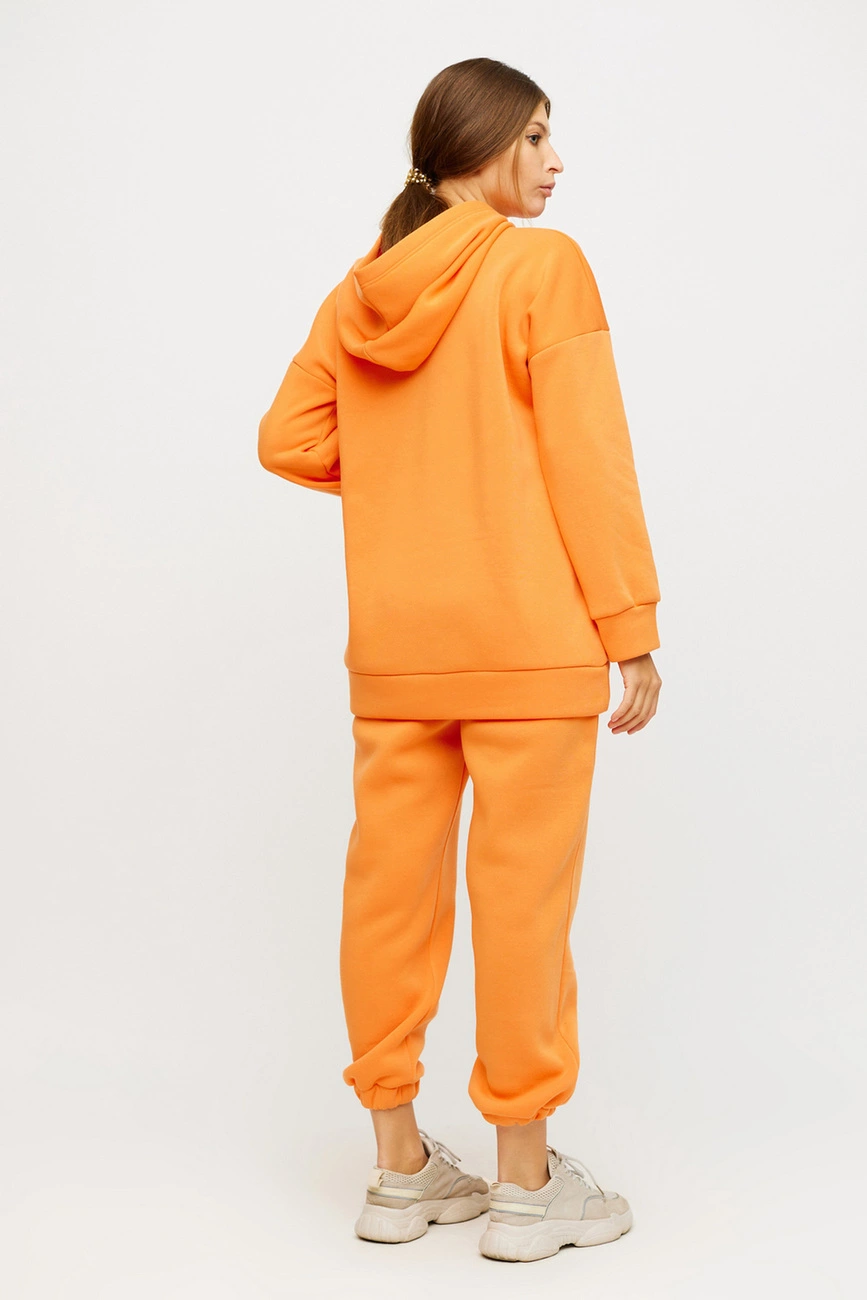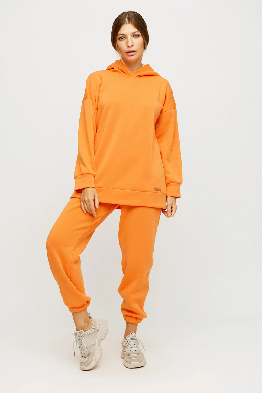 Костюм свитшот oversize плюс брюки из тянущегося плотного трикотажа с флисовым начесом внутри. Свитшот свободного кроя со спущенной линией плеча, есть капюшон; штаны прямого кроя с высокой посадкой, манжеты на резинке, в боковых швах карманы