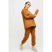 Костюм свитшот oversize плюс брюки из тянущегося плотного трикотажа с флисовым начесом внутри. Свитшот свободного кроя со спущенной линией плеча, есть капюшон; штаны прямого кроя с высокой посадкой, манжеты на резинке, в боковых швах карманы