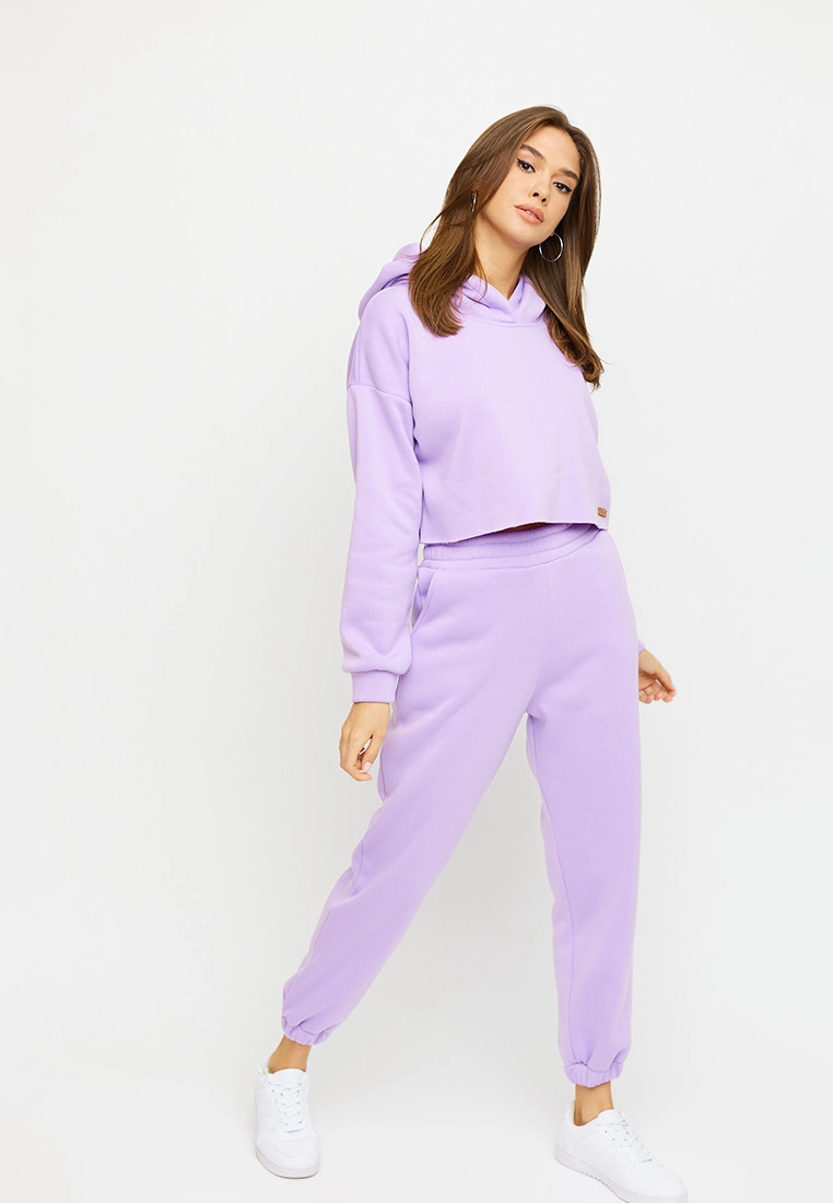 Костюм свитшот плюс брюки из тянущегося плотного трикотажа с флисовым начесом внутри. Свитшот укороченного кроя с капюшоном, спущенная линия плеча, рукав длинный ; штаны прямого кроя с высокой посадкой, манжеты на резинке, в боковых швах карманы