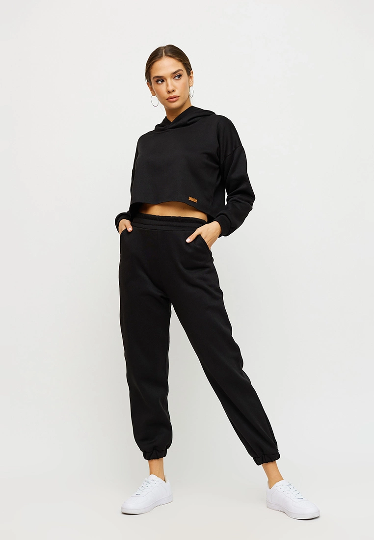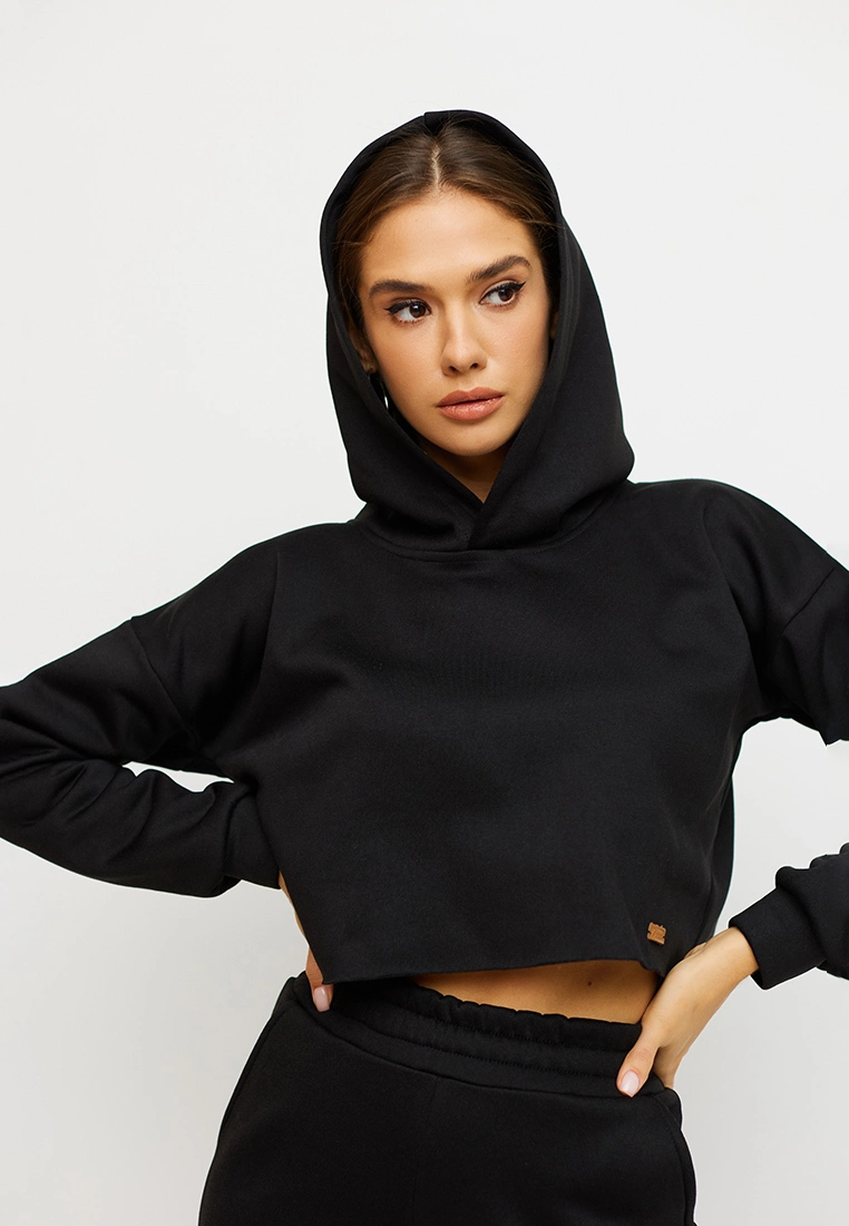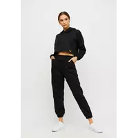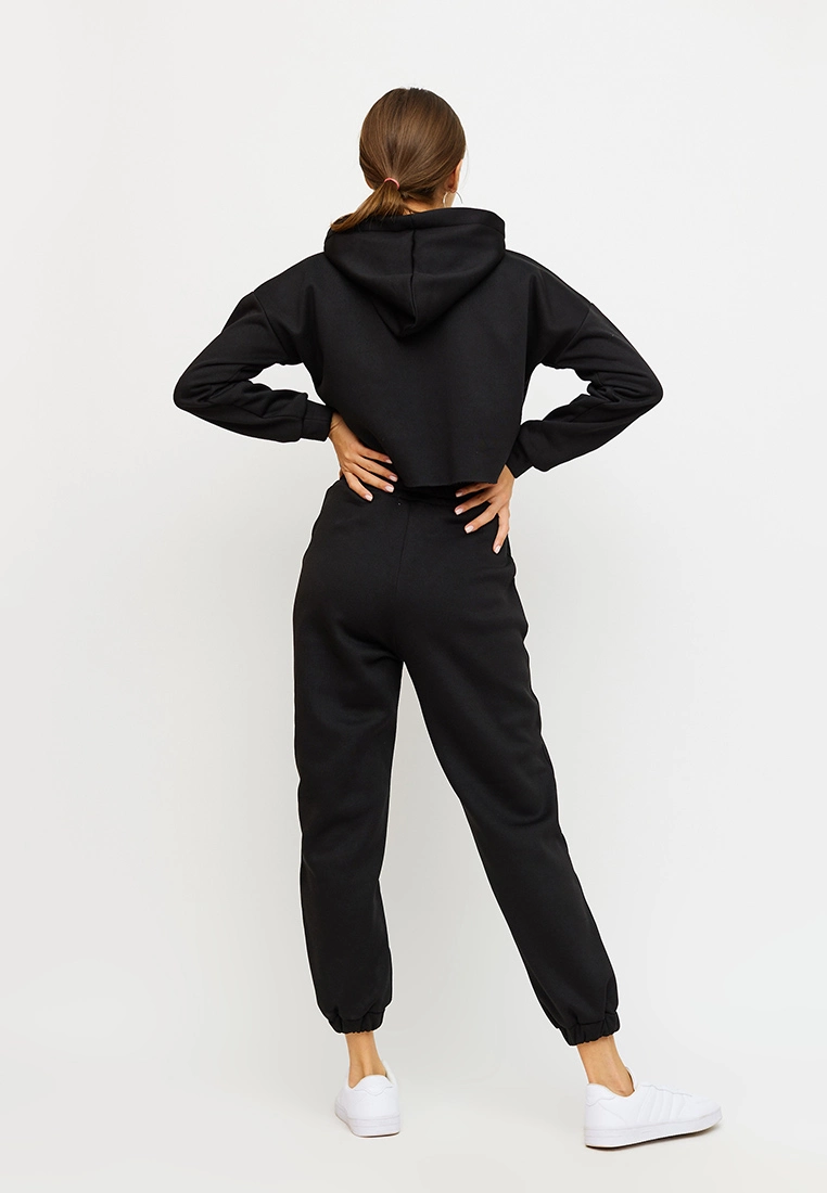 Костюм свитшот плюс брюки из тянущегося плотного трикотажа с флисовым начесом внутри. Свитшот укороченного кроя с капюшоном, спущенная линия плеча, рукав длинный ; штаны прямого кроя с высокой посадкой, манжеты на резинке, в боковых швах карманы