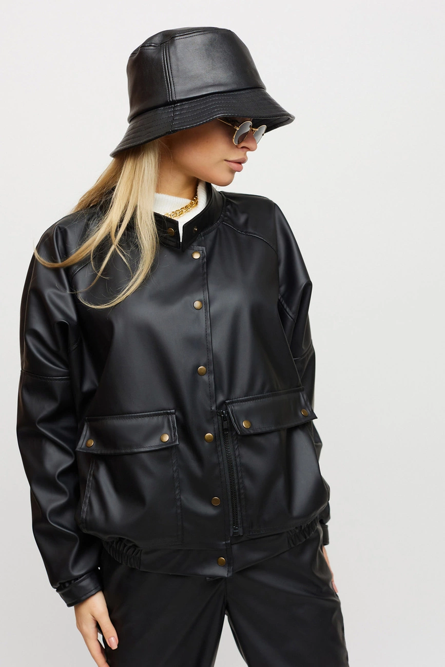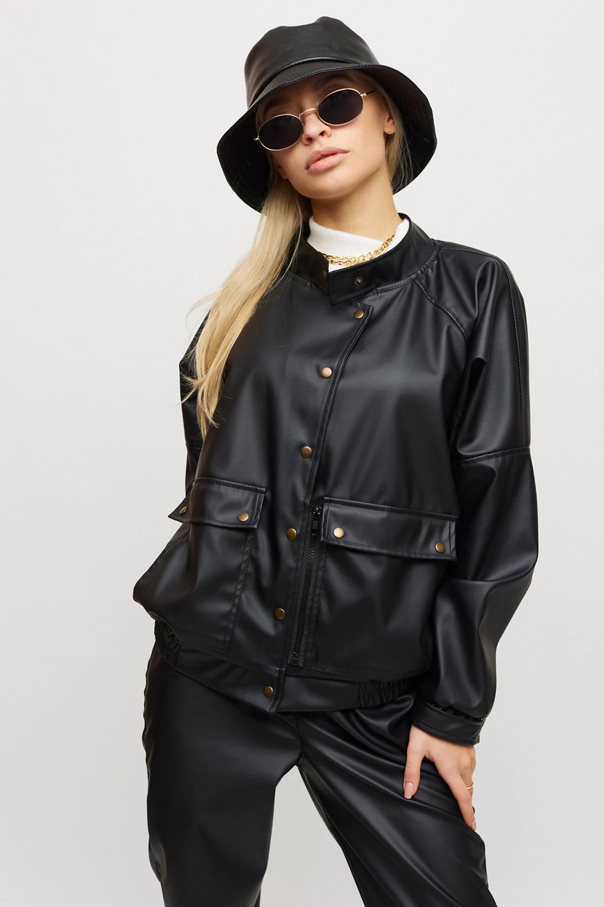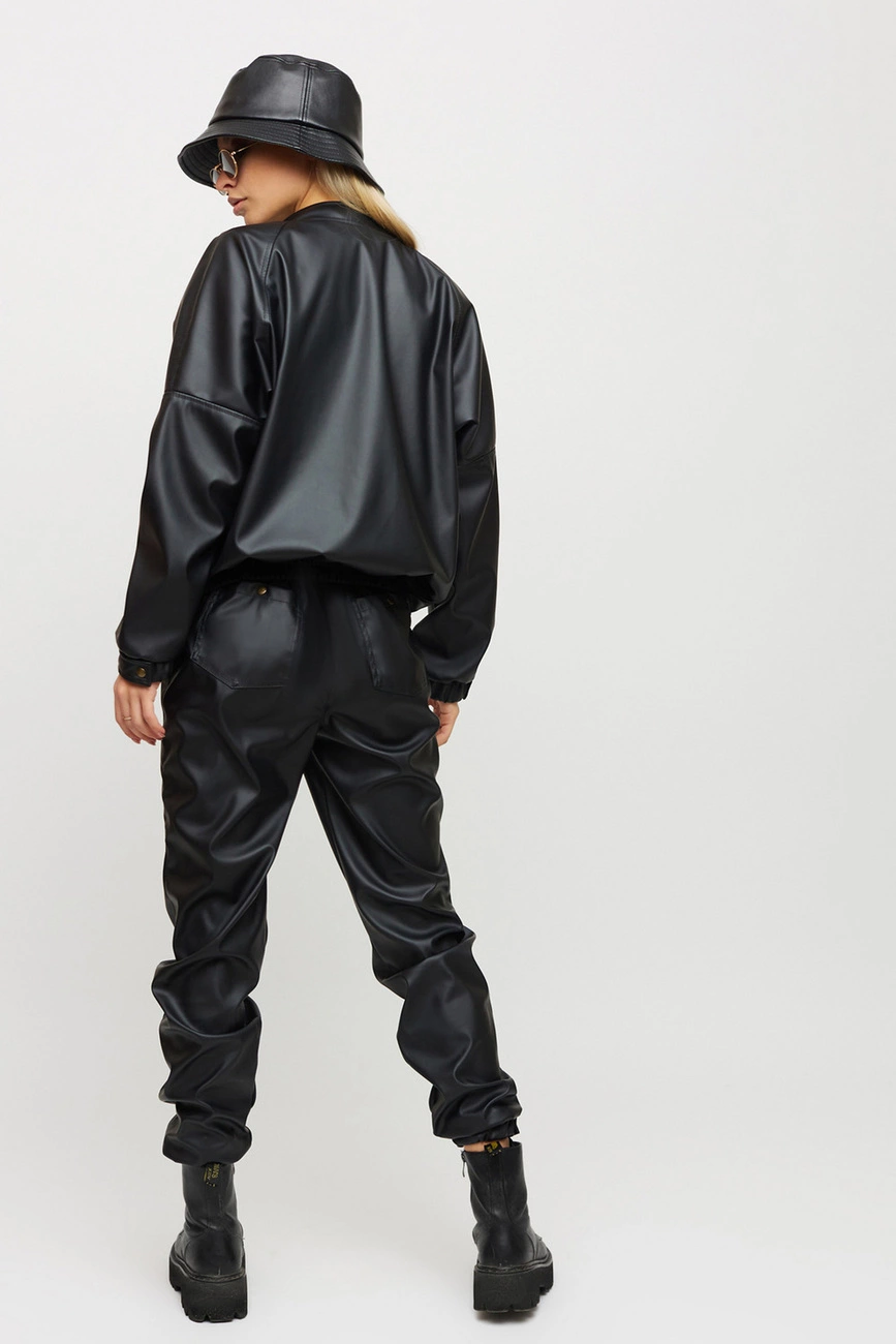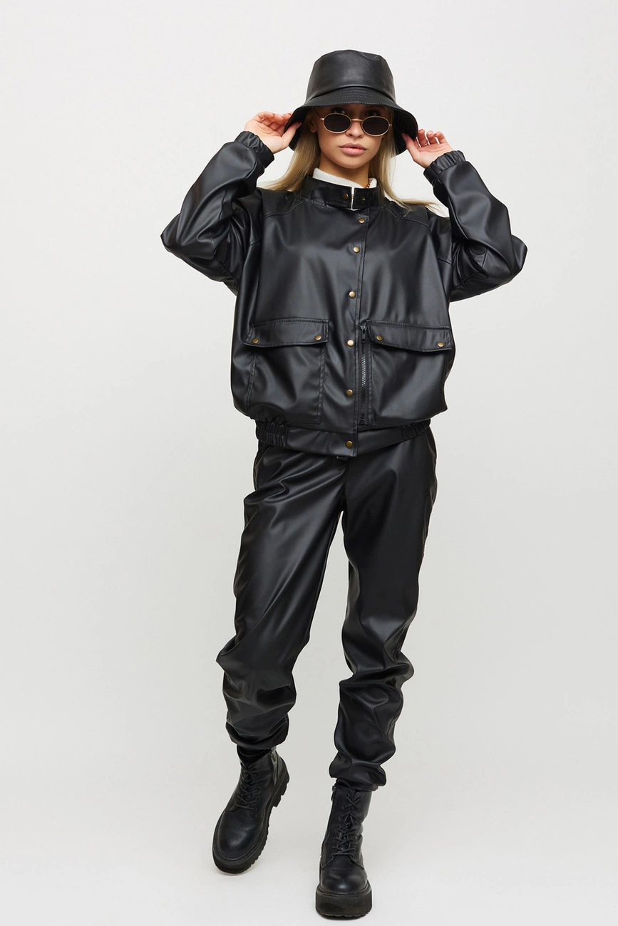 Костюм куртка и штаны из матовой эко-кожи: куртка-косуха свободного кроя со спущенным плечем, на рукавах манжеты, накладные карманы, застежка: кнопки и змейка; брюки-джоггеры с манжетами, есть карманы