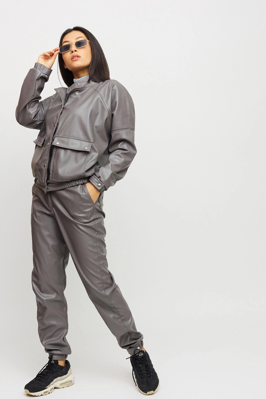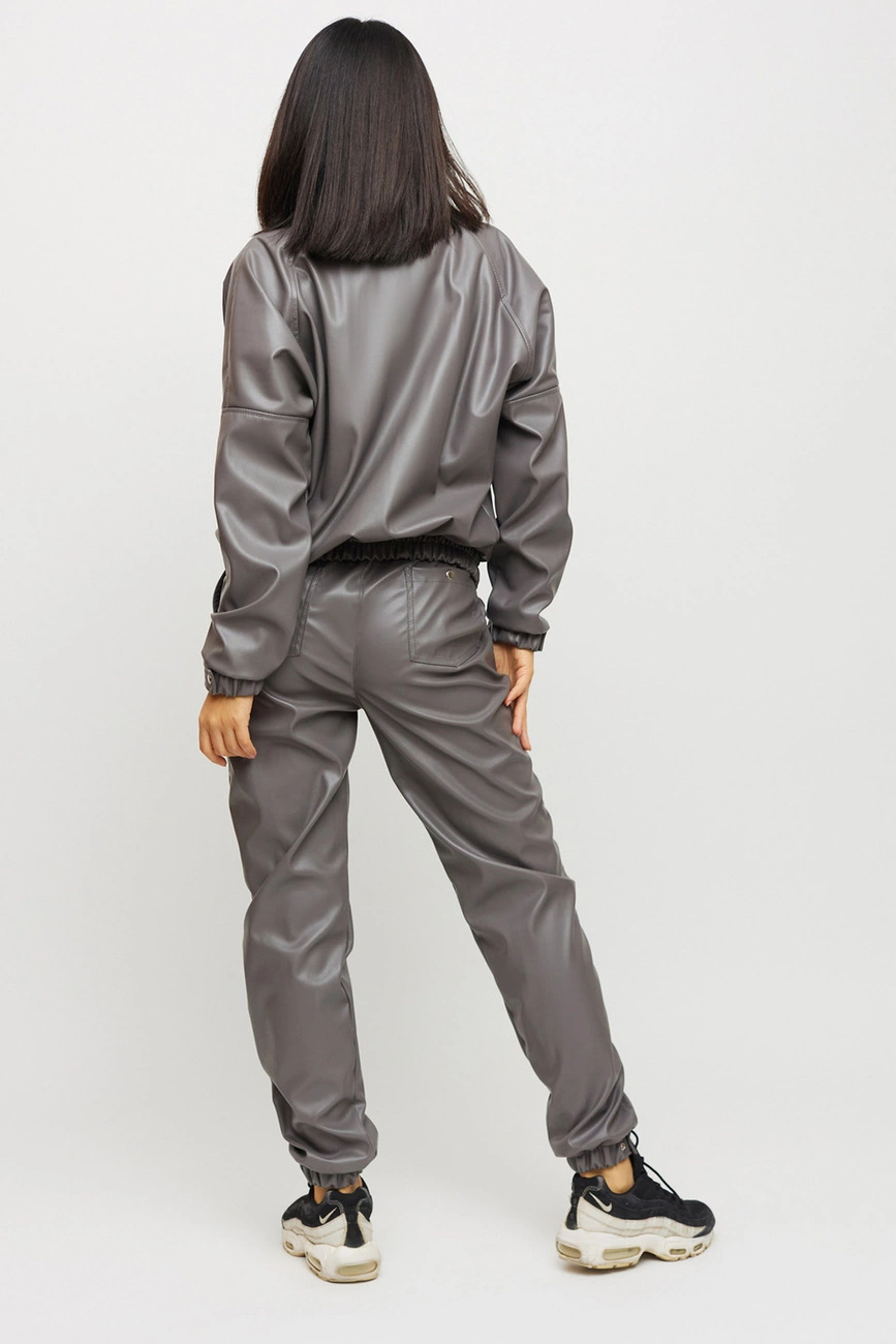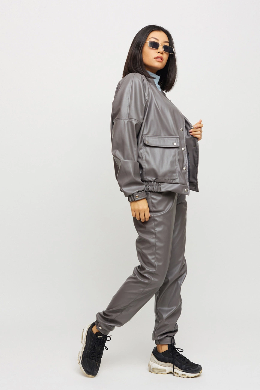 Костюм куртка и штаны из матовой эко-кожи: куртка-косуха свободного кроя со спущенным плечем, на рукавах манжеты, накладные карманы, застежка: кнопки и змейка; брюки-джоггеры с манжетами, есть карманы