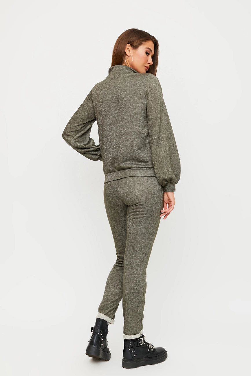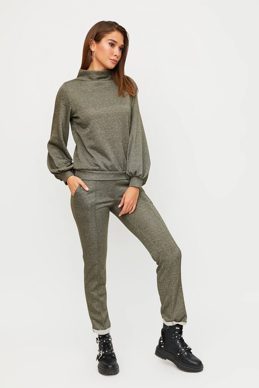 Костюм свитшот плюс штаны из плотной зимней ткани с добавлением люрекса. Свитшот с невысоким воротником-стойкой и расклешенными рукавами; брюки длинной 7/8 с подворотом по низу, впереди отстрочка-стрелки, есть карманы