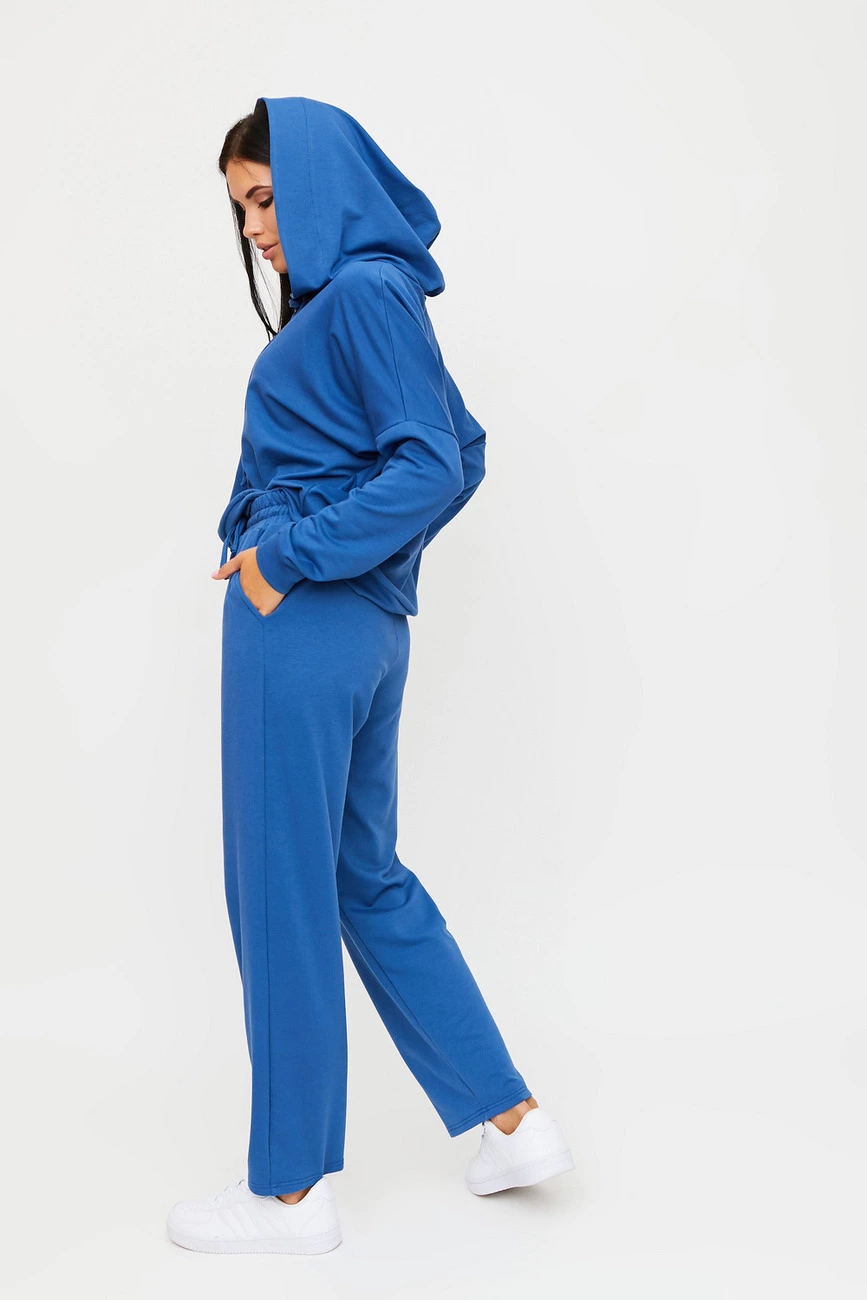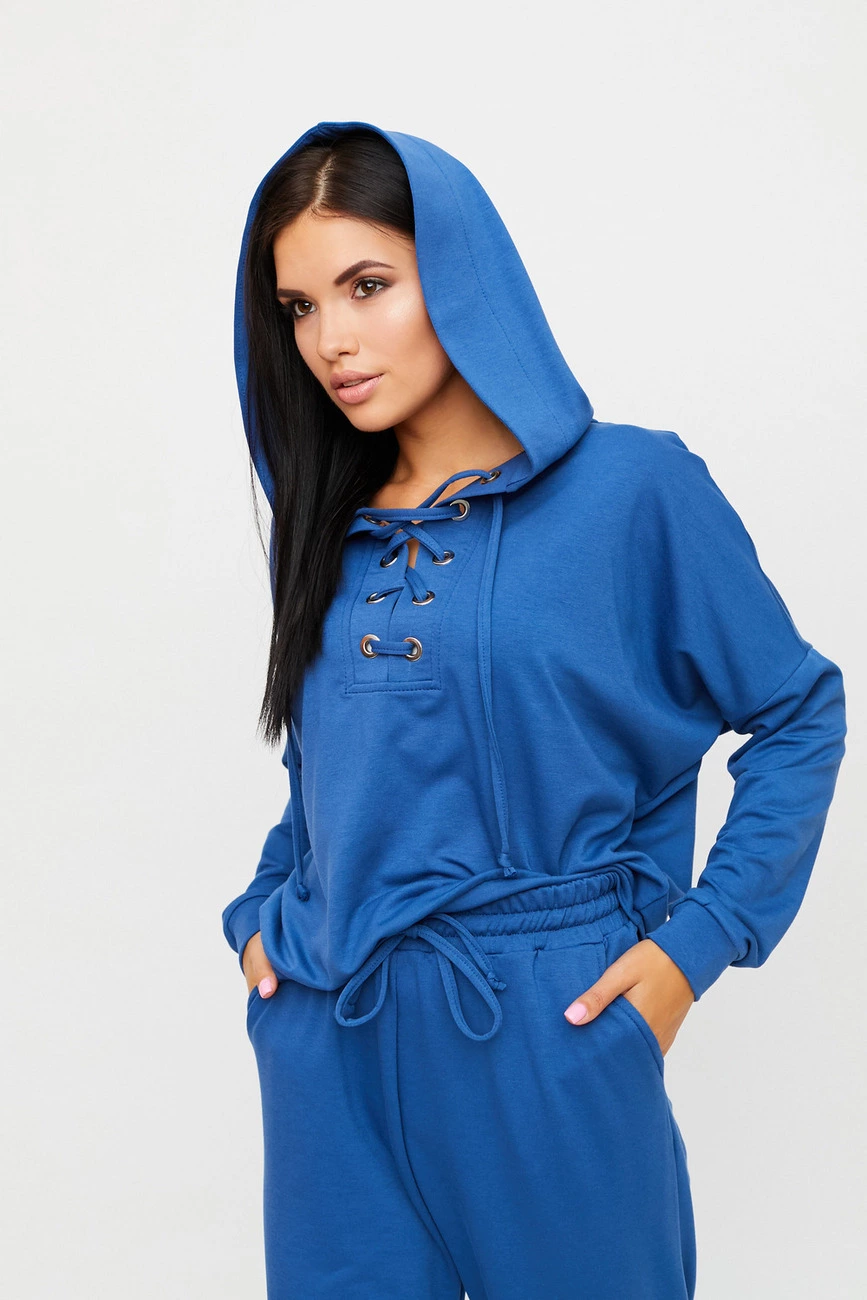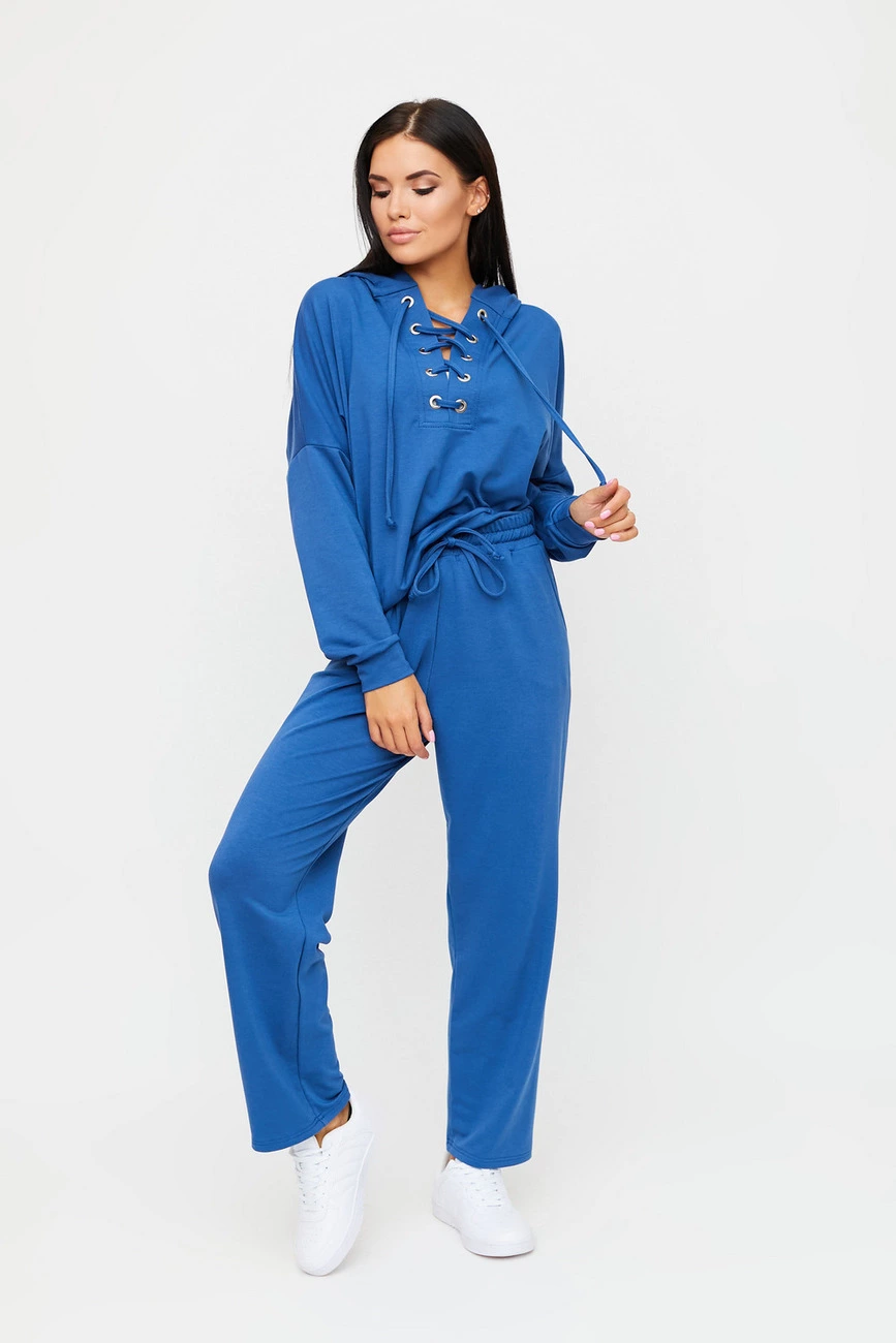 Костюм свитшот oversize плюс брюки из слегка тянущегося трикотажа. Свитшот свободного кроя со спущенной линией плеча, есть капюшон, V-Образный вырез декорирован шнуровкой; штаны прямого кроя со средней посадкой, в боковых швах карманы