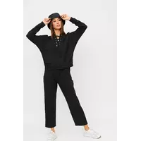 Костюм свитшот oversize плюс брюки из слегка тянущегося трикотажа. Свитшот свободного кроя со спущенной линией плеча, есть капюшон, V-Образный вырез декорирован шнуровкой; штаны прямого кроя со средней посадкой, в боковых швах карманы