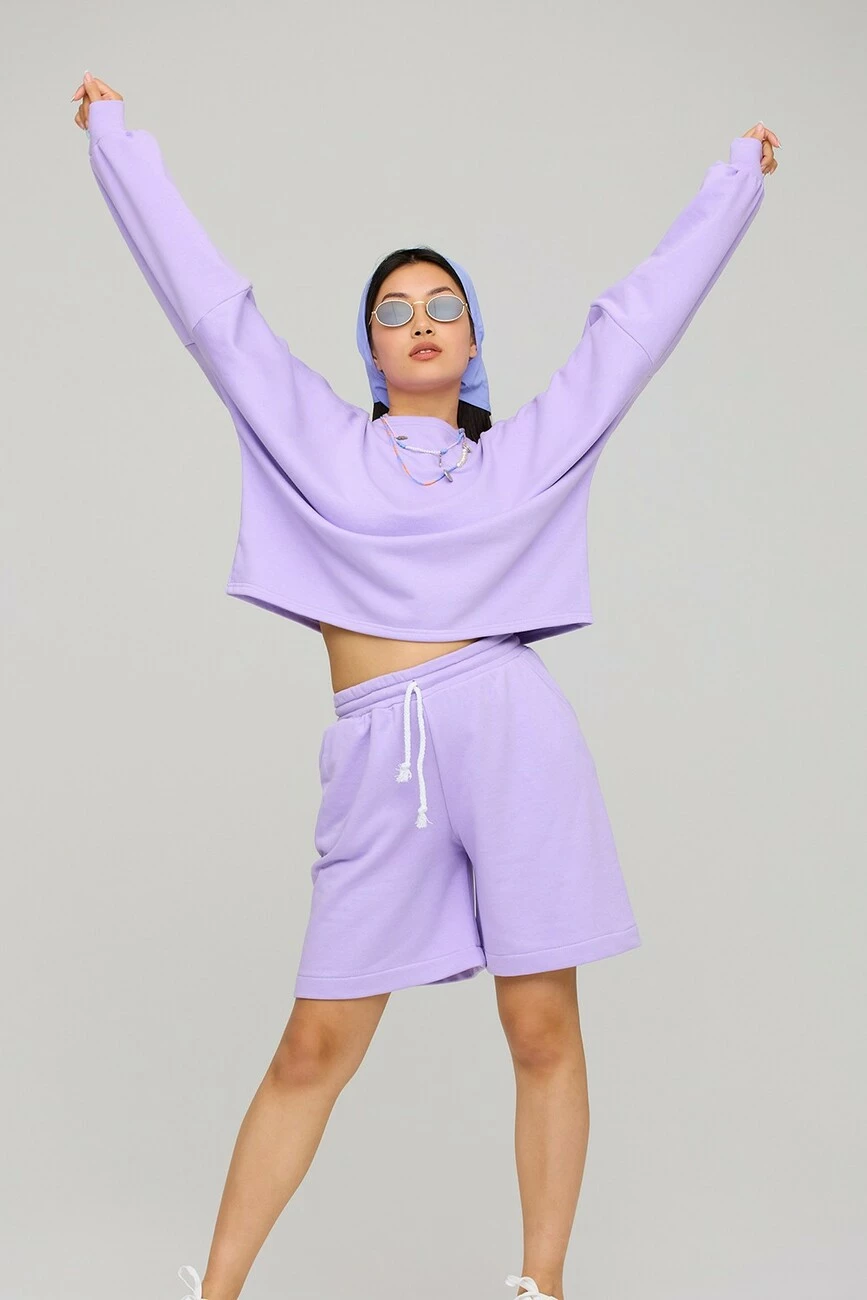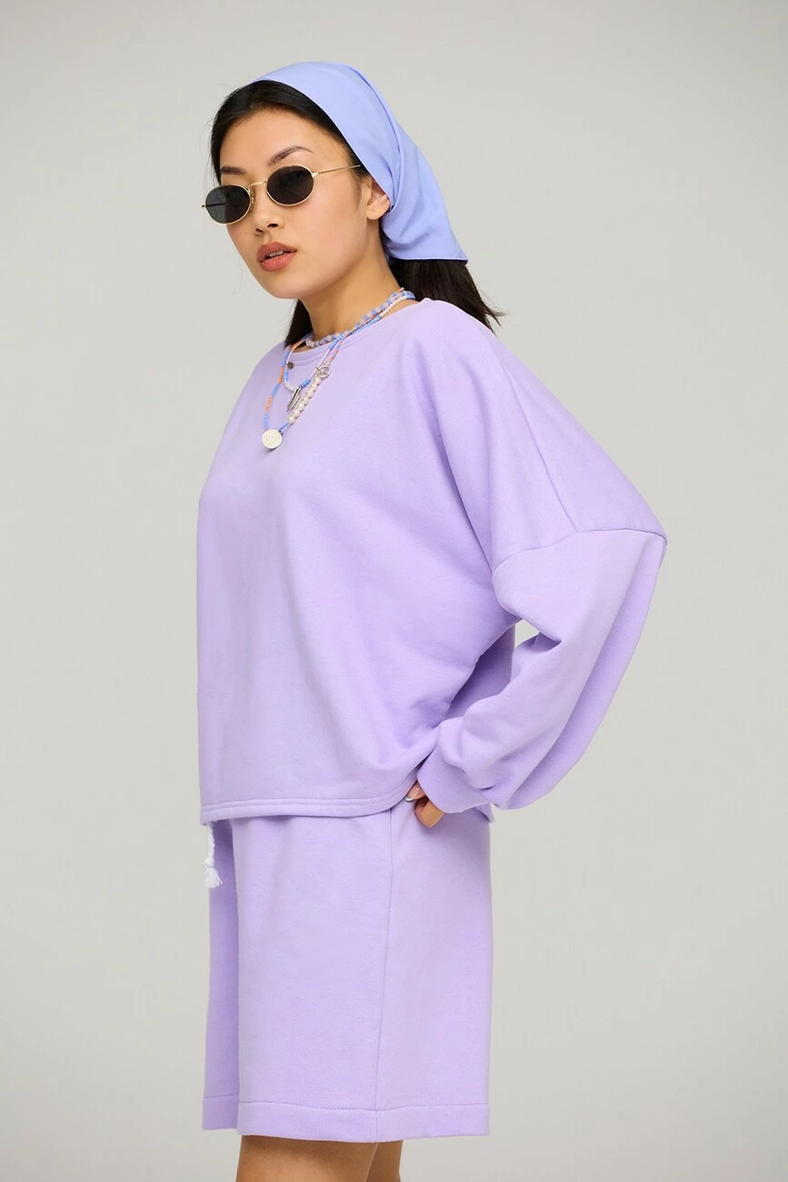 Костюм свитшот oversize и шорты-бермуды из трикотажа. Свитшот широкий, рукав длинный, спущенное плече ; шорты с высокой посадкой, пояс на резинке, карманы в боковых швах