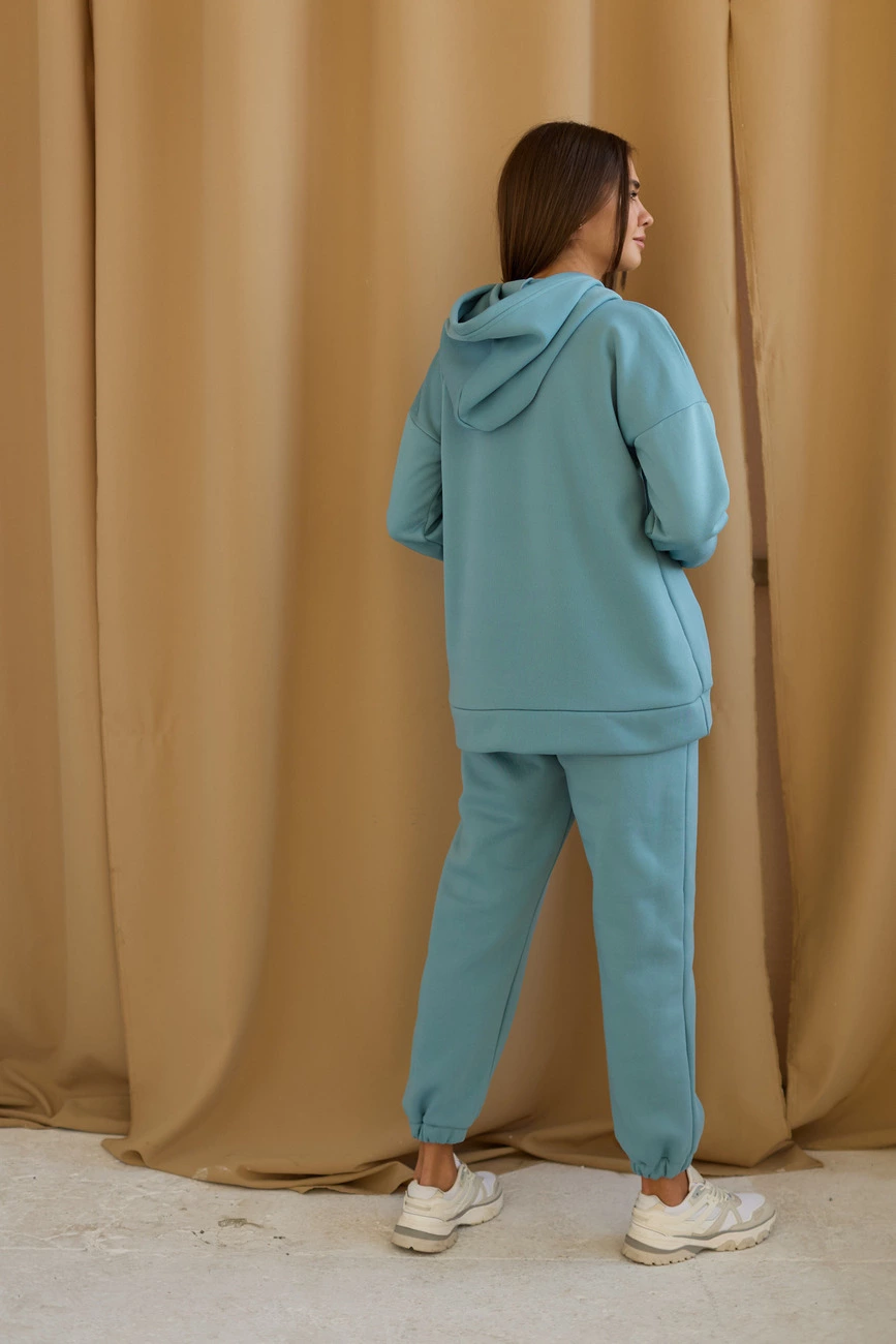 Костюм худи oversize плюс брюки из тянущегося плотного трикотажа с флисовым начесом внутри. Худи свободного кроя со спущенной линией плеча, есть капюшон; штаны прямого кроя с высокой посадкой, манжеты на резинке, в боковых швах карманы