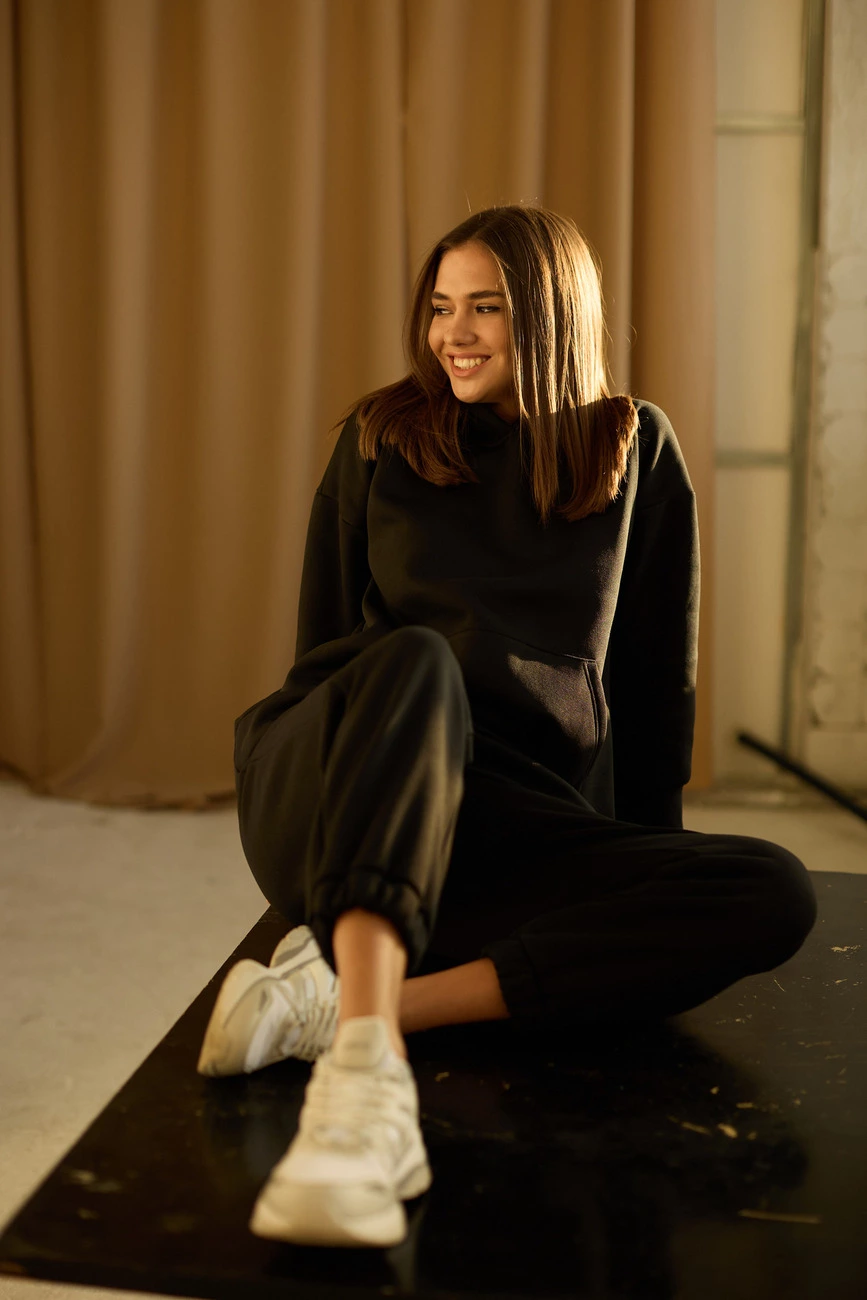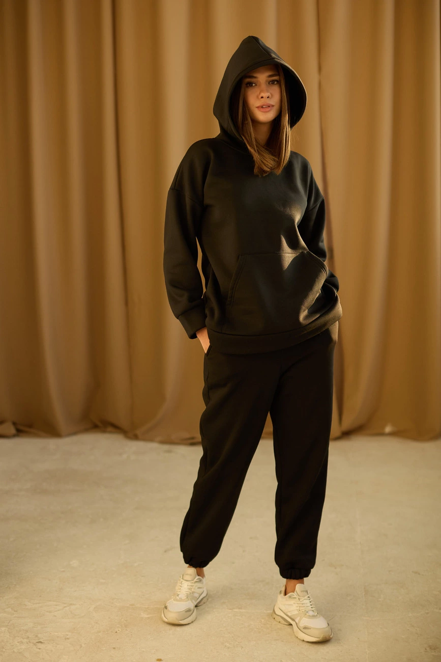 Костюм худи oversize плюс брюки из тянущегося плотного трикотажа с флисовым начесом внутри. Худи свободного кроя со спущенной линией плеча, есть капюшон; штаны прямого кроя с высокой посадкой, манжеты на резинке, в боковых швах карманы