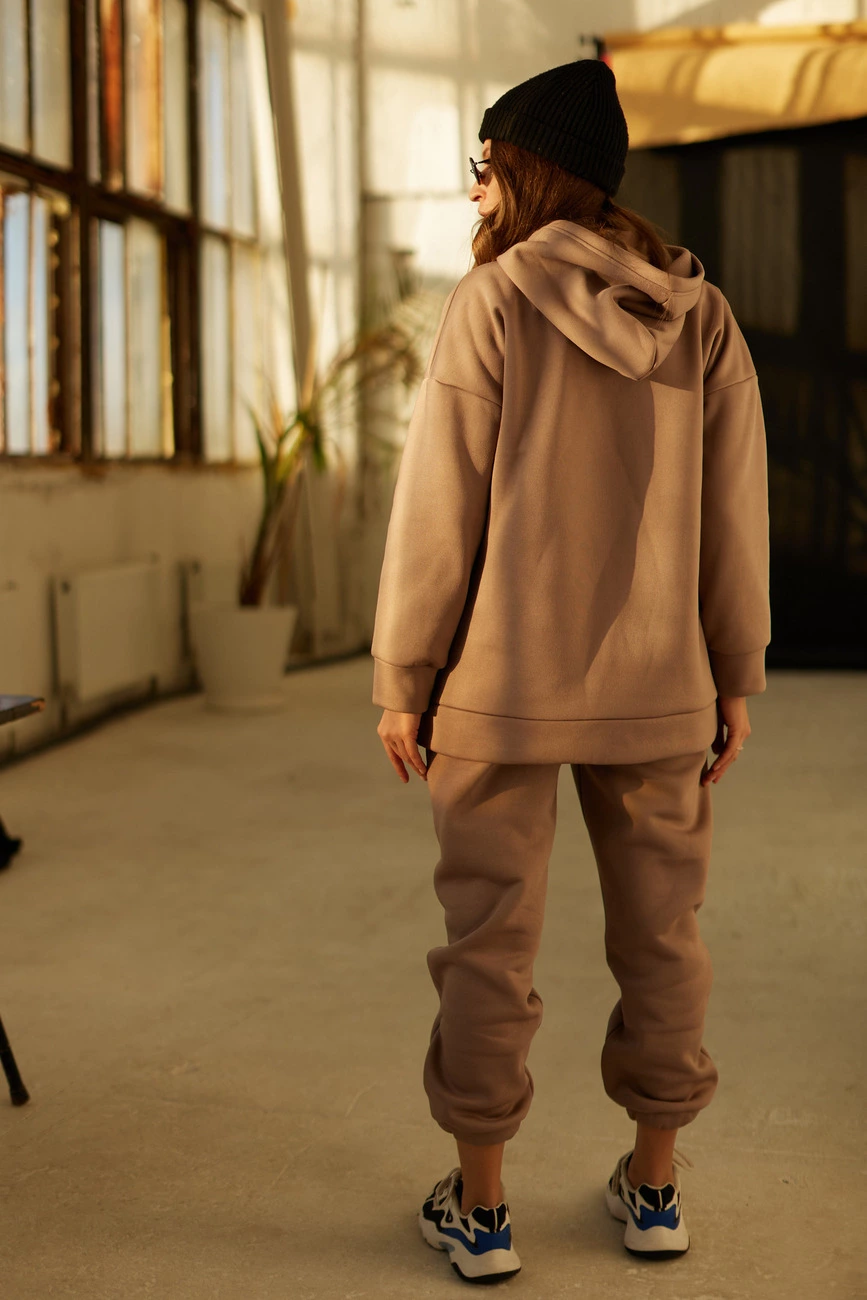 Костюм худи oversize плюс брюки из тянущегося плотного трикотажа с флисовым начесом внутри. Худи свободного кроя со спущенной линией плеча, есть капюшон; штаны прямого кроя с высокой посадкой, манжеты на резинке, в боковых швах карманы