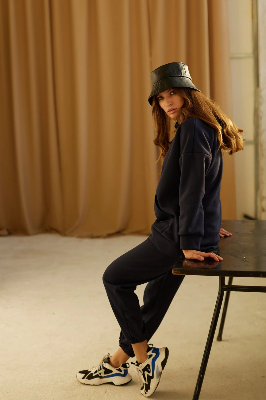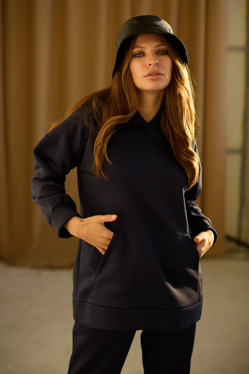 Костюм худи oversize плюс брюки из тянущегося плотного трикотажа с флисовым начесом внутри. Худи свободного кроя со спущенной линией плеча, есть капюшон; штаны прямого кроя с высокой посадкой, манжеты на резинке, в боковых швах карманы