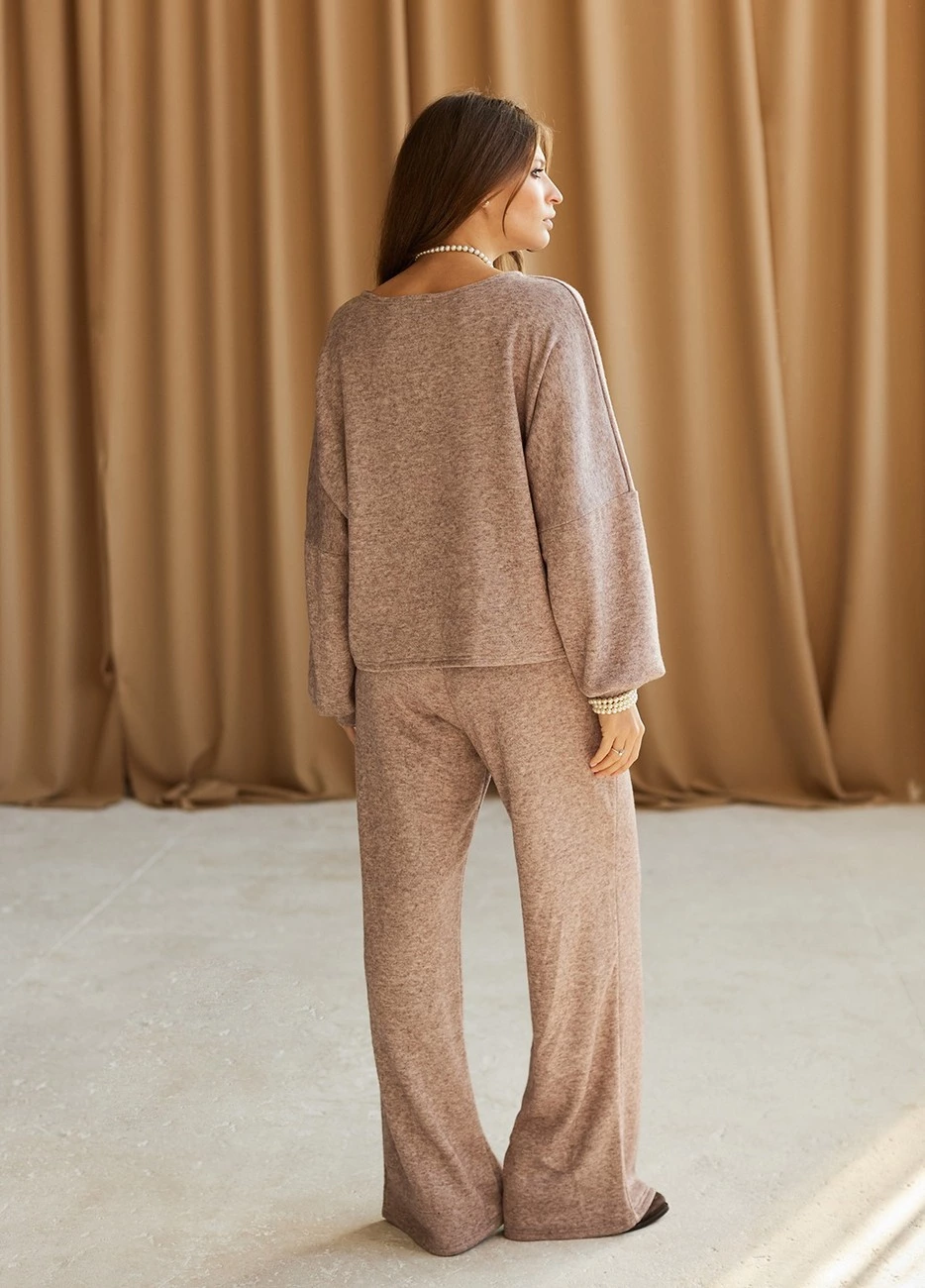 Костюм свитшот oversize плюс брюки-кюлоты из теплого тянущегося трикотажа.Свитшот широкий, рукав длинный, спущенное плече; кюлоты с высокой посадкой, пояс на резинке, карманы в боковых швах