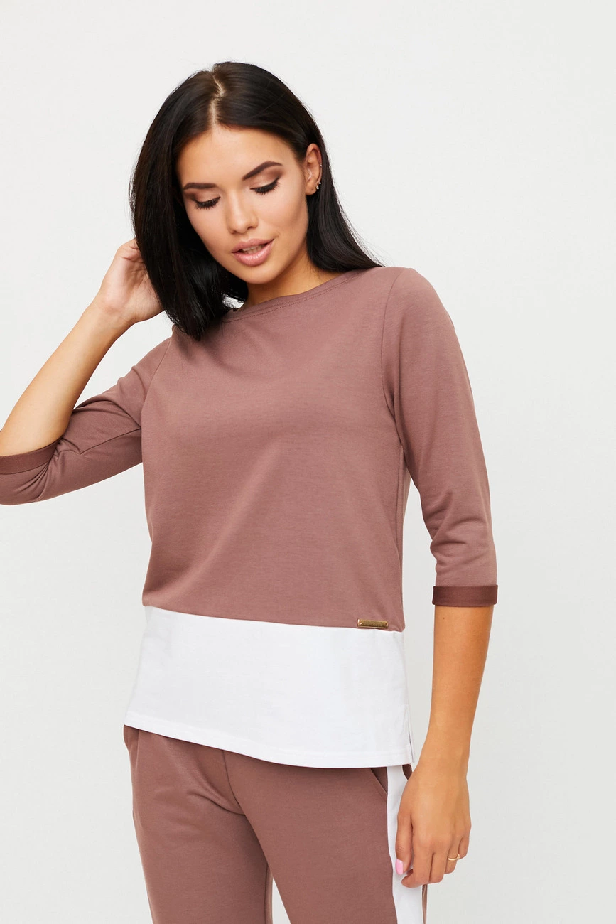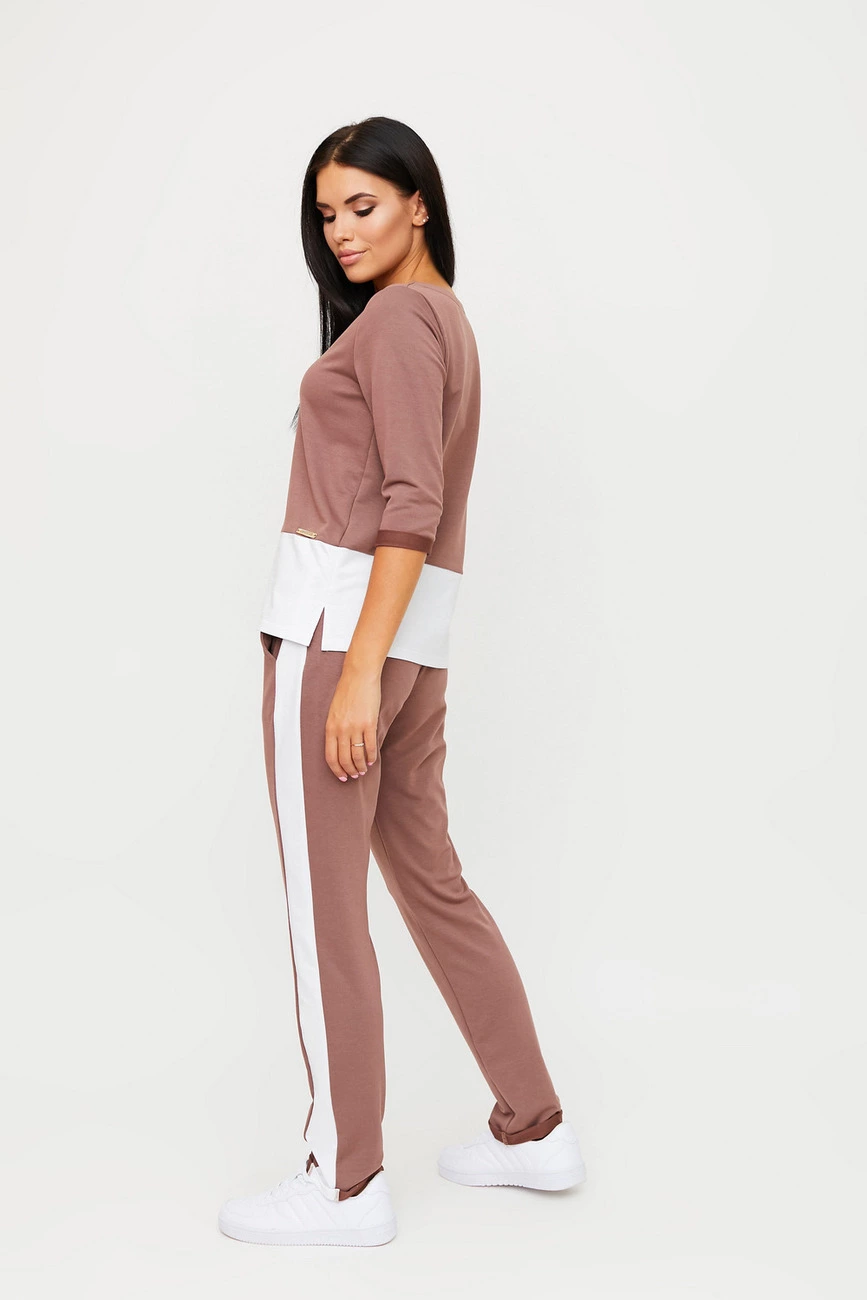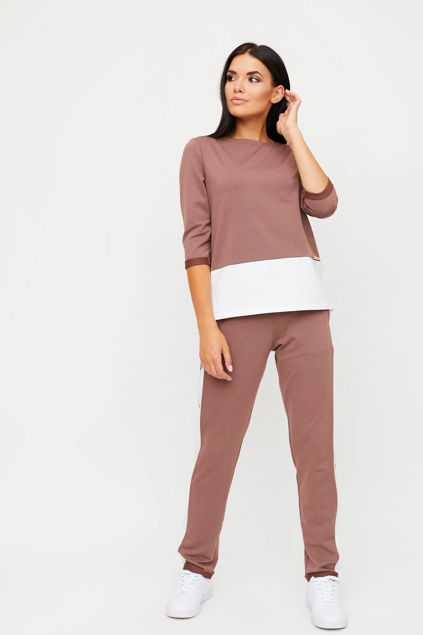 Костюм свитшот плюс штаны из приятной на ощупь стрейчевой ткани с добавлением хлопка, свитшот: рукав 3/4 с отворотом, по низу вставка из белой ткани, брюки длинные также с отворотом, посадка низкая, есть карманы в боковых швах, по бокам брюк выполнены лампасы белого цвета