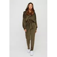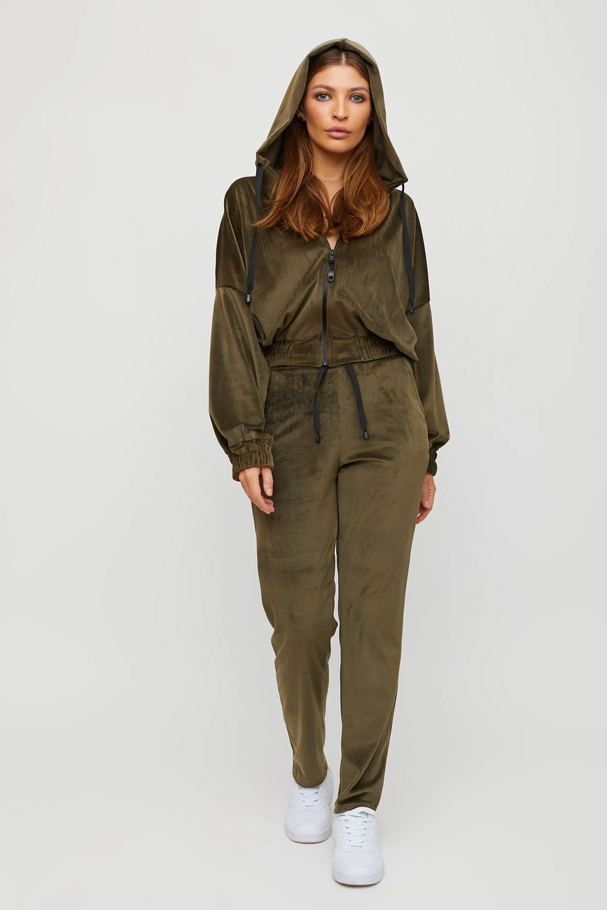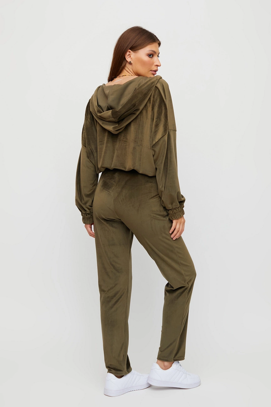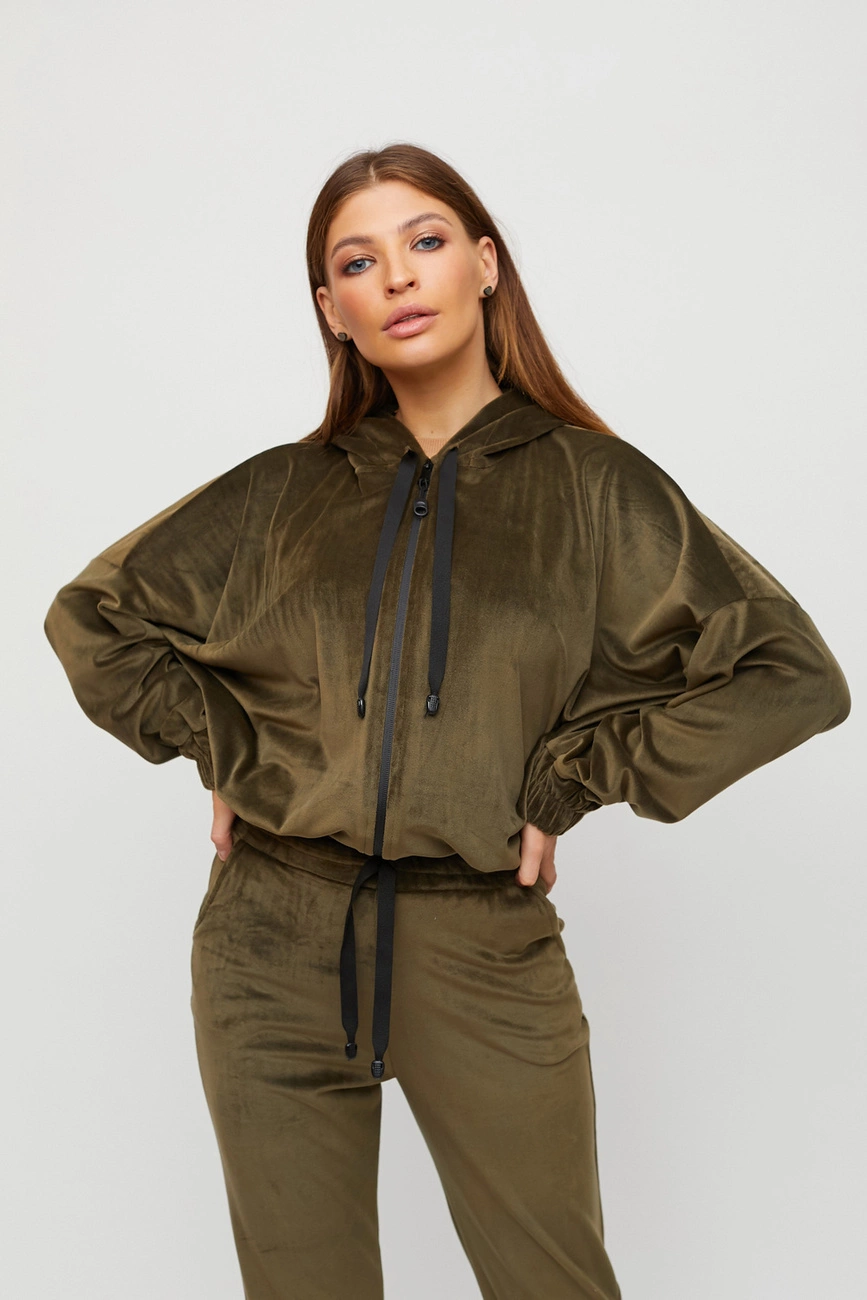 Костюм укороченная кофта плюс брюки из тянущегося ворсистого трикотажа. Кофта свободного кроя со спущенной линией плеча, большой капюшон, широкий рукав, манжеты собраны на резинку; штаны прямого кроя со средней посадкой, в боковых швах карманы