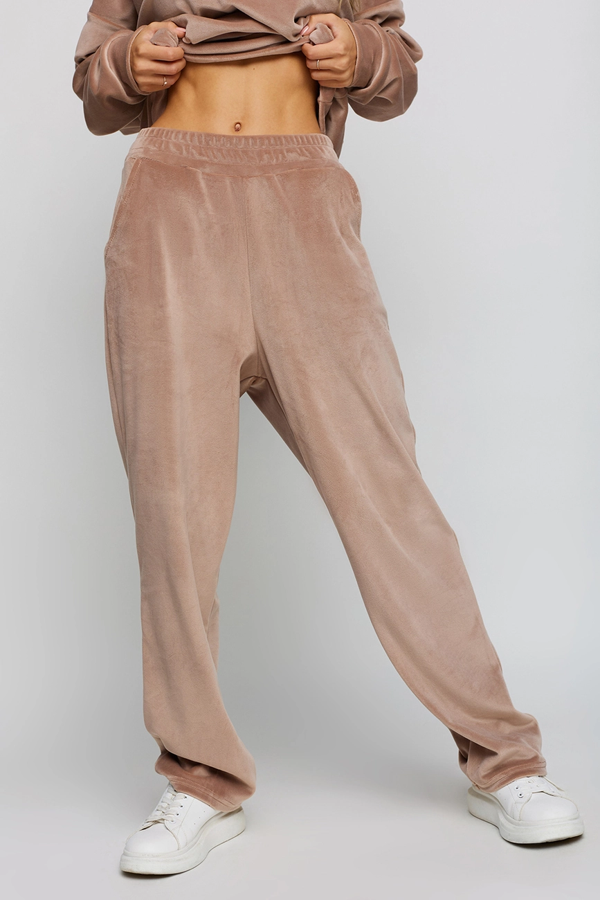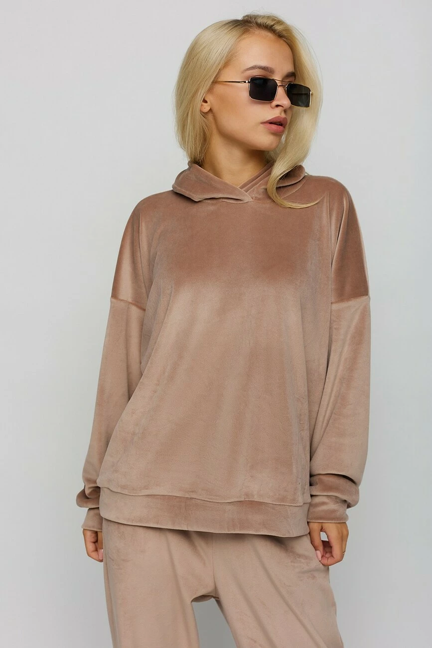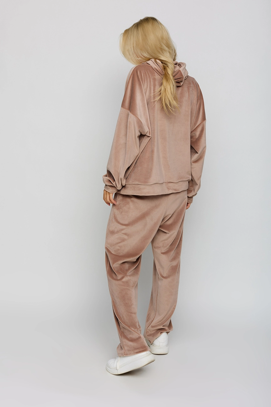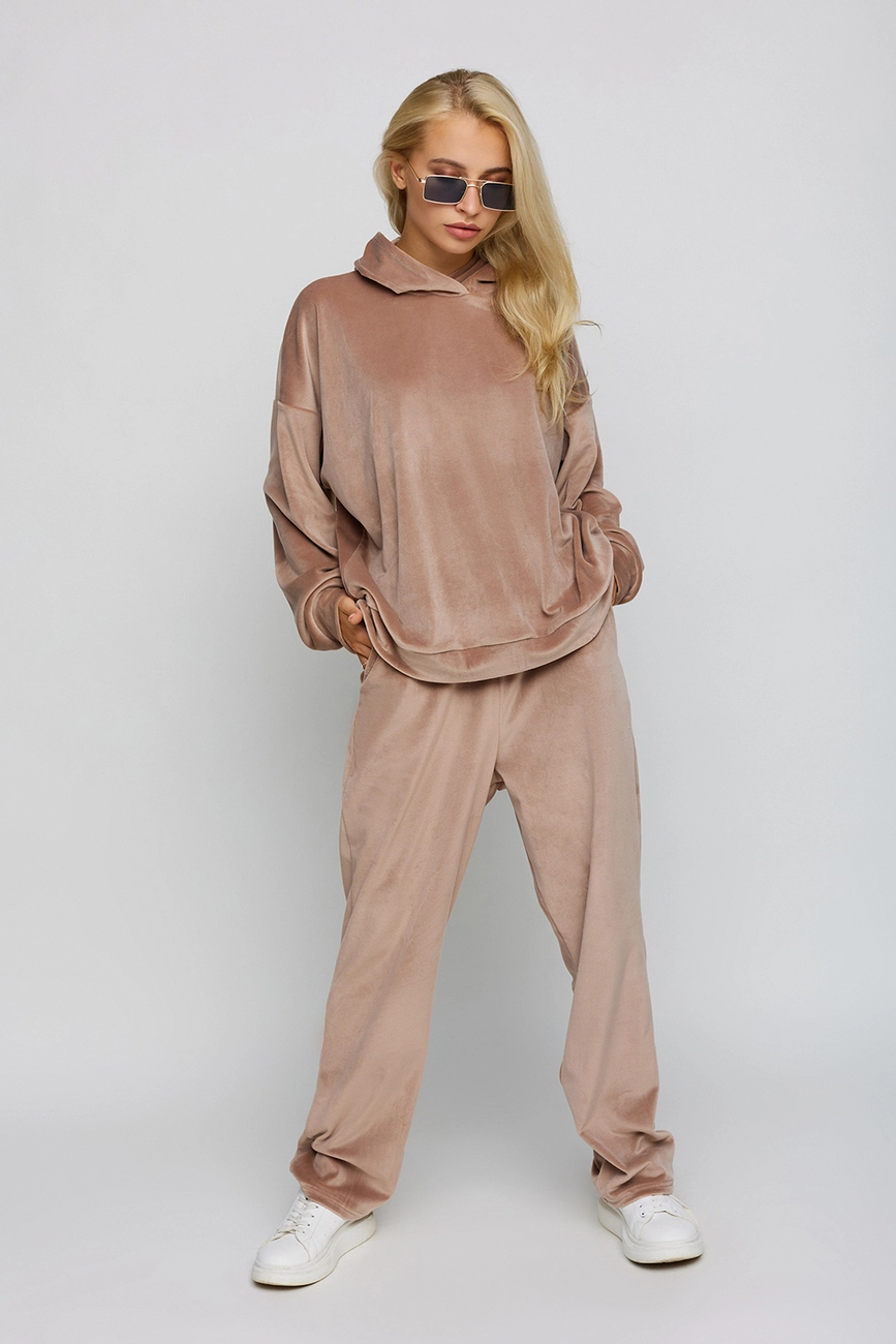 Костюм худи oversize плюс брюки из тянущегося ворсистого трикотажа. Худи свободного кроя со спущенной линией плеча; штаны прямого кроя с высокой посадкой, в боковых швах карманы