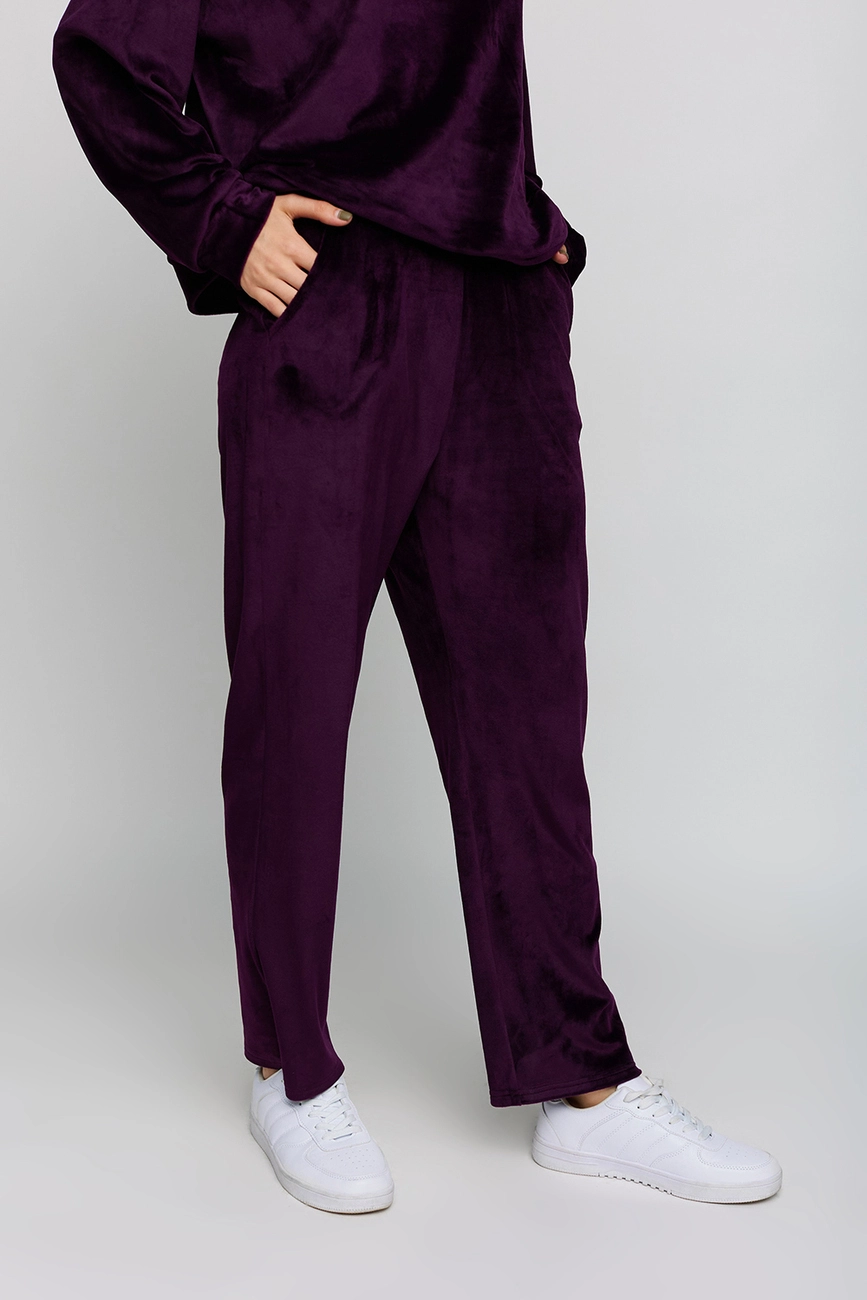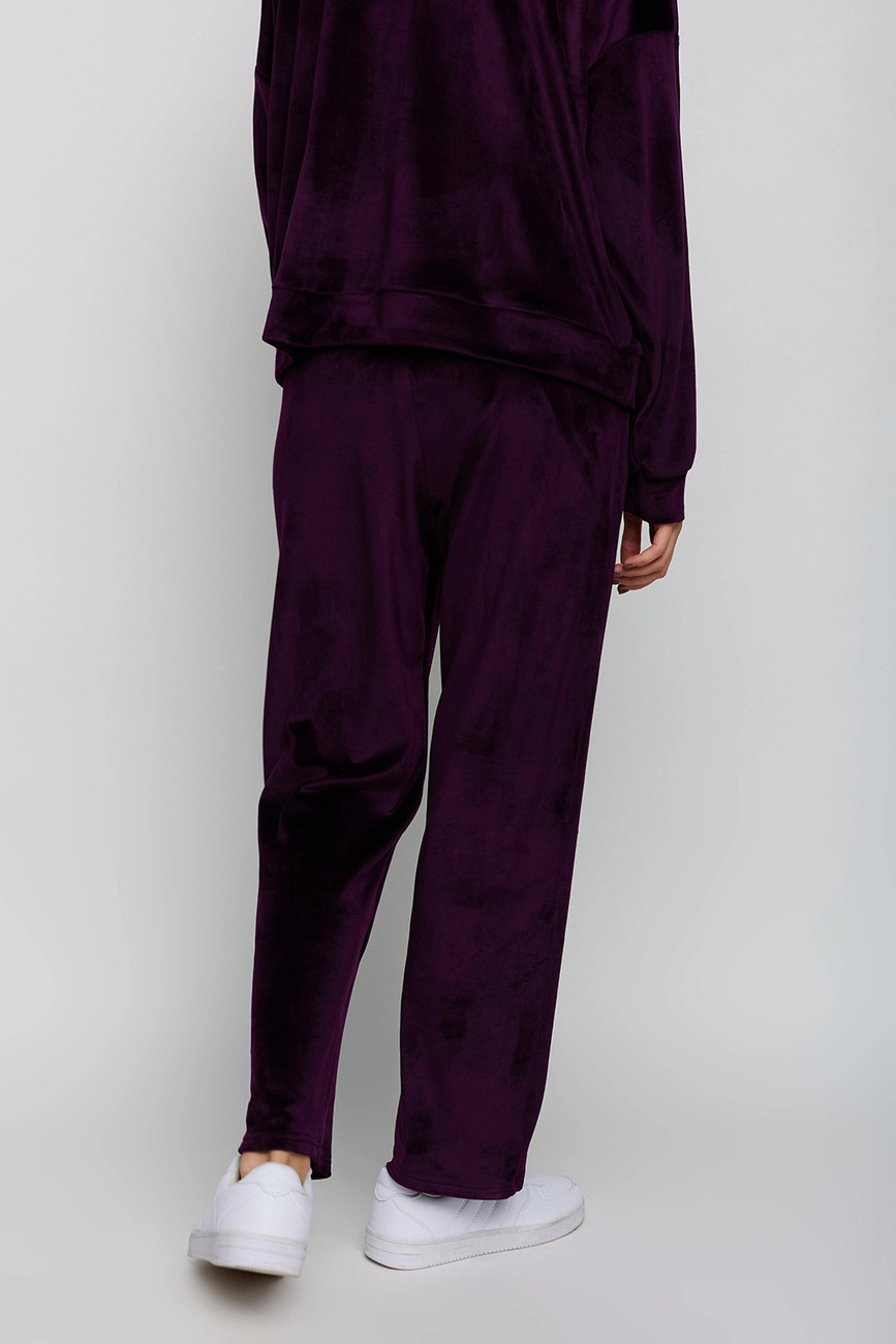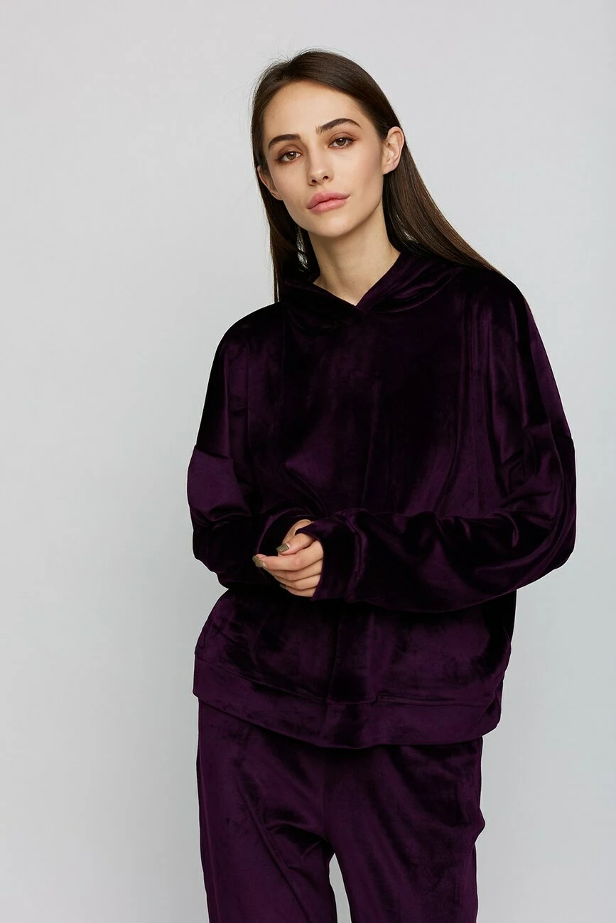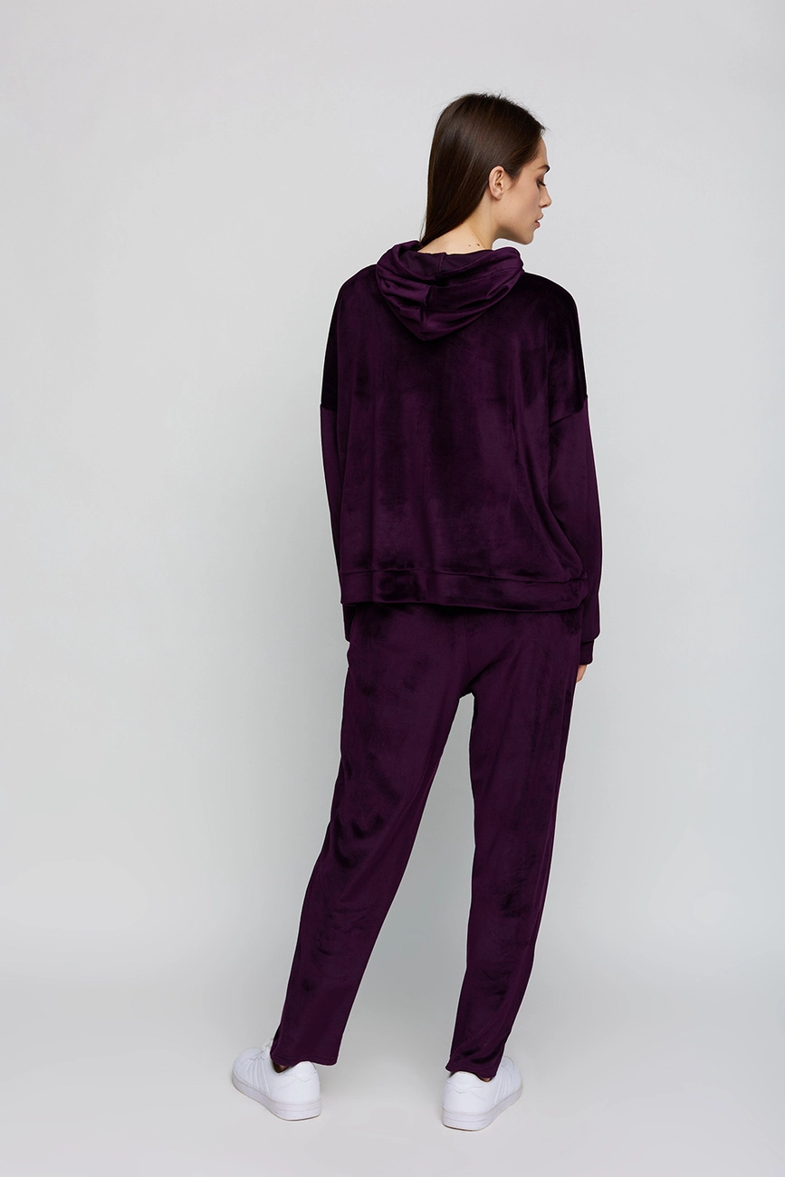 Костюм худи oversize плюс брюки из тянущегося ворсистого трикотажа. Худи свободного кроя со спущенной линией плеча; штаны прямого кроя с высокой посадкой, в боковых швах карманы