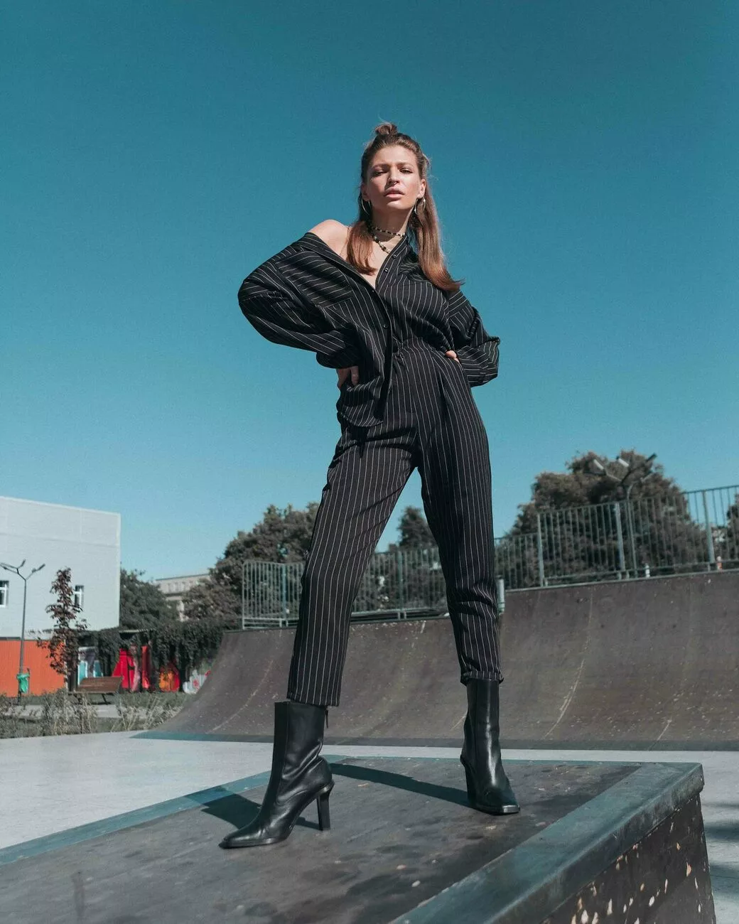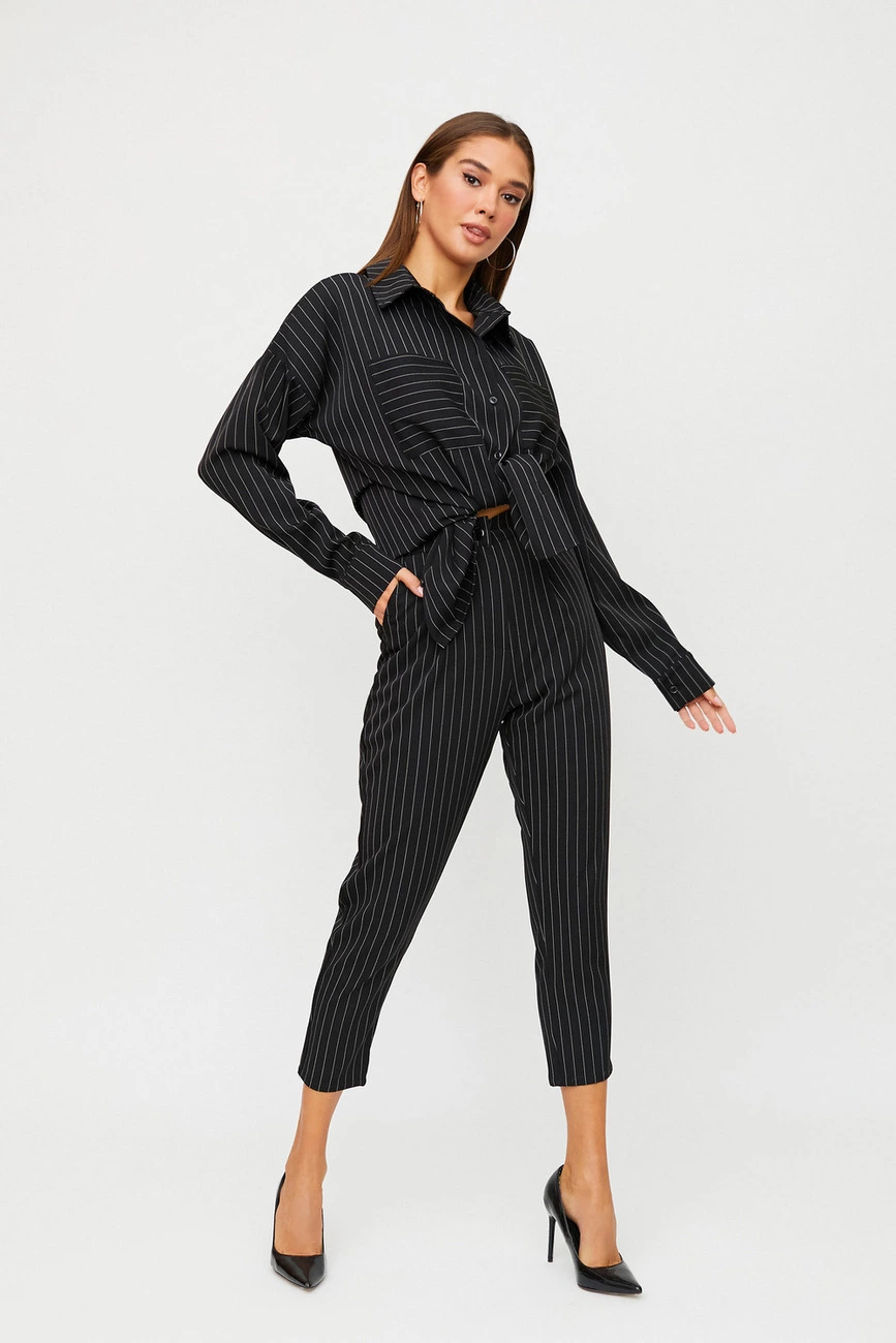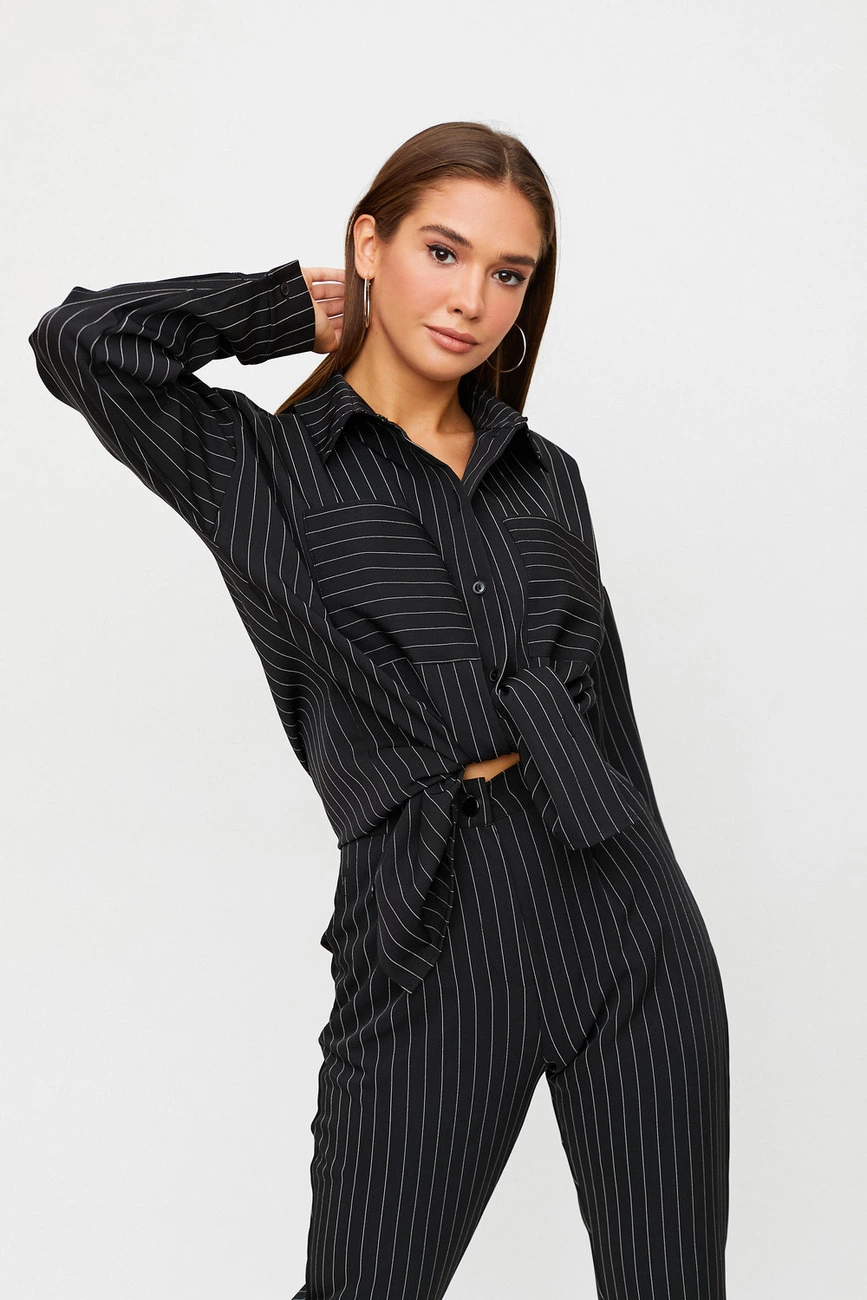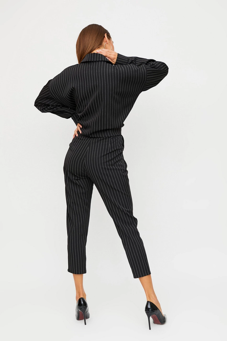 Костюм рубашка oversize плюс брюки из нетянущейся костюмной ткани. Рубашка удлиненная свободного кроя, воротник-стойка, спущенная линия плеча, на рукавах манжеты. Брюки зауженные к низу со средней посадкой, есть карманы, длина 5/6