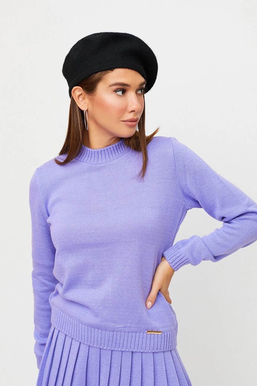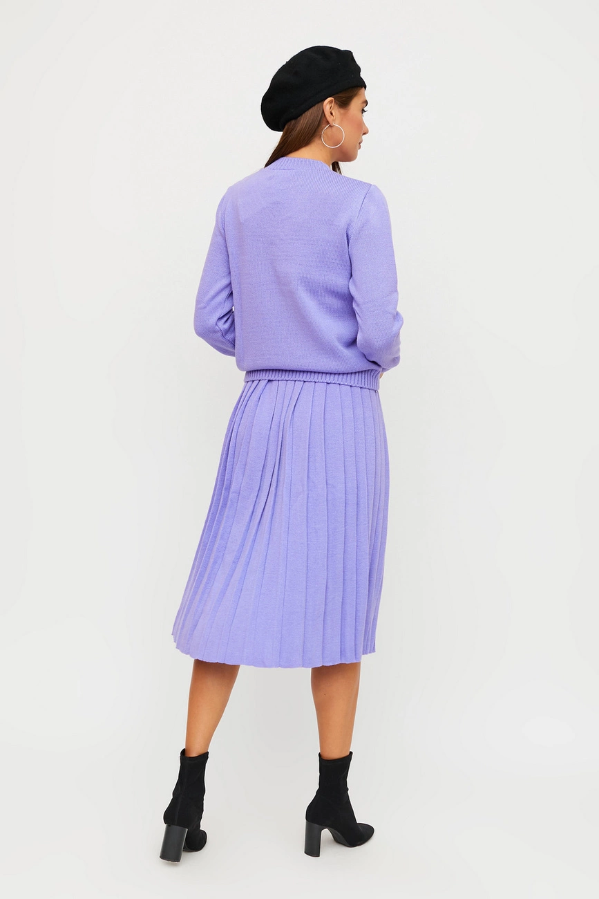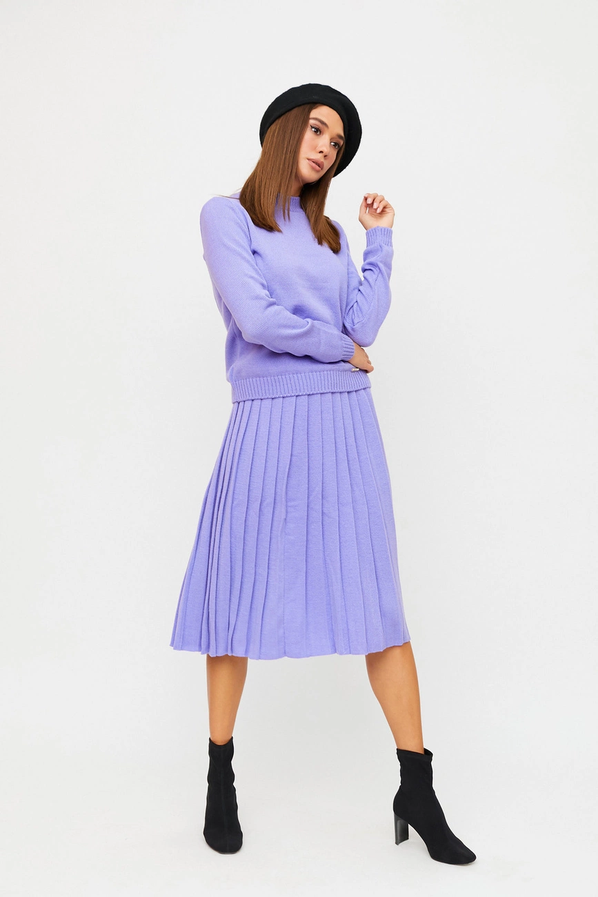 Костюм свитер плюс юбка из теплого вязанного трикотажа с добавлением шерсти. Свитер с длинными рукавами с манжетами, невысокий воротник; юбка-плиссе миди длины, на талии резинка