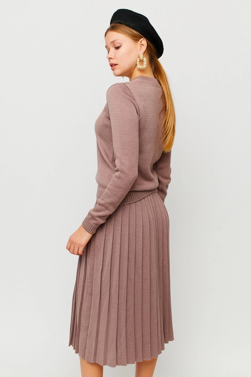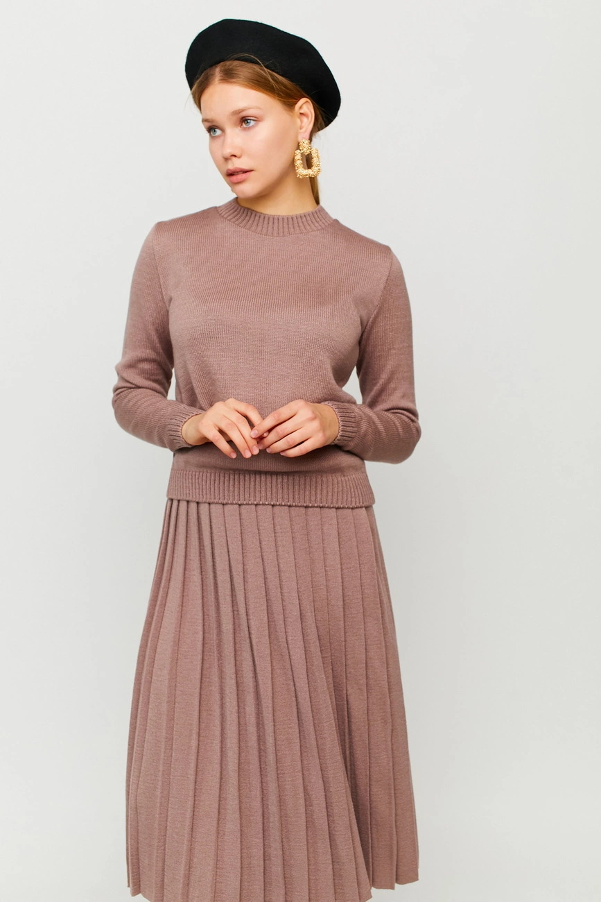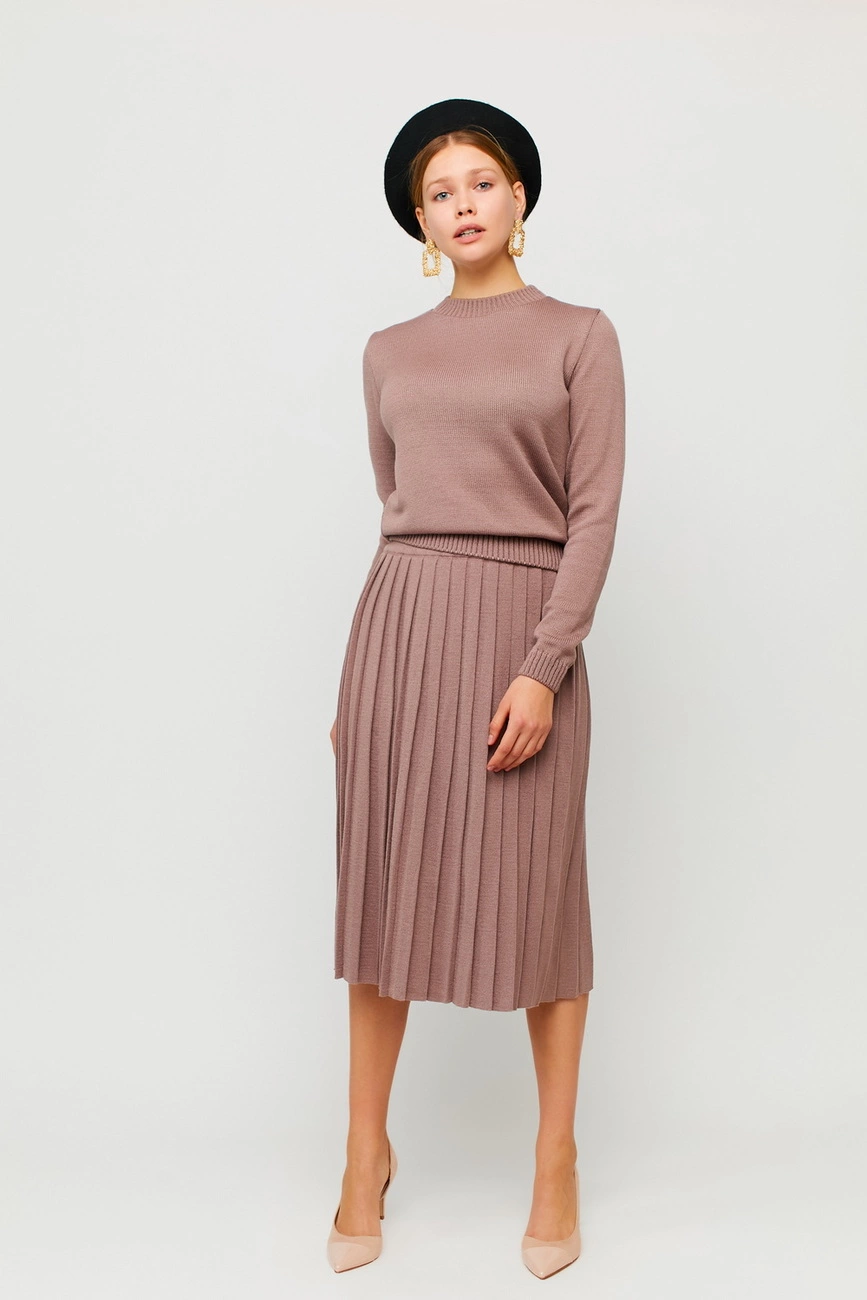 Костюм свитер плюс юбка из теплого вязанного трикотажа с добавлением шерсти. Свитер с длинными рукавами с манжетами, невысокий воротник; юбка-плиссе миди длины, на талии резинка