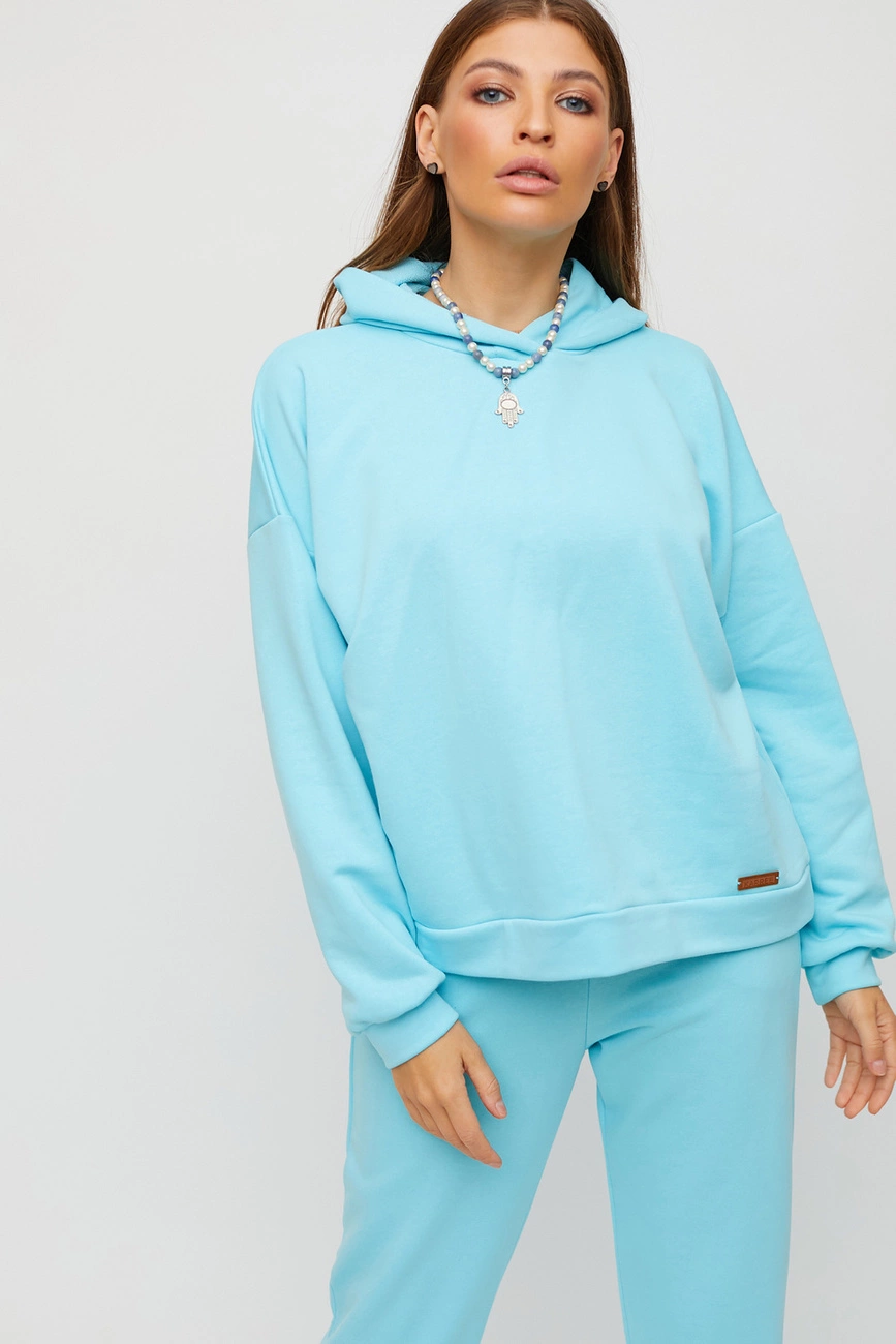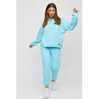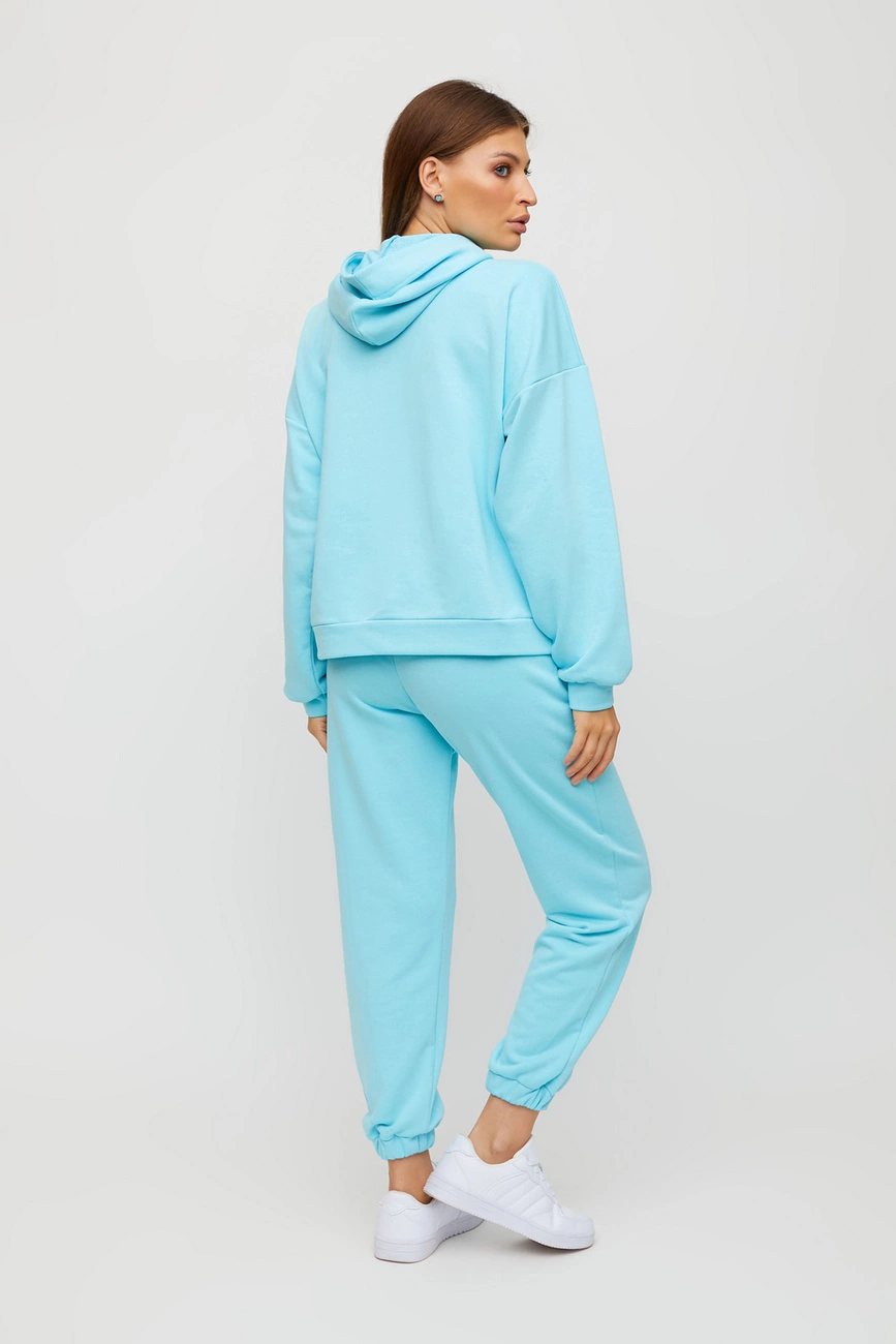 Костюм свитшот oversize плюс брюки из тянущегося плотного трикотажа с петельчатой изнанкой. Свитшот свободного кроя со спущенной линией плеча, есть капюшон; штаны прямого кроя с высокой посадкой, манжеты на резинке, в боковых швах карманы