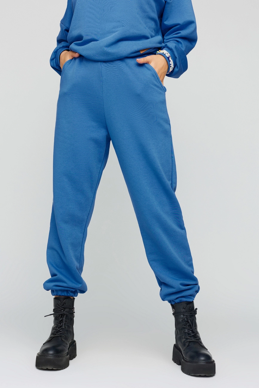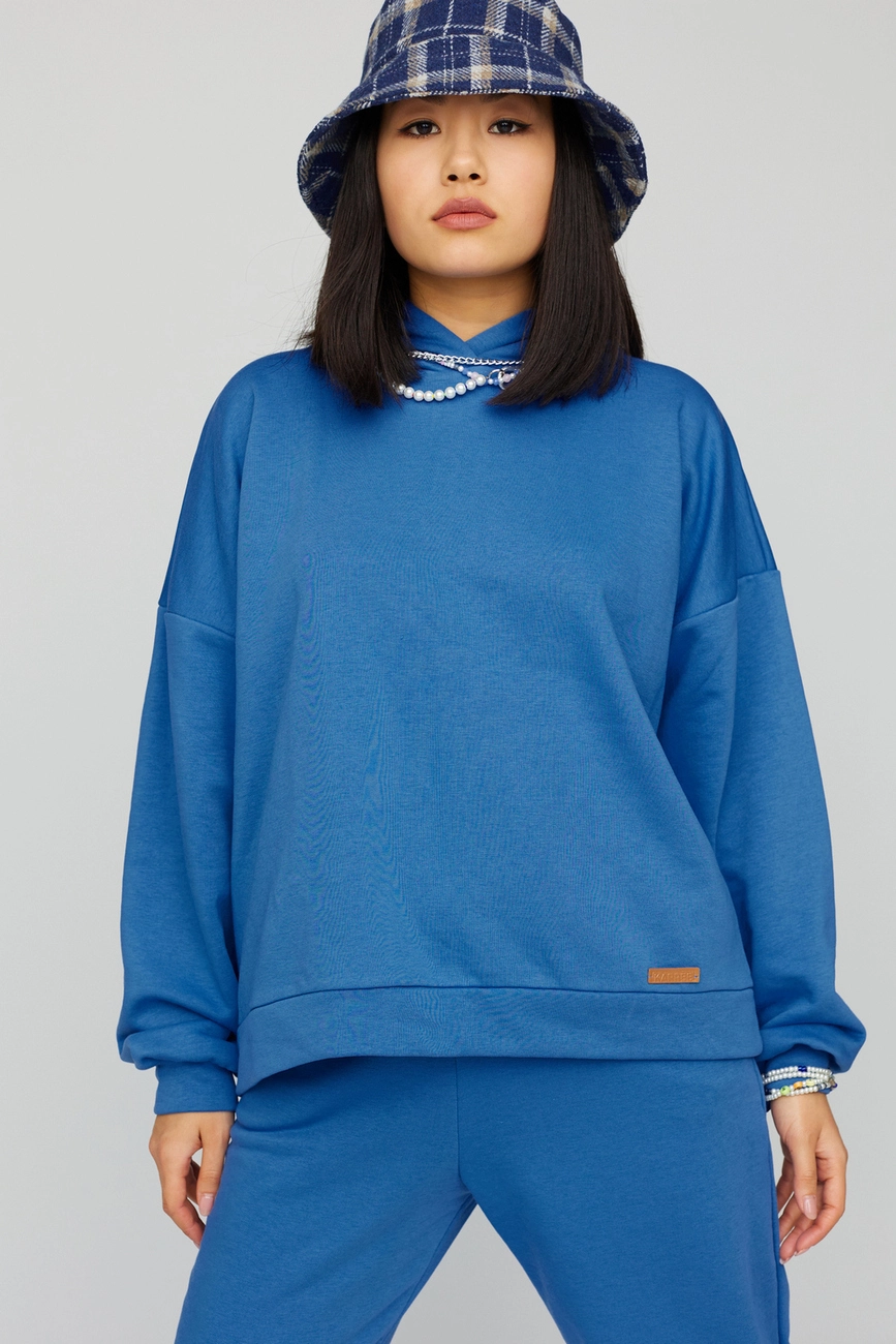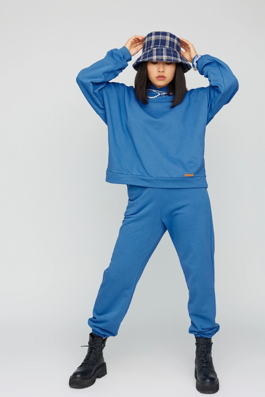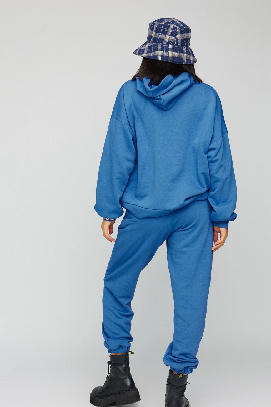 Костюм свитшот oversize плюс брюки из тянущегося плотного трикотажа с петельчатой изнанкой. Свитшот свободного кроя со спущенной линией плеча, есть капюшон; штаны прямого кроя с высокой посадкой, манжеты на резинке, в боковых швах карманы