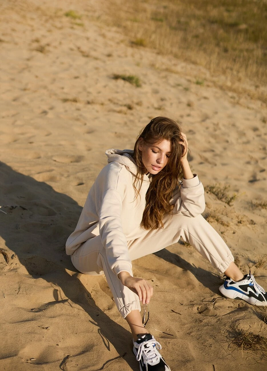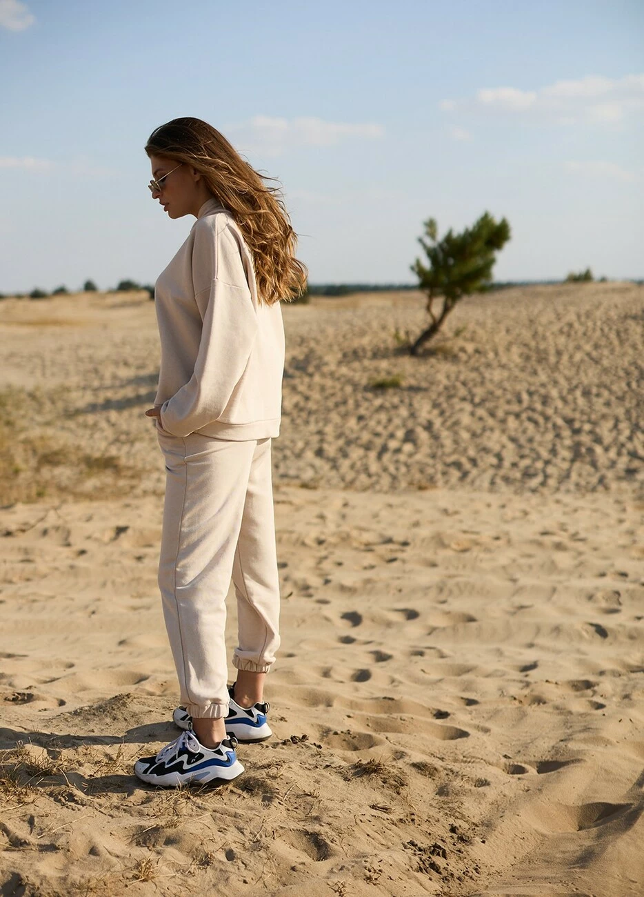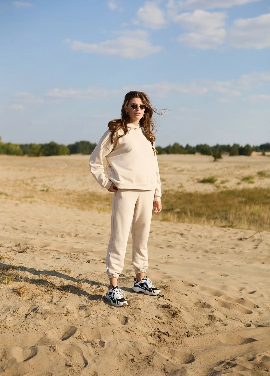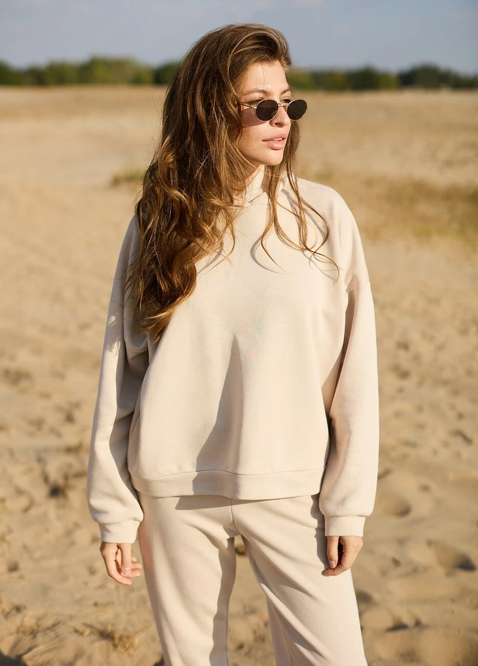 Костюм свитшот oversize плюс брюки из тянущегося плотного трикотажа с петельчатой изнанкой. Свитшот свободного кроя со спущенной линией плеча, есть капюшон; штаны прямого кроя с высокой посадкой, манжеты на резинке, в боковых швах карманы