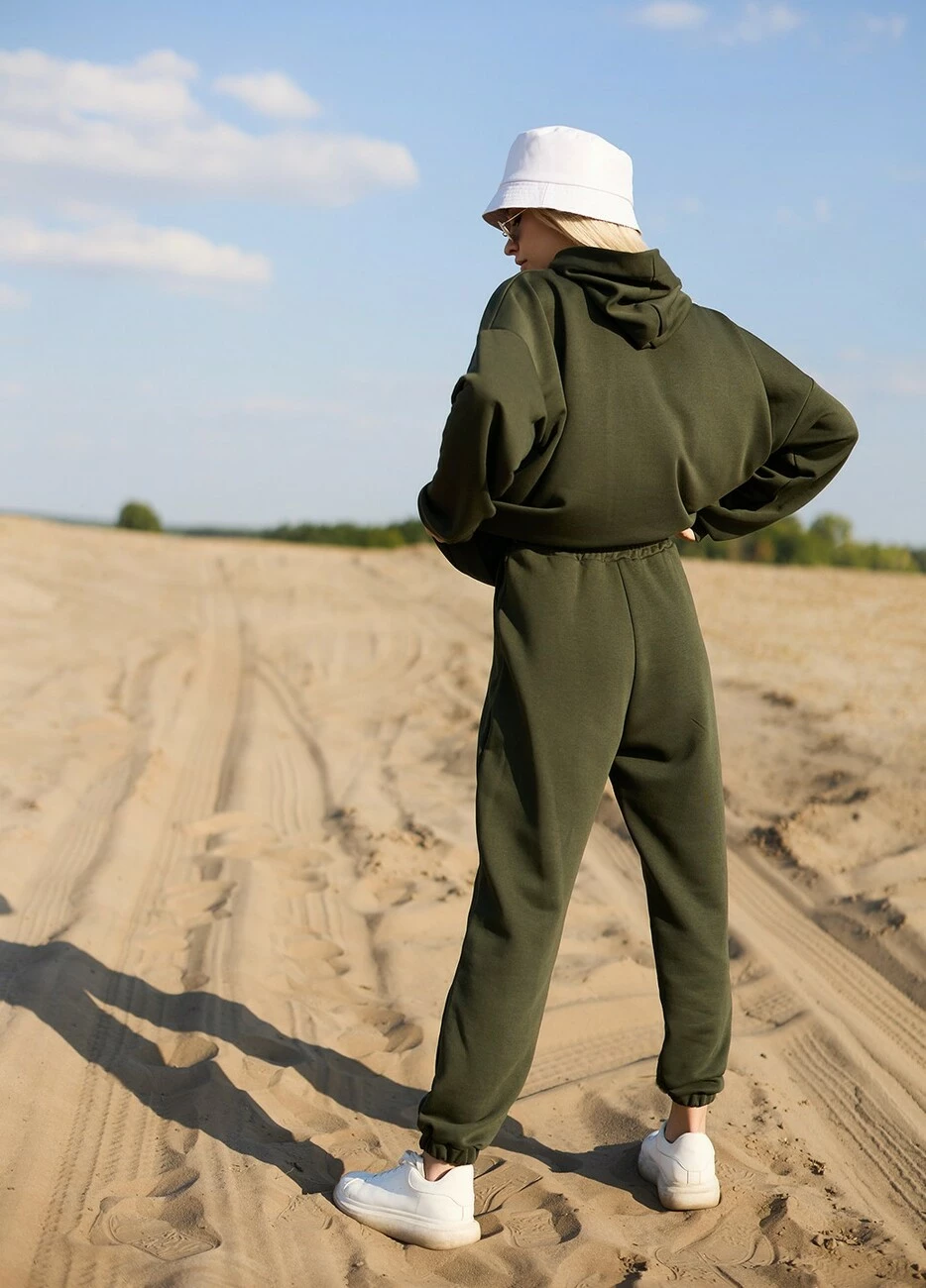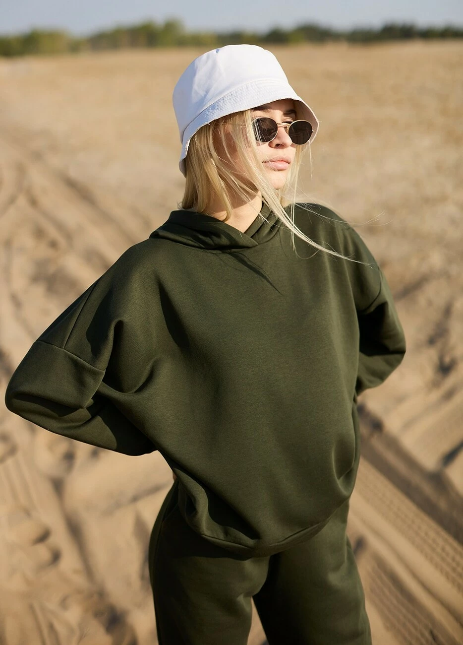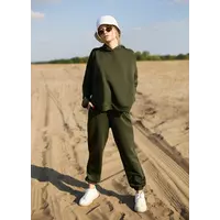 Костюм свитшот oversize плюс брюки из тянущегося плотного трикотажа с петельчатой изнанкой. Свитшот свободного кроя со спущенной линией плеча, есть капюшон; штаны прямого кроя с высокой посадкой, манжеты на резинке, в боковых швах карманы