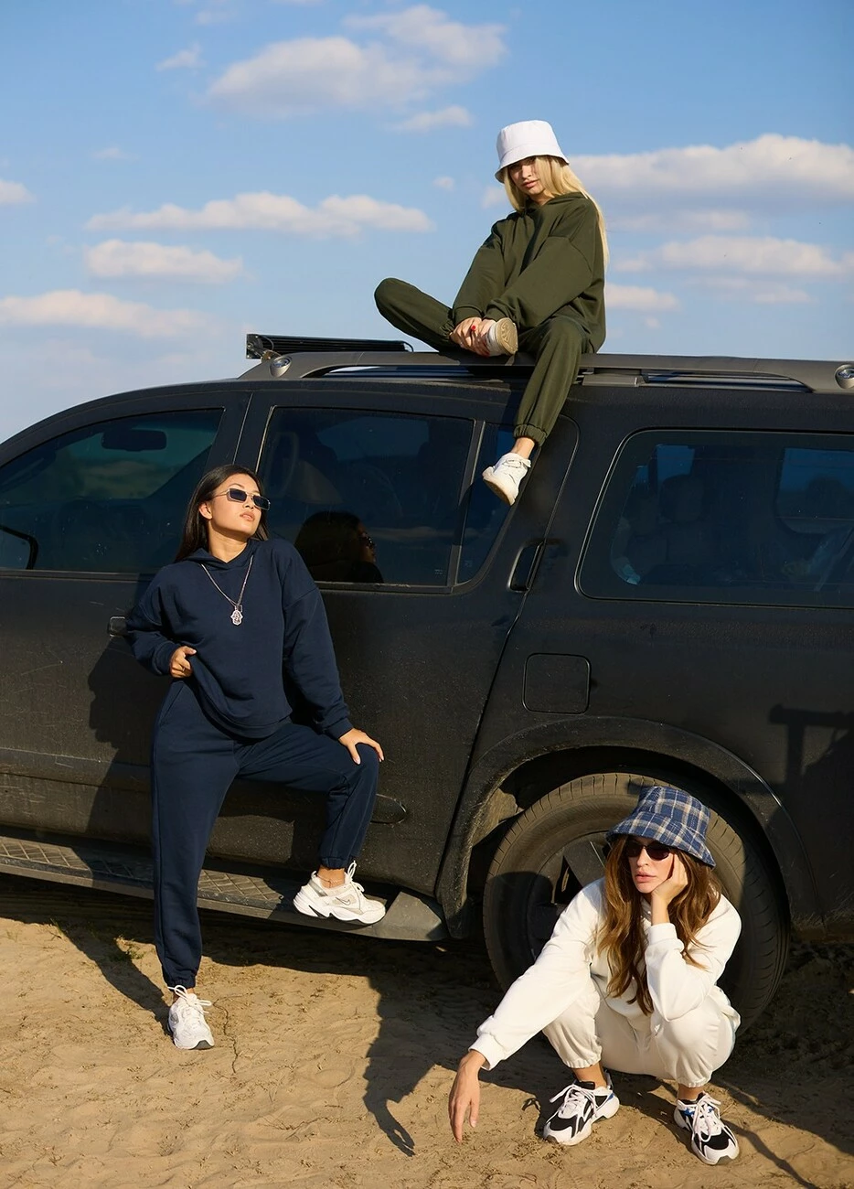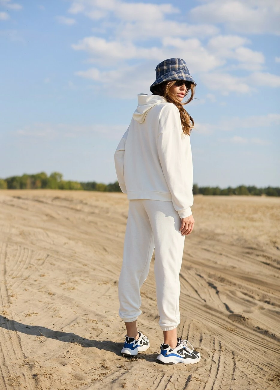 Костюм свитшот oversize плюс брюки из тянущегося плотного трикотажа с петельчатой изнанкой. Свитшот свободного кроя со спущенной линией плеча, есть капюшон; штаны прямого кроя с высокой посадкой, манжеты на резинке, в боковых швах карманы