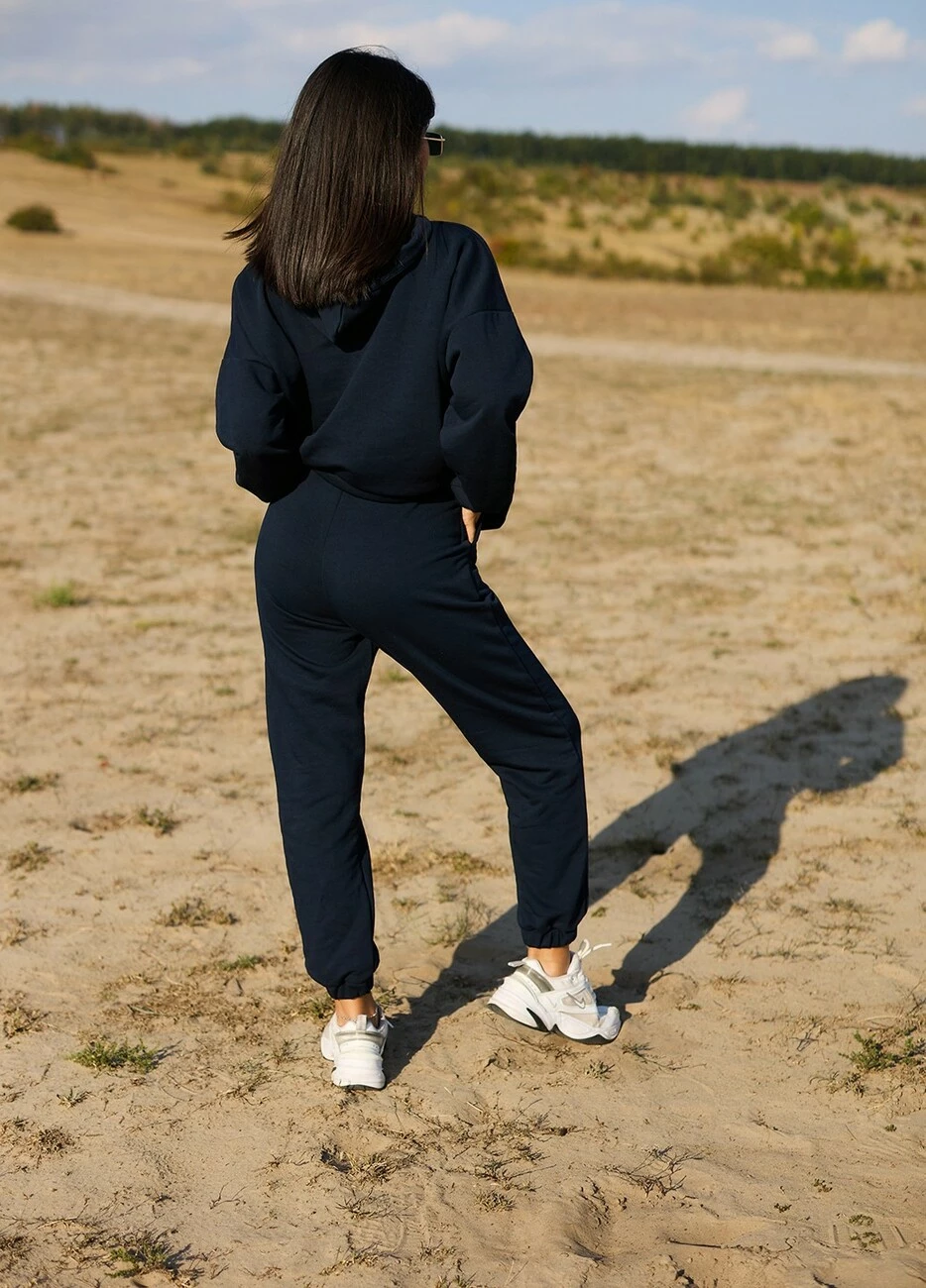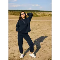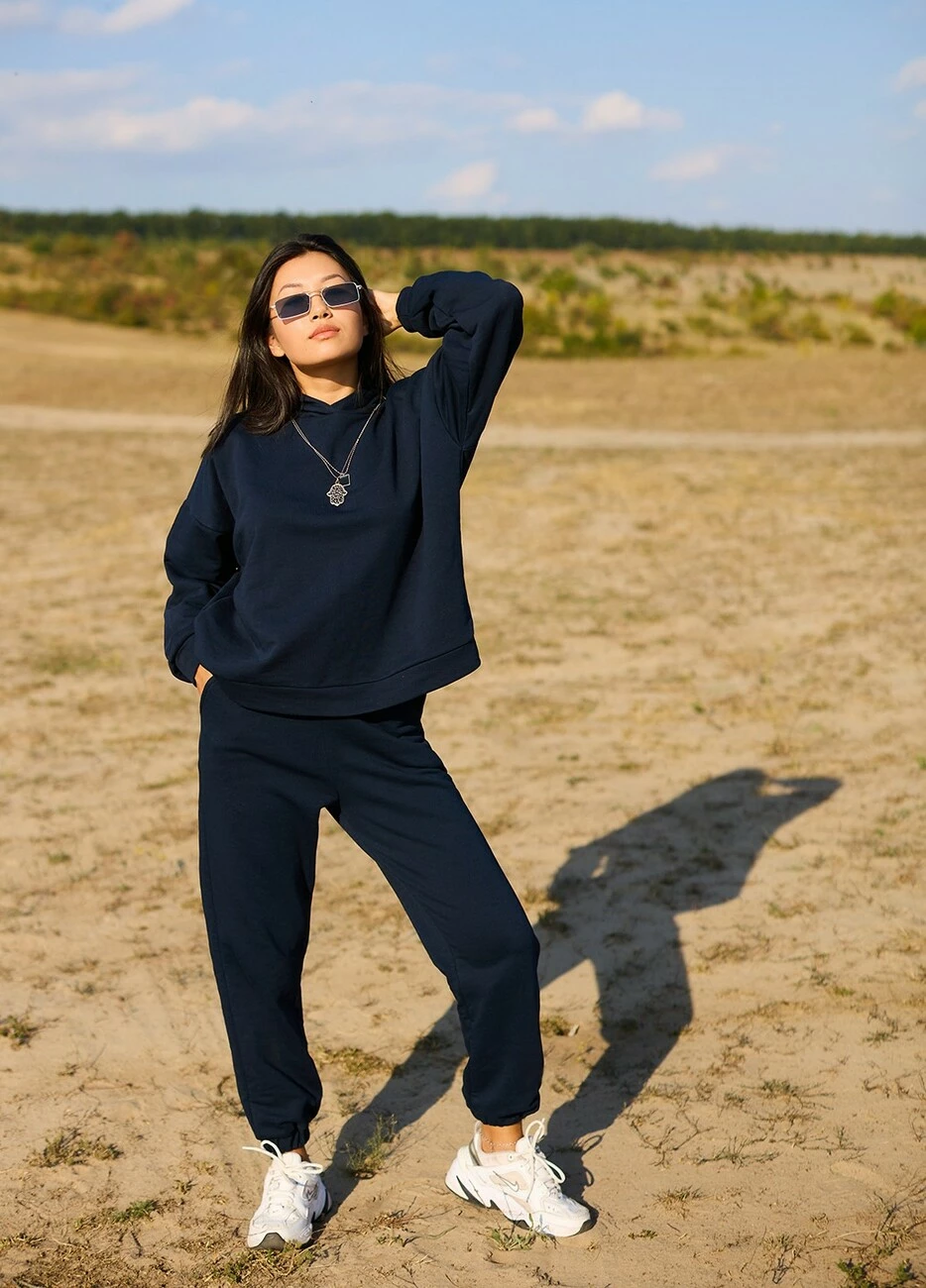 Костюм свитшот oversize плюс брюки из тянущегося плотного трикотажа с петельчатой изнанкой. Свитшот свободного кроя со спущенной линией плеча, есть капюшон; штаны прямого кроя с высокой посадкой, манжеты на резинке, в боковых швах карманы