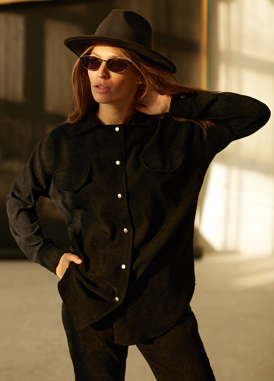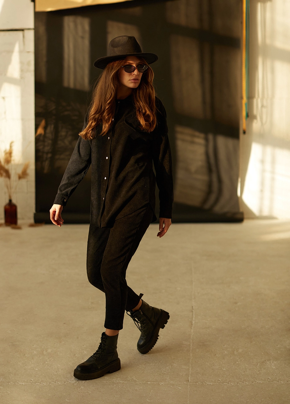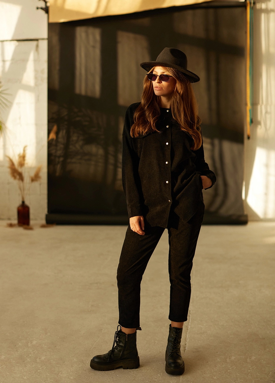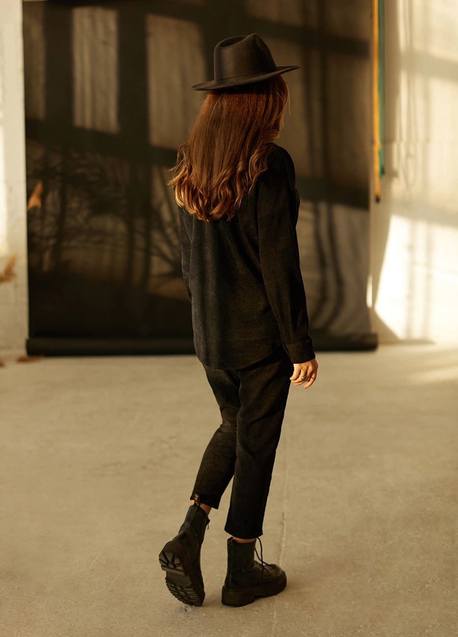 Костюм рубашка плюс брюки из вельвета. Рубашка свободного кроя с длинными рукавами, спущенная линия плеча, небольшой воротник, на рукавах и по низу изделия манжеты; застежка: кнопки. Брюки на высокой посадке кроя "бананы"; длина 7/8; карманы впереди и сзади; застежка: молния и кнопка