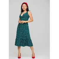 Костюм топ плюс юбка. Топ с глубоким декольте, без рукавов, застегивается по спинке на пуговицы. Юбка длины миди с резинкой в поясе и широким воланом по низу.