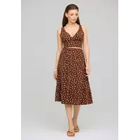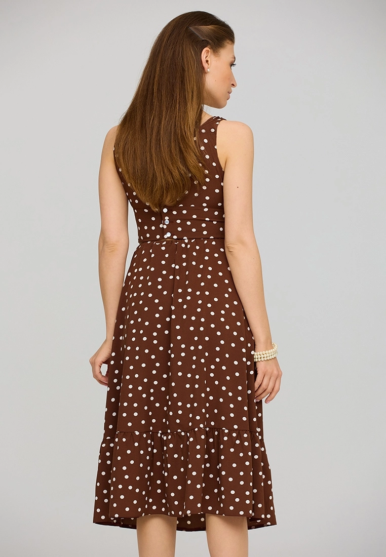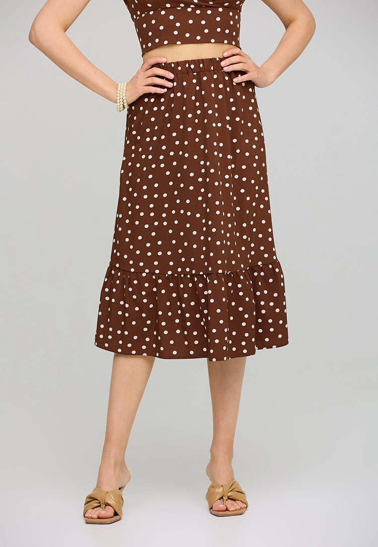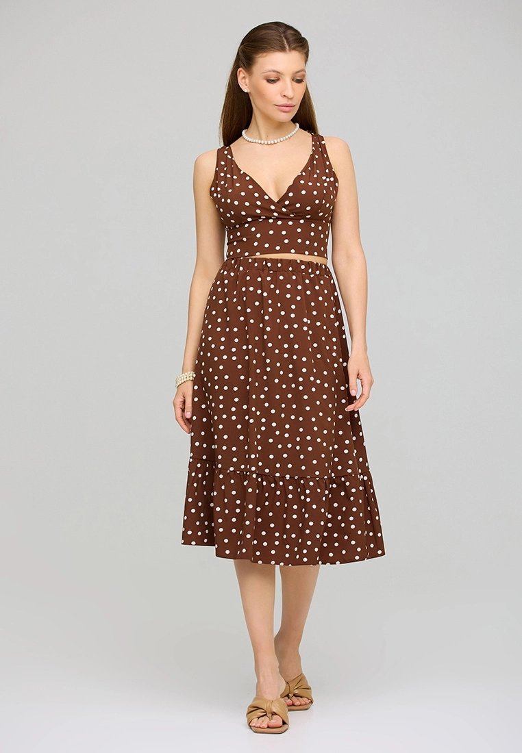 Костюм топ плюс юбка. Топ с глубоким декольте, без рукавов, застегивается по спинке на пуговицы. Юбка длины миди с резинкой в поясе и широким воланом по низу.