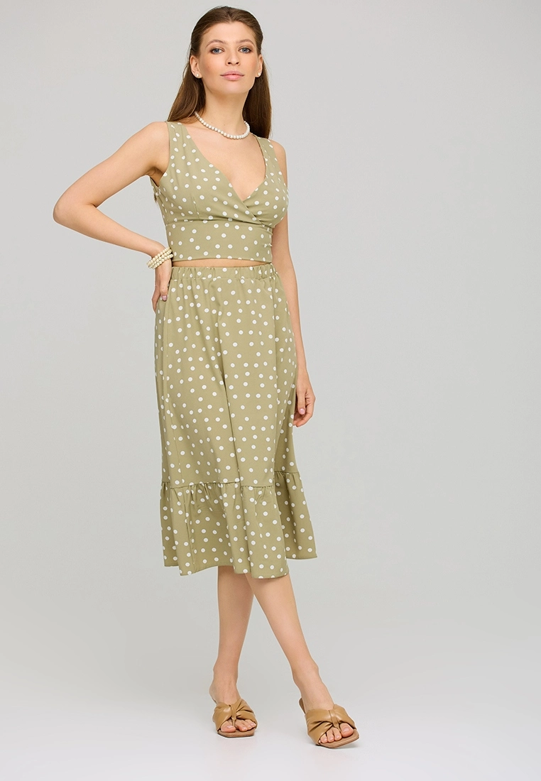 Костюм топ плюс юбка. Топ с глубоким декольте, без рукавов, застегивается по спинке на пуговицы. Юбка длины миди с резинкой в поясе и широким воланом по низу.