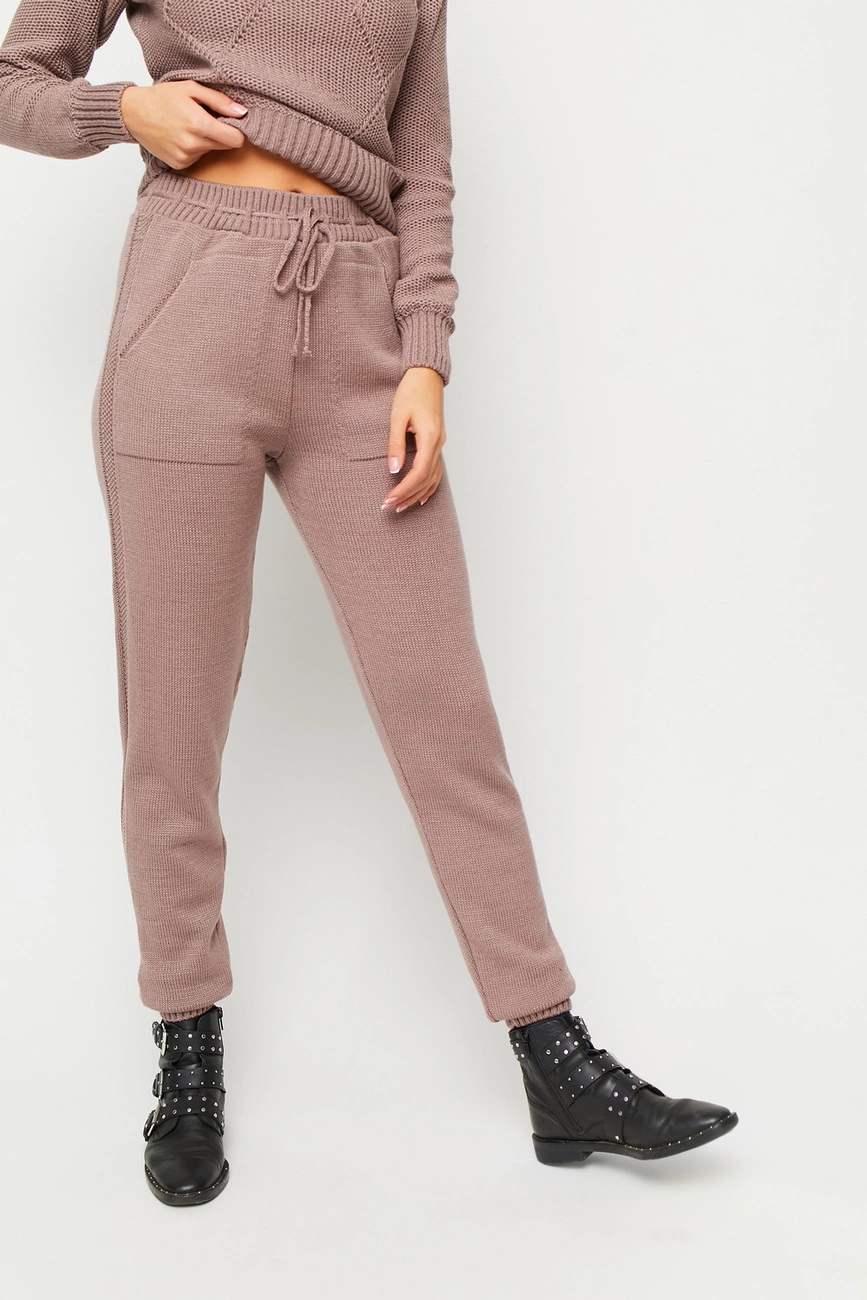Костюм свитер плюс штаны из теплого вязанного трикотажа с добавлением шерсти. Кофта с длинными рукавами с манжетами, высокий воротник-гольф, впереди узор-ромбы; штаны классической длины с манжетами внизу, пояс на резинке и кулисе, по бокам карманы
