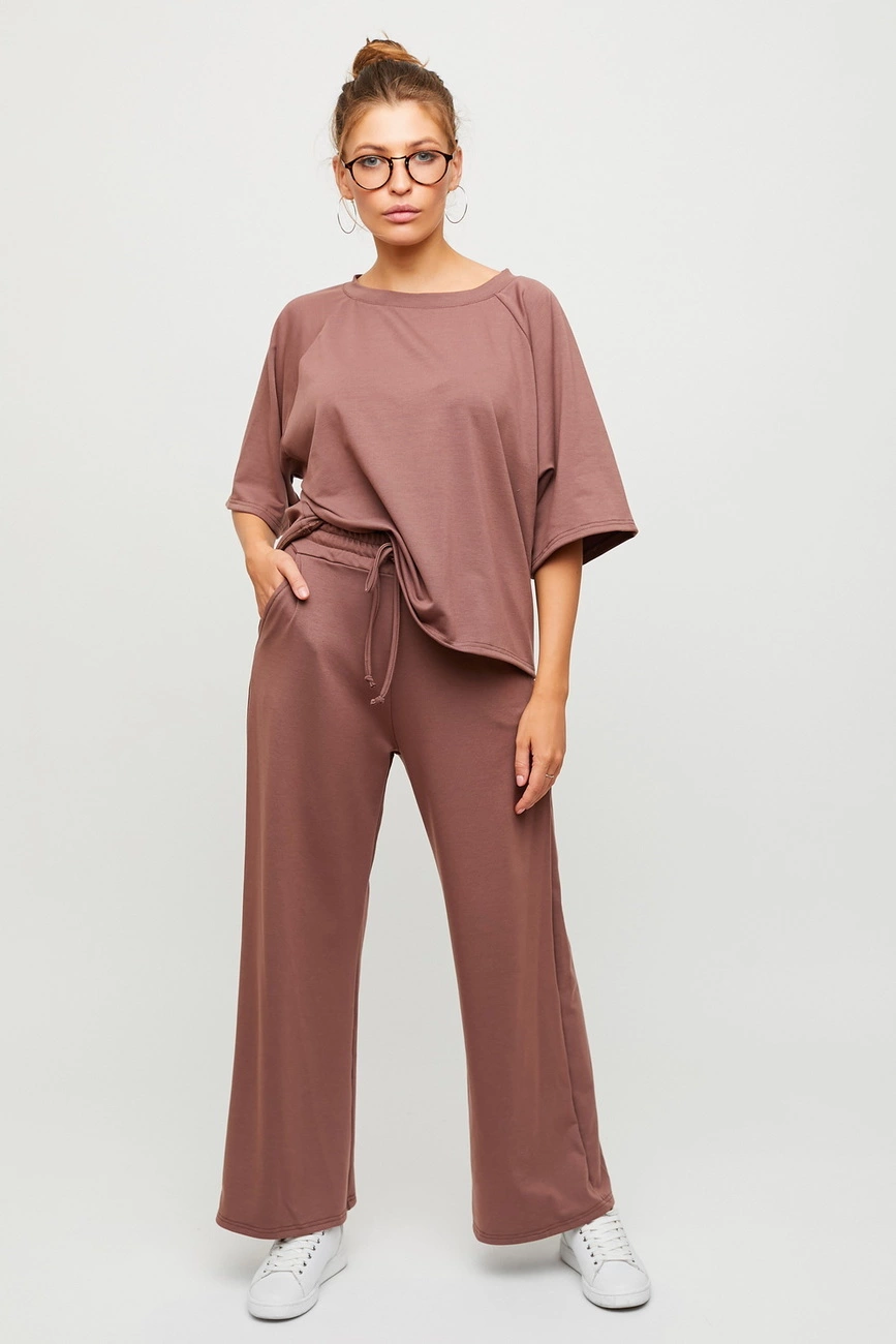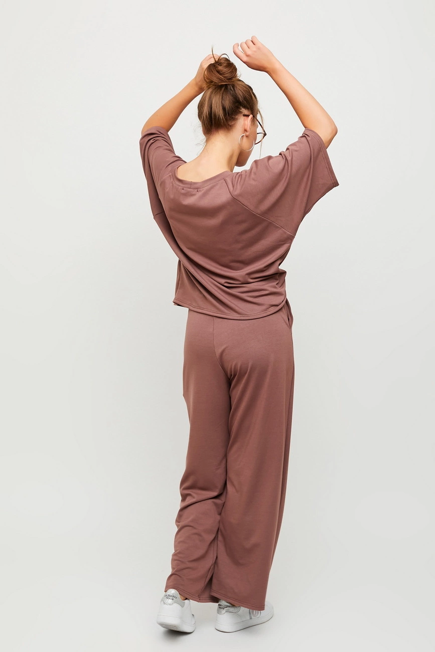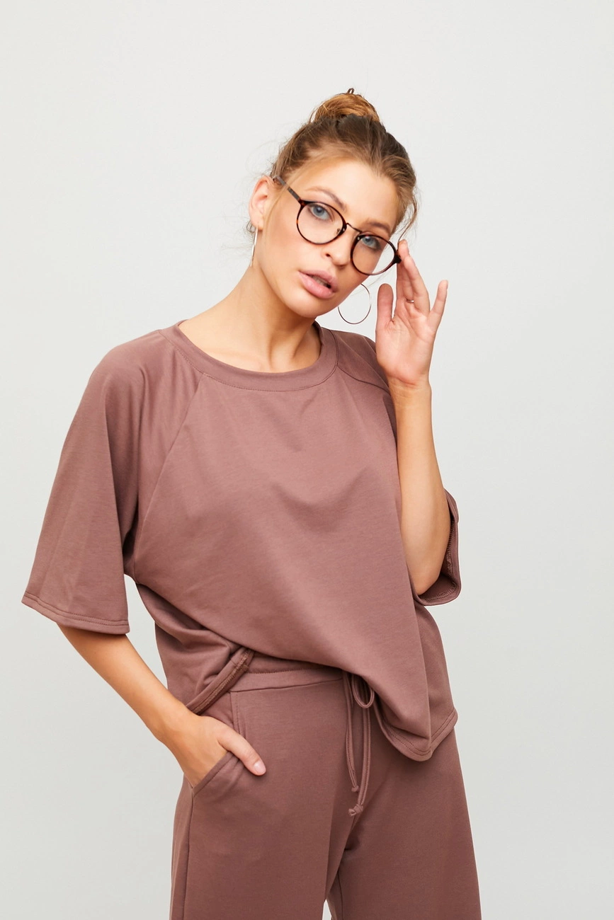 Костюм футболка oversize плюс брюки-кюлоты из слегка тянущегося трикотажа. Футболка широкая, рукав-реглан; кюлоты с высокой посадкой, пояс на резинке, карманы в боковых швах