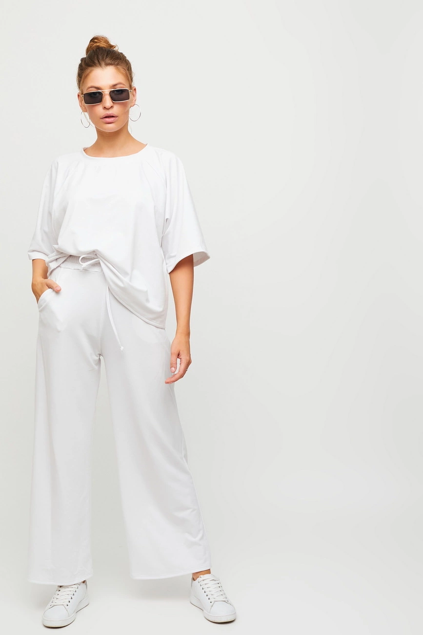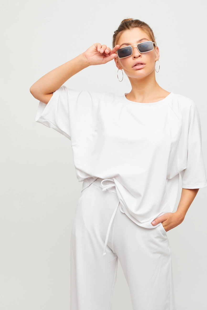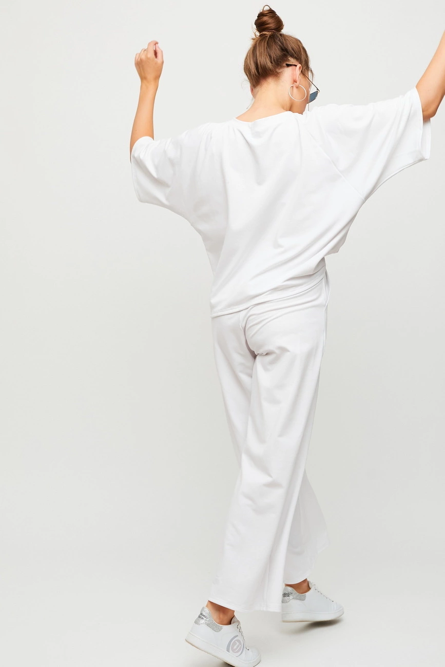 Костюм футболка oversize плюс брюки-кюлоты из слегка тянущегося трикотажа. Футболка широкая, рукав-реглан; кюлоты с высокой посадкой, пояс на резинке, карманы в боковых швах